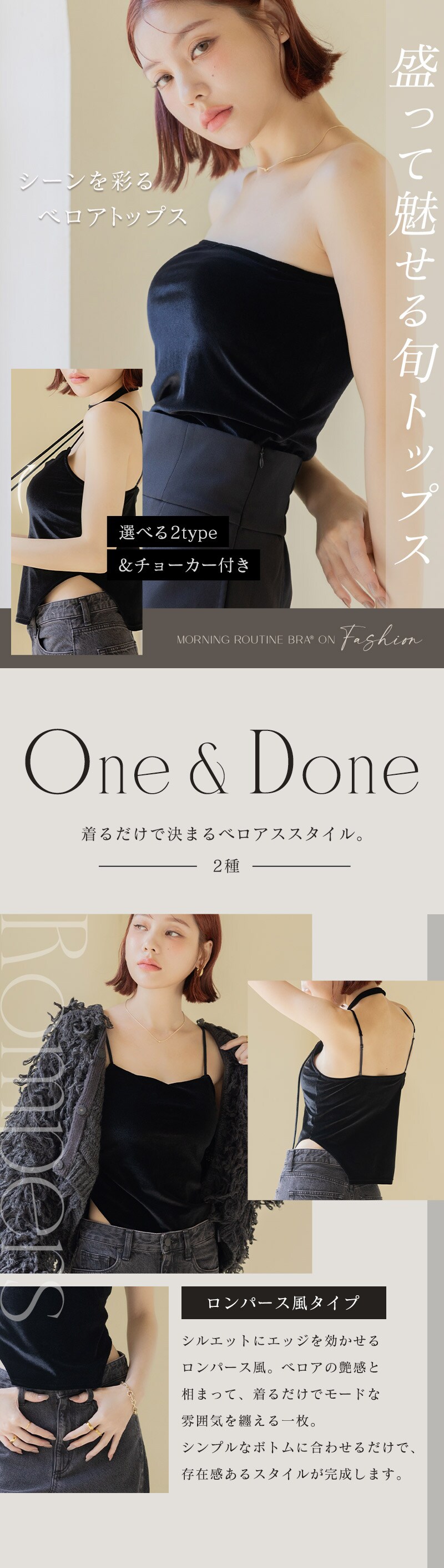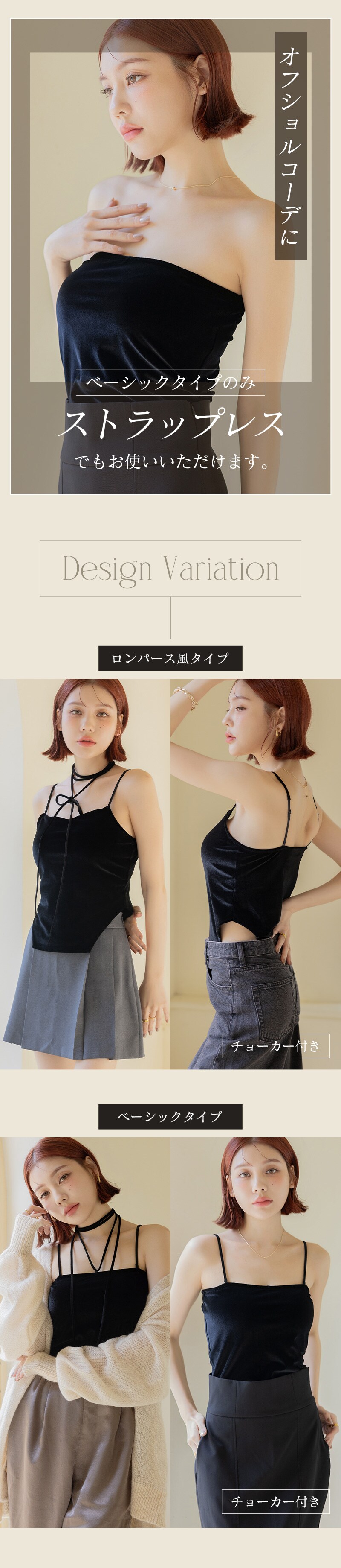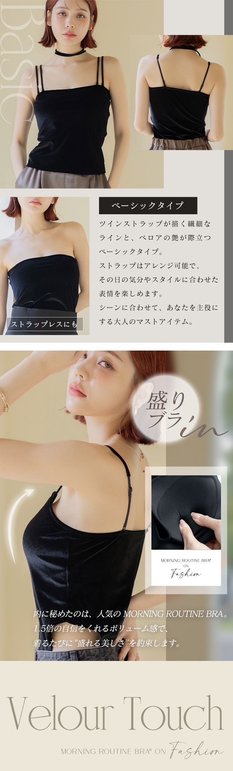 tu-hacci Inner Collection ブラトップ単品 1.5倍盛りを叶えるベロアモーニングルーティンブラトップ。 女性のボディラインを知り尽くした下着専門店のノウハウを活かして、 ノンワイヤーでも自然な丸胸をメイクする モーニングルーティンシリーズのカップを内蔵。 光沢感のあるベロア素材で上品な輝きを演出。 もっと自由にファッションを楽しむ、新しい選択肢をtu-hacciからご提案。 【こんな方におすすめ】 ・ワイヤーの窮屈感や痛いのが苦手 ・バストにボリュームが欲しいけど、胸元のチラ見えは避けたい ・ファッションアイテムとして主役にできる見せキャミがほしい ■ふっくら丸みのある1.5倍盛りシルエット ・“モーニングルーティンブラシリーズ”の盛りカップを採用 ・中央の隠しゴムが、美胸を長時間キープ ・背中までぐるりとパワーネットを搭載し、ズレにくく安心の着心地 ・ボリュームアップしつつ、サイドはスッキリとした設計 ■ファッショナブルな見せキャミ ・光沢感のあるベロア素材でコーデの主役に◎ ・付属のベロアチョーカーで首元までファッショナブルに ■チラ見え防止で視線が気にならない ・胸元高めデザインで“盛れる胸元隠し” ・前屈みになっても安心な“谷間隠し” ■選べる2デザイン ・ベーシックタイプ… シンプル設計で、コーディネートを選ばないデザイン ストラップを取り外してチューブトップとしての着用もOK ストラップレスでもずり落ちないよう、内側にシリコンゴム付き ・ロンパースタイプ… ウエストラインをすっきり見せるトレンドのデザイン 1着で華奢見え&着映え |