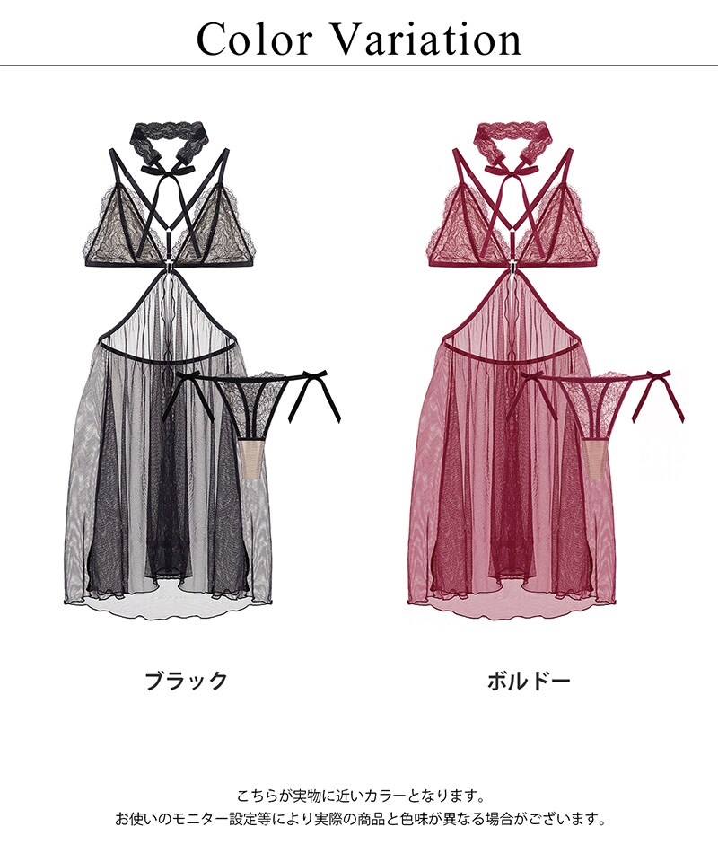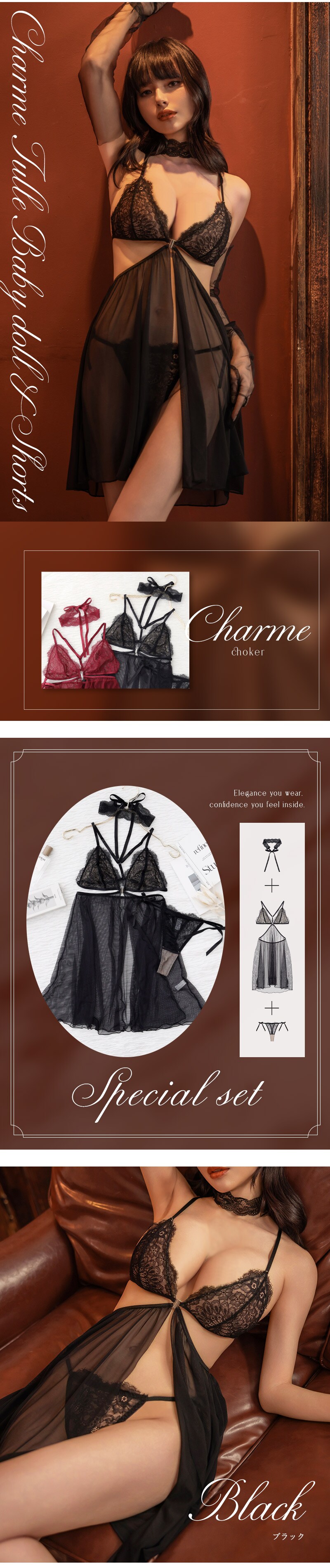 tu-hacci Baby doll&Shorts Collection ベビードール&ショーツ&チョーカー / 計3点セット ~Aduシリーズ~ 『手軽に纏えるランジェリー』をコンセプトに生まれたスタイリッシュ&ラグジュアリーなLingerieシリーズです。 女性をより美しく魅せるワンランク上のセクシーランジェリーをお届けします。 ※Aduシリーズは透け感が特徴のデザインランジェリーです。 透け感の程度は商品により異なりますので、画像をご確認ください。 ■特別な1日を演出するノンパテッドタイプ 美しさと心地よさを叶える、こだわりのディティール。 フロントホックのカップは、ほんのり素肌が透けるレース仕様。 シアーなAラインチュールは、さりげなく体型をカバーしながらボディを彩る。 ストラップ、アンダー共にアジャスター付きで、体型に合わせた調節も可能。 ■"非日常を纏う"ショーツ 専門店ならではの快適さを追求した設計とこだわりのデザイン。 センシュアルにヒップを彩る、魅惑のTバックタイプ。 フロントは透け感のある総レースで、サイドには飾りリボンをプラス。 ■さりげない甘さをスパイスに レースとサテンリボンで彩る首元は、まるでギフトのような特別感を演出。 |