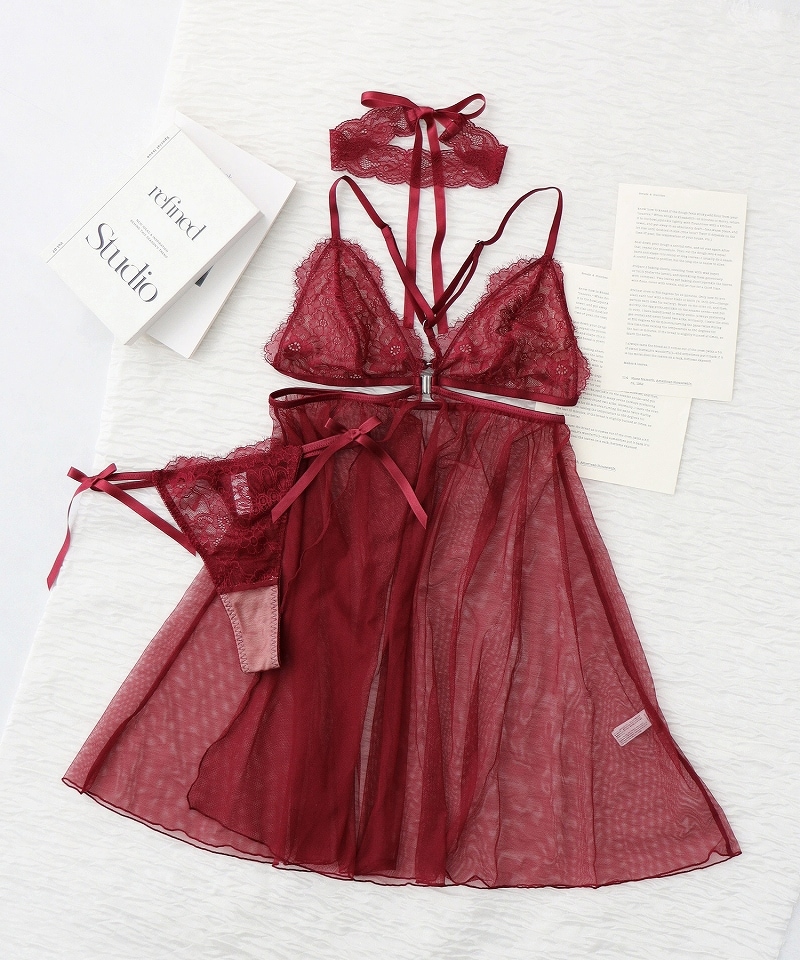 《adu》シャルムチュールベビードール&サイドリボンTバックショーツ&レースチョーカー【上下セット】【tu-hacci】 L ボルドー