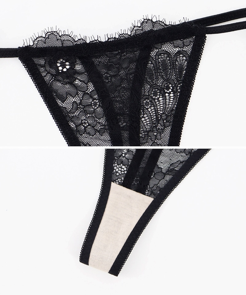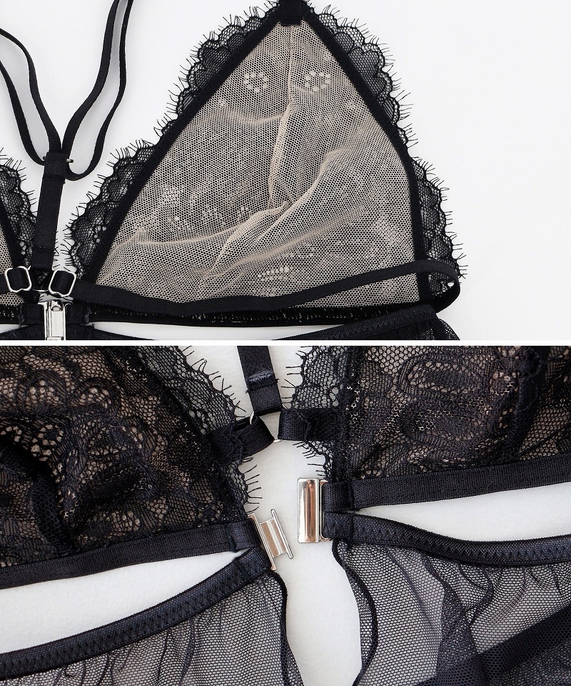 ストラップ取り外し:不可 ストラップ長さ調節:可 パッド:無 ワイヤー:無 ホック:フロントホック アンダー調節:可(アンダーゴムにアジャスターあり) 透け感:ブラ・ショーツあり |