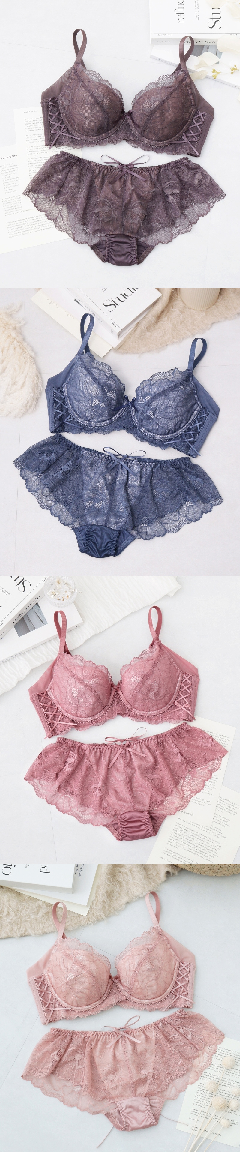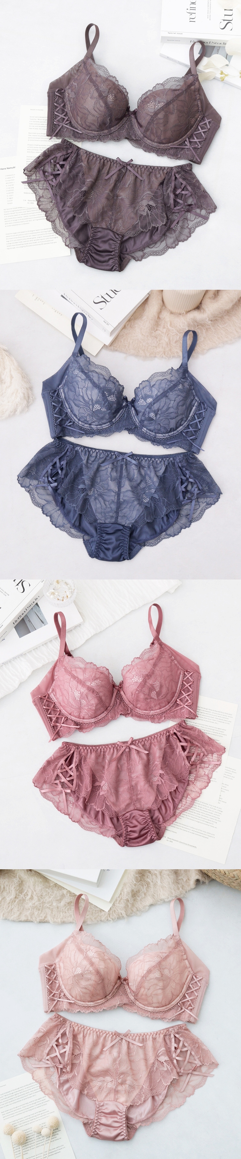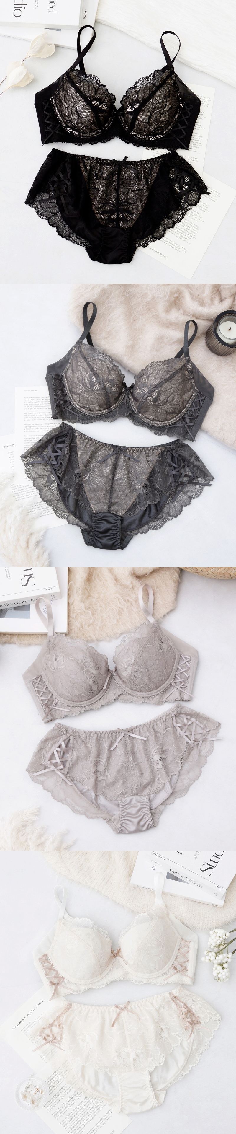 《Bra Jelly》ピオニーレースアップブラ&ショーツ【上下セット】【tu-hacci】 A75/ショーツM チャコールグレー/Bタイプ