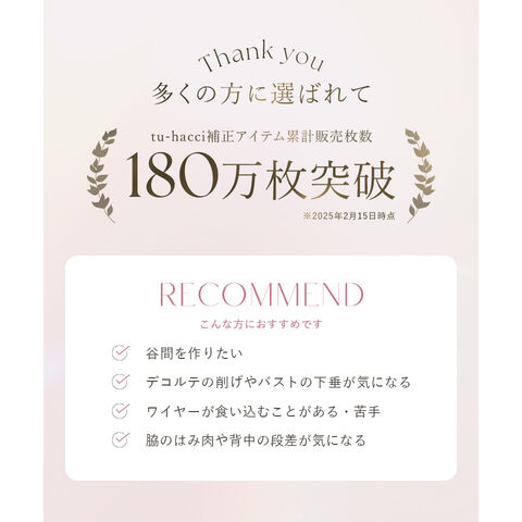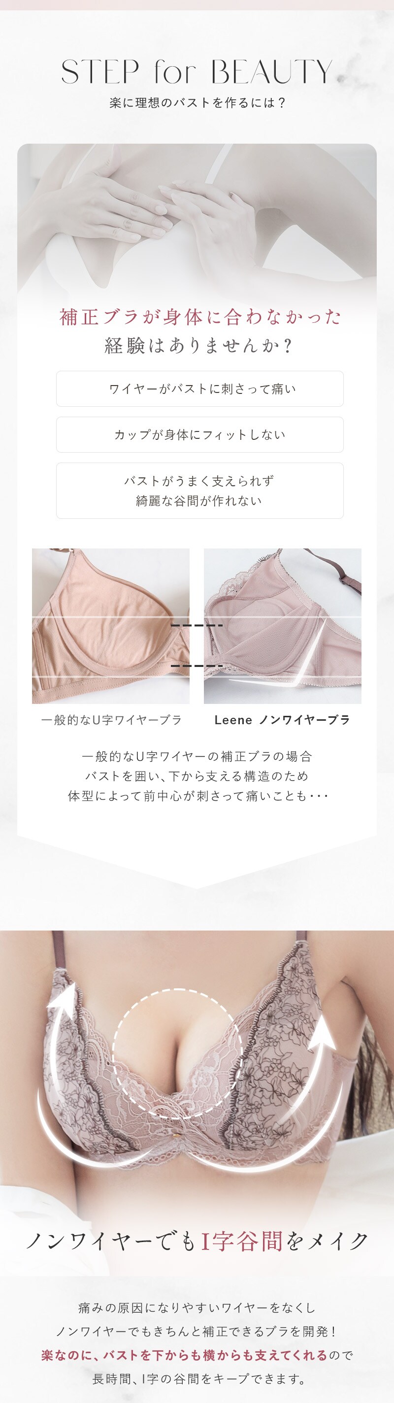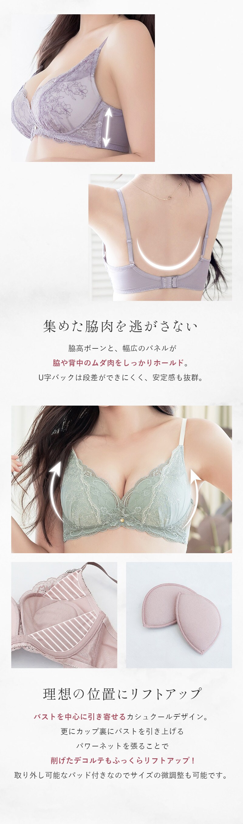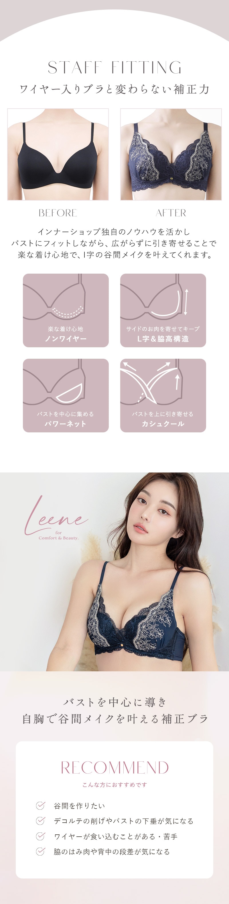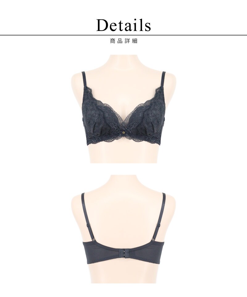 tu-hacci Bra Collection ブラ単品 痛くない脇高谷間ブラ ~Leene(リーネ)シリーズ~ ボディの持つ美しさを最大限に引き出し、自信をもたらすランジェリー。脇高設計でシルエットを整えつつ、ストレスフリーな谷間メイクを叶えるtu-hacciの補正ブラシリーズです。 洗練されたデザインと華麗なディテールが織りなす、エレガントな一着。微細な花の刺繍が胸元に優雅に舞い散る。 フロントのゴールドチャームが、特別感をプラス。 機能性にもこだわり、補正ブラとしての役割を果たしつつ、自然な谷間が生まれ魅力的なシルエットに導く。 ■「らくちんホールド」L字構造 しっかり左右からバストを寄せて、ノンワイヤーでも安定感があり長時間の着用でもストレスフリー。 ■「魅力的なI字型の谷間」パワーネット仕込みのカップ カップ裏には、ストラップに沿わせるようにパワーネットを配置。 引き上げ効果が持続し、集めた脇肉をセンターへ導きながら自然で綺麗な谷間をメイクします。 加齢によるそげ胸にお悩みの方にもおすすめ。 ■「ムダ肉を逃さずキャッチ」脇高設計&U字バック 脇高ボーンと幅広のサイドベルトが、気になる脇肉や背中の段差をすっきりフラット化。 |