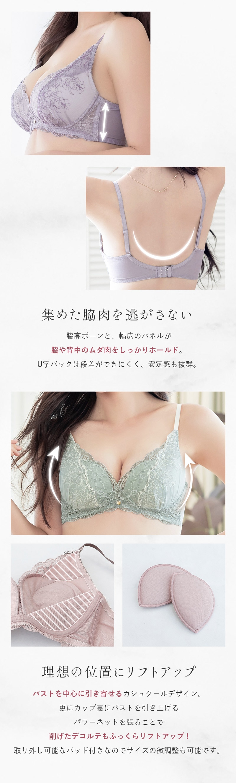 機能性にもこだわり、補正ブラとしての役割を果たしつつ、自然な谷間が生まれ魅力的なシルエットに導く。