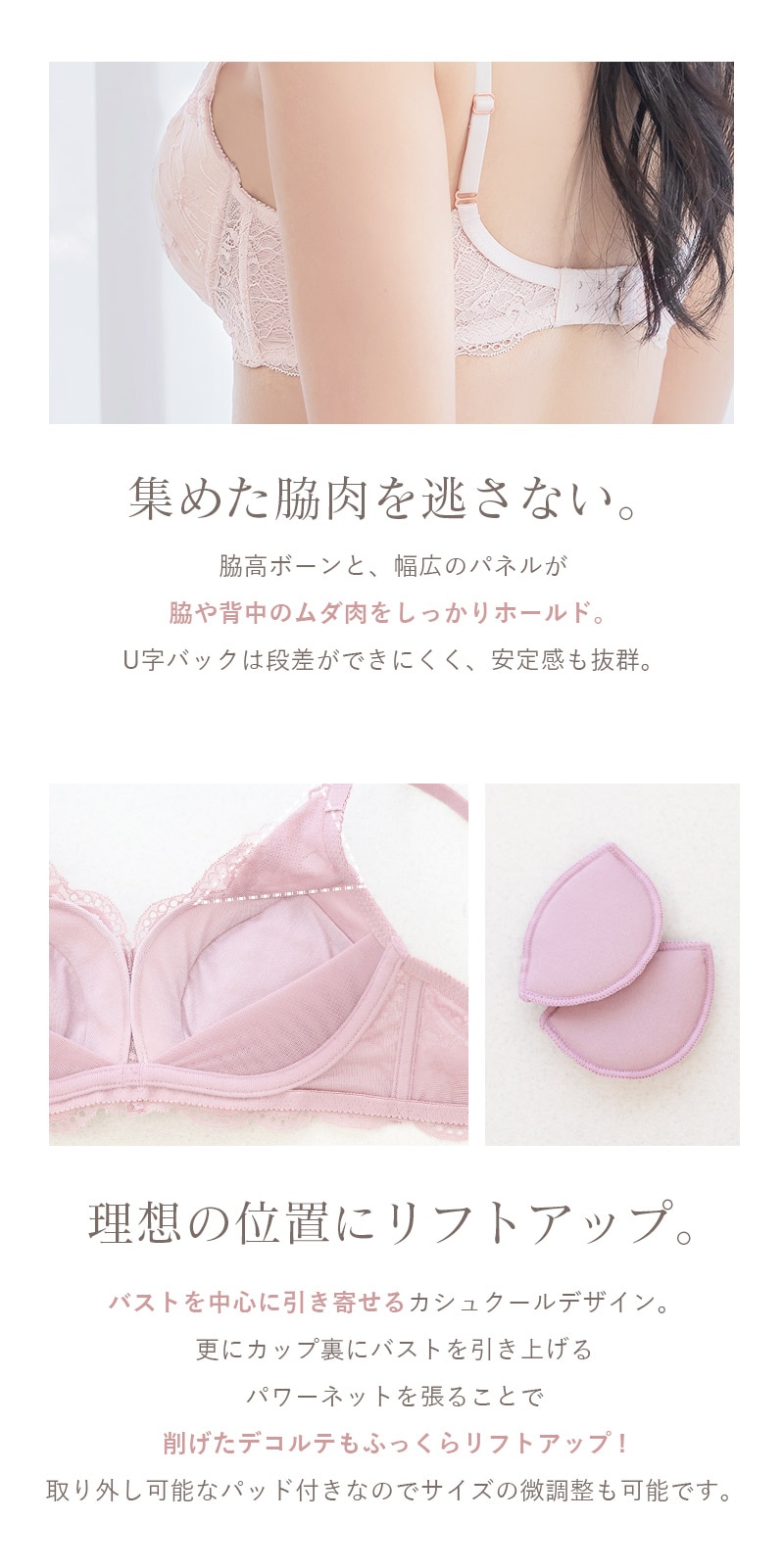 機能性にもこだわり、補正ブラとしての役割を果たしつつ、自然な谷間が生まれ魅力的なシルエットに導く。