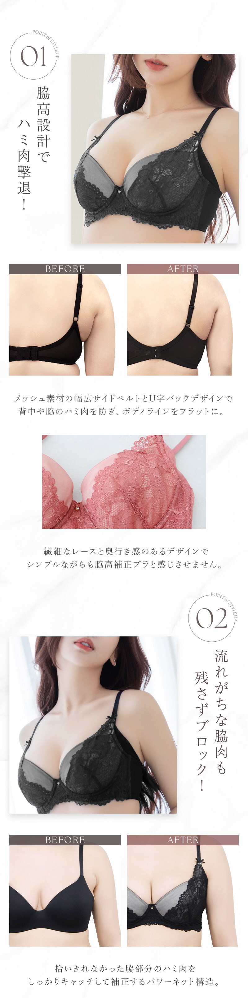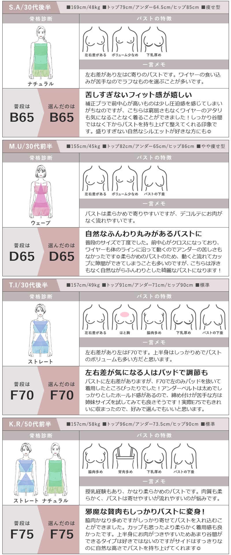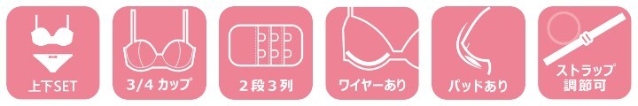 ストラップ取り外し:不可 ストラップ長さ調節:可 パッド:あり パッド取り外し:可 ワイヤー:あり ホック:2段3列 ※対応サイズは目安となり、実際の着用感には個人差がございます。 |