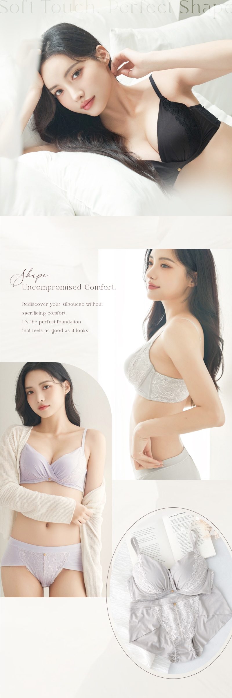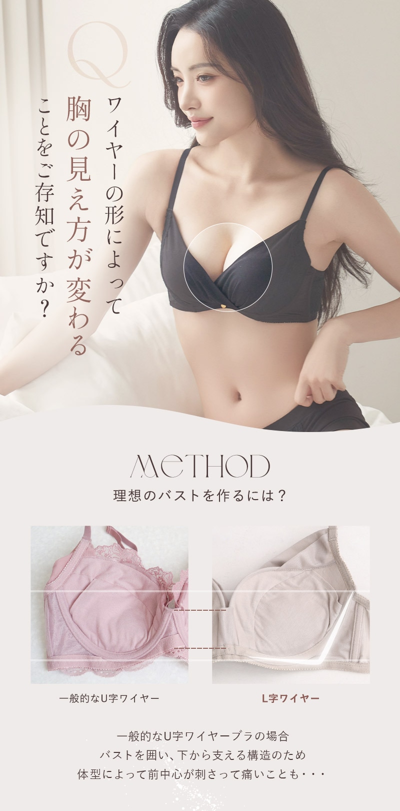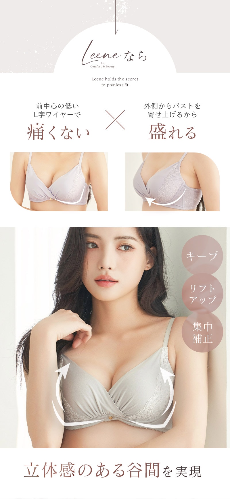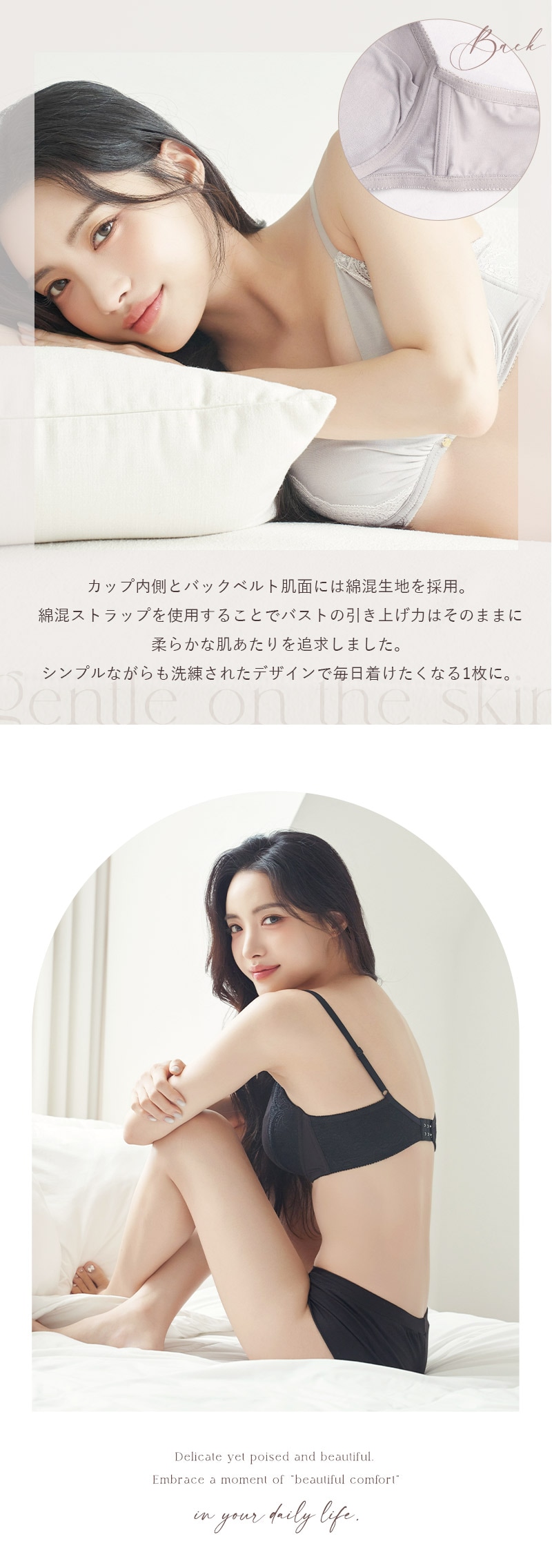 tu-hacci Bra&Shorts Collection ブラ&ショーツ / 計2点セット 痛くない脇高谷間ブラ ~Leene(リーネ)シリーズ~ 脇高設計でシルエットを整えながら、さらりと心地よく寄り添う肌あたり。 シルキータッチのなめらかさで、毎日にときめきを添える シルキーヴェールブラ。 独自のL字構造が自胸を自然に寄せて整え、立体感のある美しいバストラインへ。 思わず触れたくなるとろける質感で、心までふわりとほどける着け心地。 日常に“美しく心地いい”ひとときを。 【こんな方におすすめ】 ・谷間を自然に作りたい ・デコルテの削げ、バストの下垂が気になる ・ワイヤーブラの締め付けや食い込みが苦手 ・脇のハミ肉や背中の段差をすっきり見せたい ■「らくちんホールド」L字構造 L字のソフトワイヤーを採用。一般的な半円型ワイヤーと比べて前中心が低く、食い込まないから痛くない。 左右からバストを寄せつつ安定感があり、長時間の着用でもストレスフリー。 ■「魅力的なI字型の谷間」集めたバストをキープするカップ カップ裏には、バストを引き上げる伸びにくい生地を採用。 引き上げ効果が持続し、集めた脇肉をセンターへ導きながら自然で綺麗な谷間をメイクします。 ■「ムダ肉を逃さずキャッチ」脇高設計&U字バック 脇高ボーンと幅広のサイドベルトが、気になる脇肉や背中の段差をすっきりフラット化。 ■補正力と着心地を両立 カップ裏とバックベルト肌面には綿混生地を採用。 綿混ストラップでバストの引き上げ力はそのままに、柔らかな肌あたりを追及。 表地は天然由来のレーヨン混生地でなめらかに。 シンプルながらも洗練されたデザインは、毎日選びたくなる1枚。 ■お揃いショーツは履き心地なめらかなフルバックショーツ フロントには繊細なレースとゴールドプレートを添え、上品で女性らしい印象に。 バックはシンプルな仕様で、服に響きにくいライン設計。 足口は鼠径部を締め付けないリンパゆったり型。 ストレスフリーな履き心地は、Vラインの黒ずみ対策にもおすすめ。 |