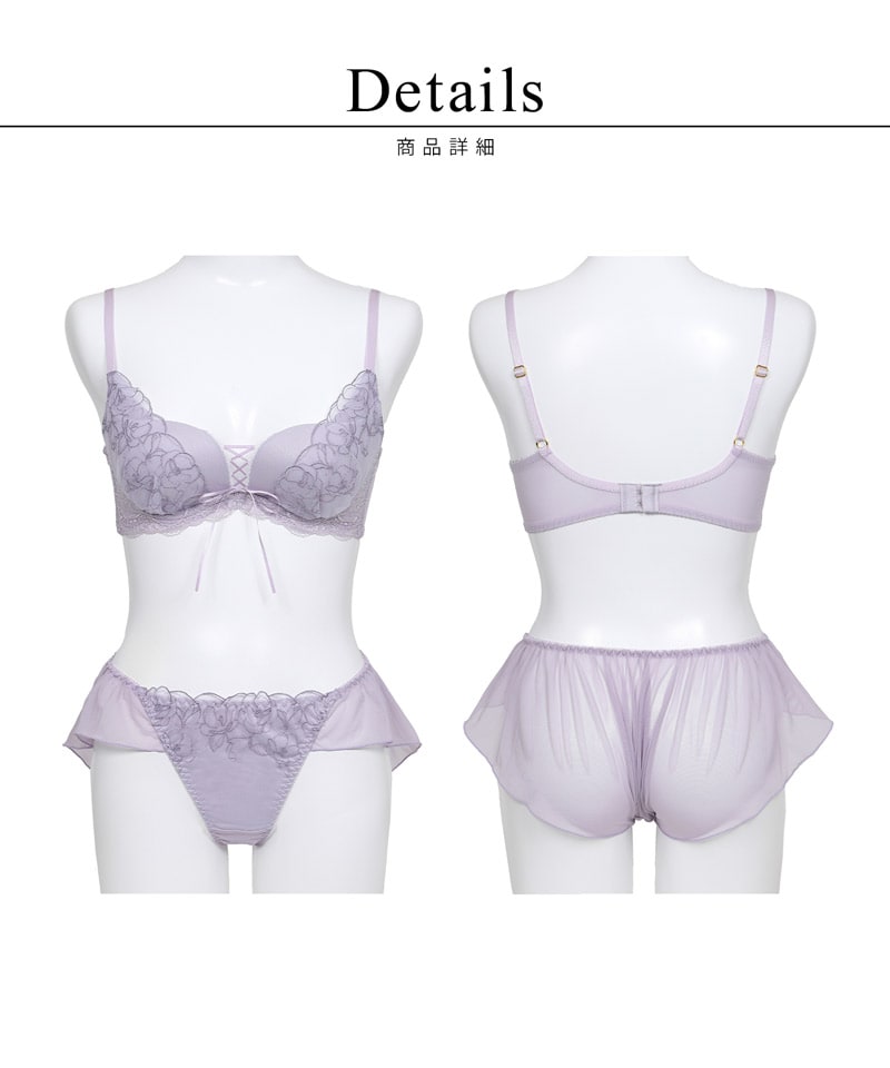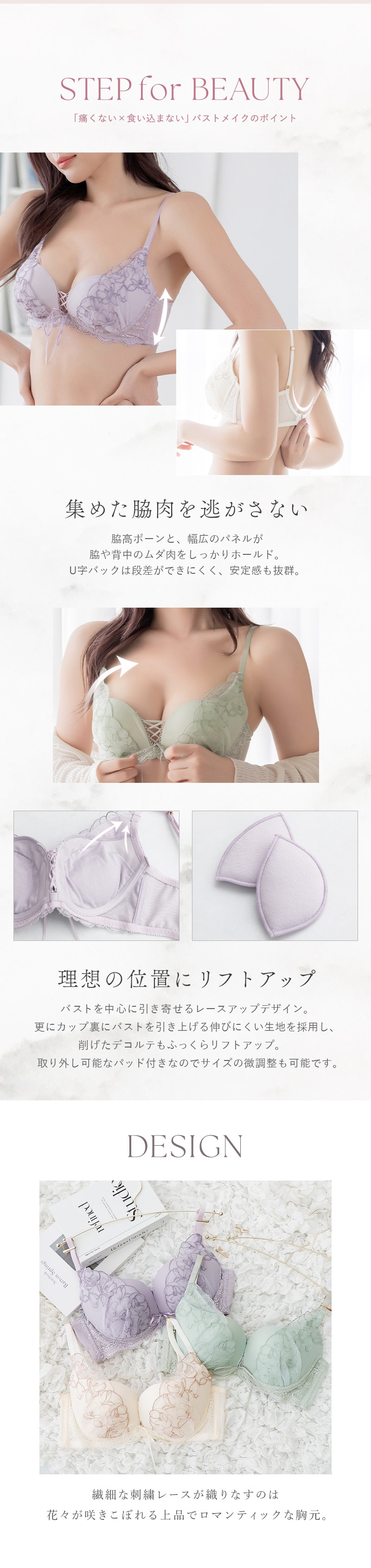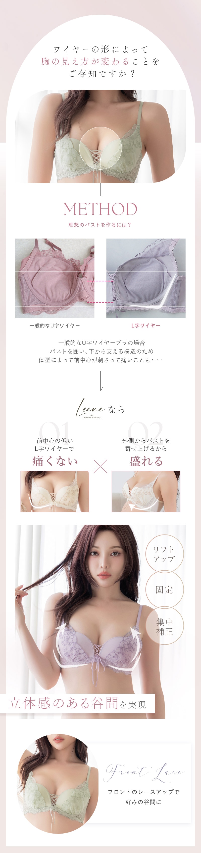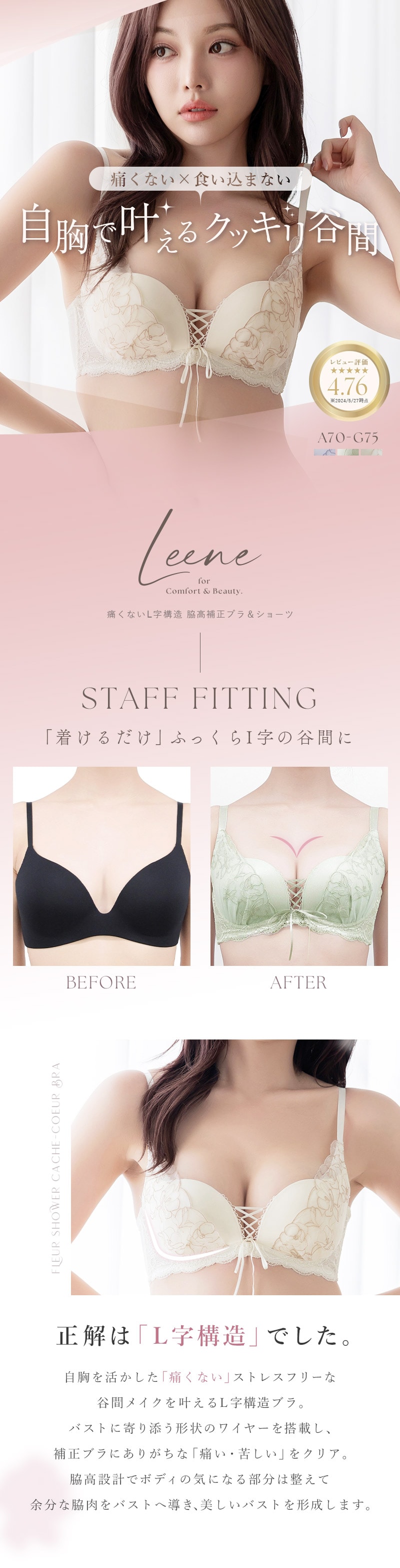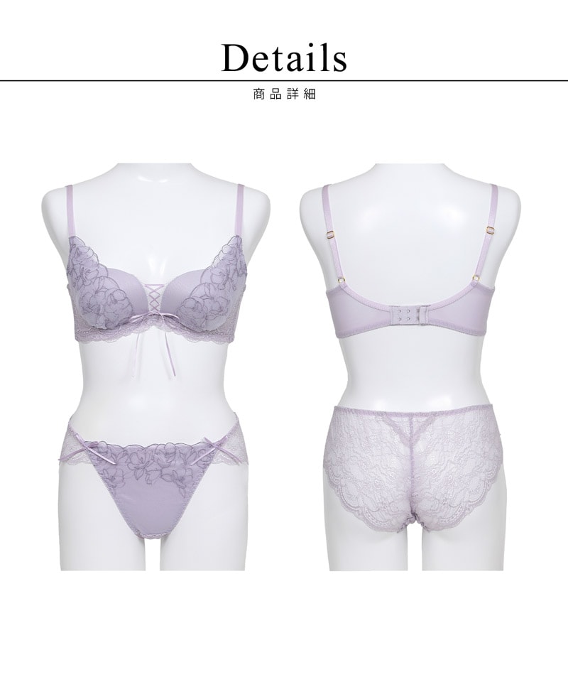 tu-hacci Bra&Shorts Collection ブラ&ショーツ / 計2点セット 痛くない脇高谷間ブラ ~Leene(リーネ)シリーズ~ 脇高設計でシルエットを整えつつ、ストレスフリーな谷間メイクを叶える補正ブラ。 マグノリアをイメージした繊細な刺繍レースが織りなすのは、花々が咲きこぼれる上品でロマンティックな胸元。 フロントのレースアップをアクセントに添えて。 ■「らくちんホールド」L字ワイヤー 一般的なU字ワイヤーと比べて前中心が低く、食い込まないから痛くない。 左右からバストを寄せつつ安定感があり、長時間の着用でもストレスフリー。 ■「魅力的なI字型の谷間」バストを中心に引き寄せるレースアップデザイン カップ裏には、バストを引き上げる伸びにくい生地を採用。 引き上げ効果が持続し、集めた脇肉をセンターへ導きながら自然で綺麗な谷間をメイクします。 加齢によるそげ胸にお悩みの方にもおすすめ。 ■「ムダ肉を逃さずキャッチ」脇高設計&U字バック 脇高ボーンと幅広のサイドベルトが、気になる脇肉や背中の段差をすっきりフラット化。 ■好みの谷間に調整可能 フロントのレースアップは手結び仕様。 お好きな高さまでリボンを通して好みの谷間に調整できます。 ■ショーツが選べる2種類の組み合わせ セットショーツはお好みのタイプをお選びいただけます。 ・Aタイプ…チュールフレアショーツ ・Bタイプ…レースバックショーツ |