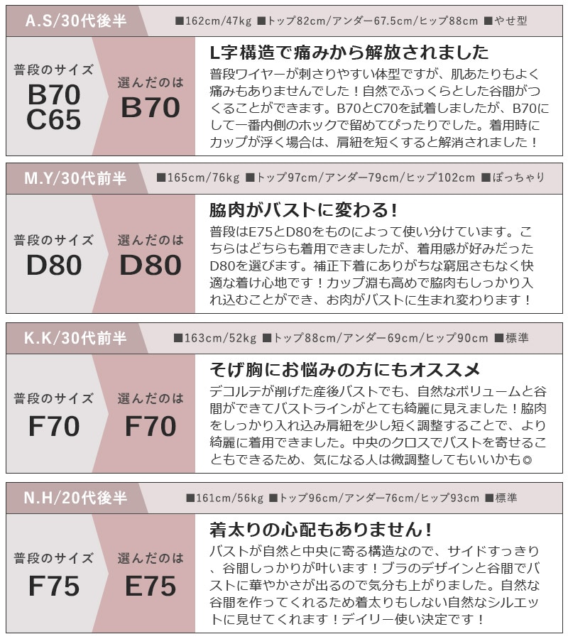 ストラップ取り外し:不可 ストラップ長さ調節:可 パッド:あり パッド取り外し:可 ワイヤー:あり ホック:2段3列 |
