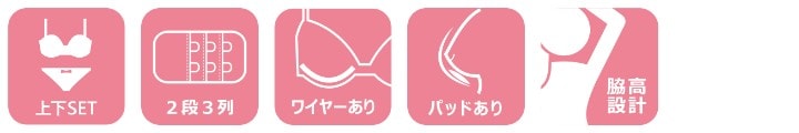 | ストラップ取り外し:不可 ストラップ長さ調節:可 パッド:有り パッド取り外し:可 ワイヤー:有 ホック:2段3列 透け感:Bタイプショーツのみバックあり 素材:ナイロン、ポリエステル、その他 |