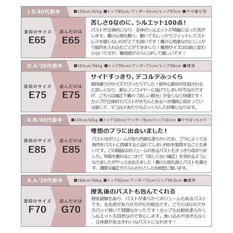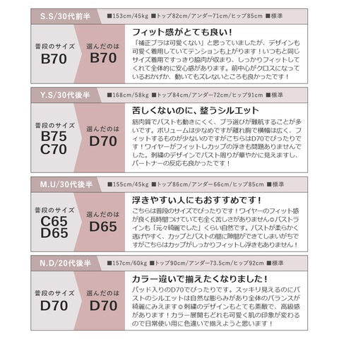 | A70/ショーツM A75/ショーツM A75/ショーツL B65/ショーツM B70/ショーツM B75/ショーツM B75/ショーツL B80/ショーツL C65/ショーツM C70/ショーツM C75/ショーツM C75/ショーツL C80/ショーツL D65/ショーツM D70/ショーツM D75/ショーツM D75/ショーツL D80/ショーツL ※一部のカップでショーツサイズがお選びいただけます。 上記以外の組み合わせはお選びいただけませんのでご了承ください。 |