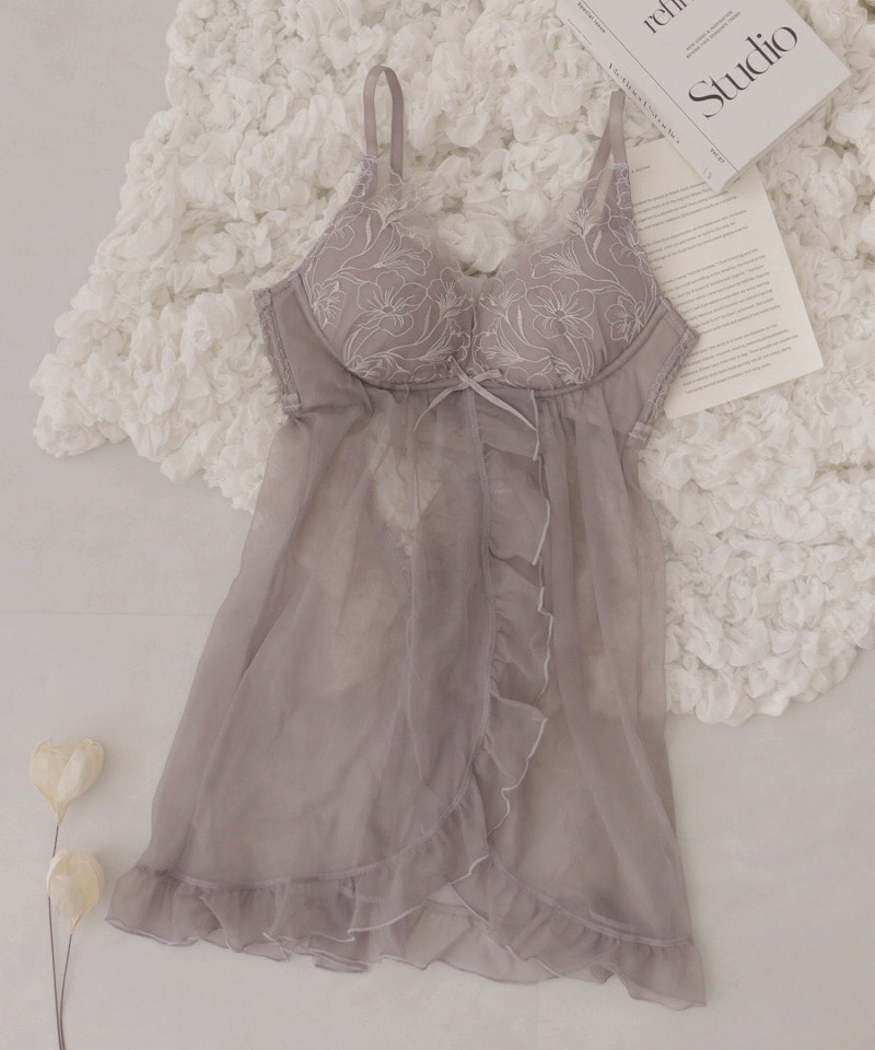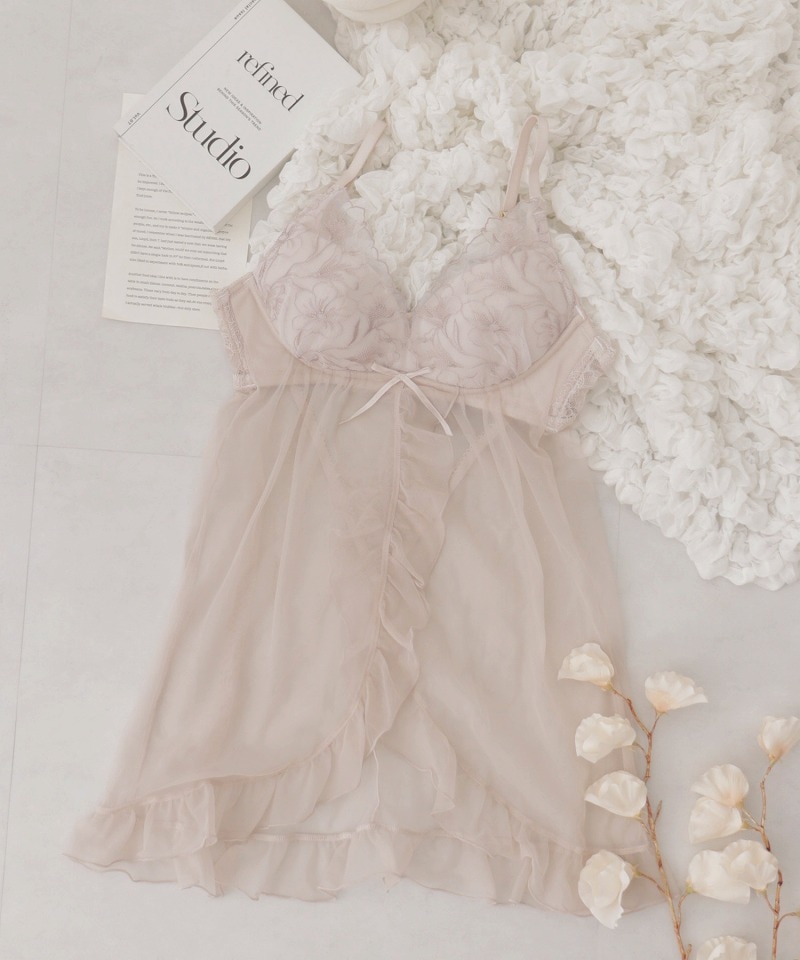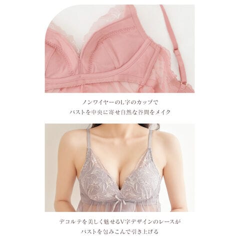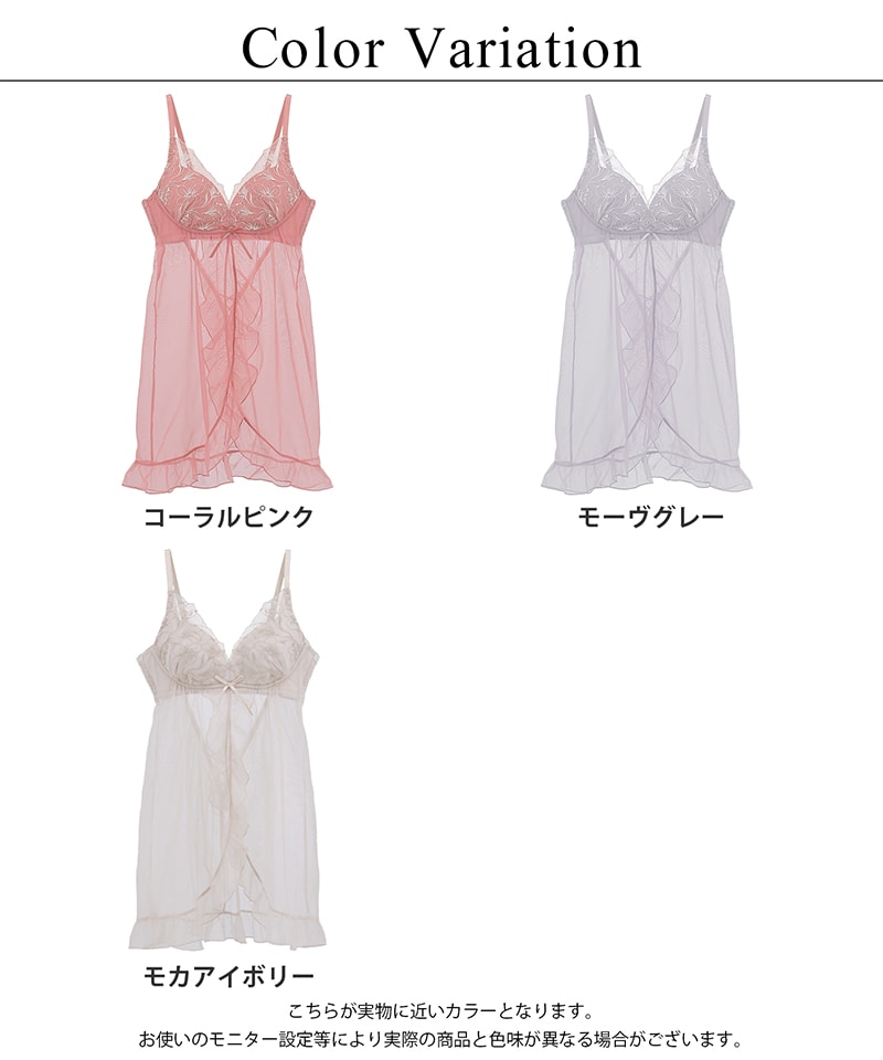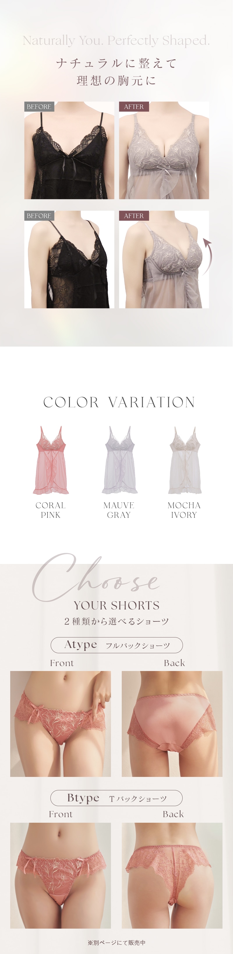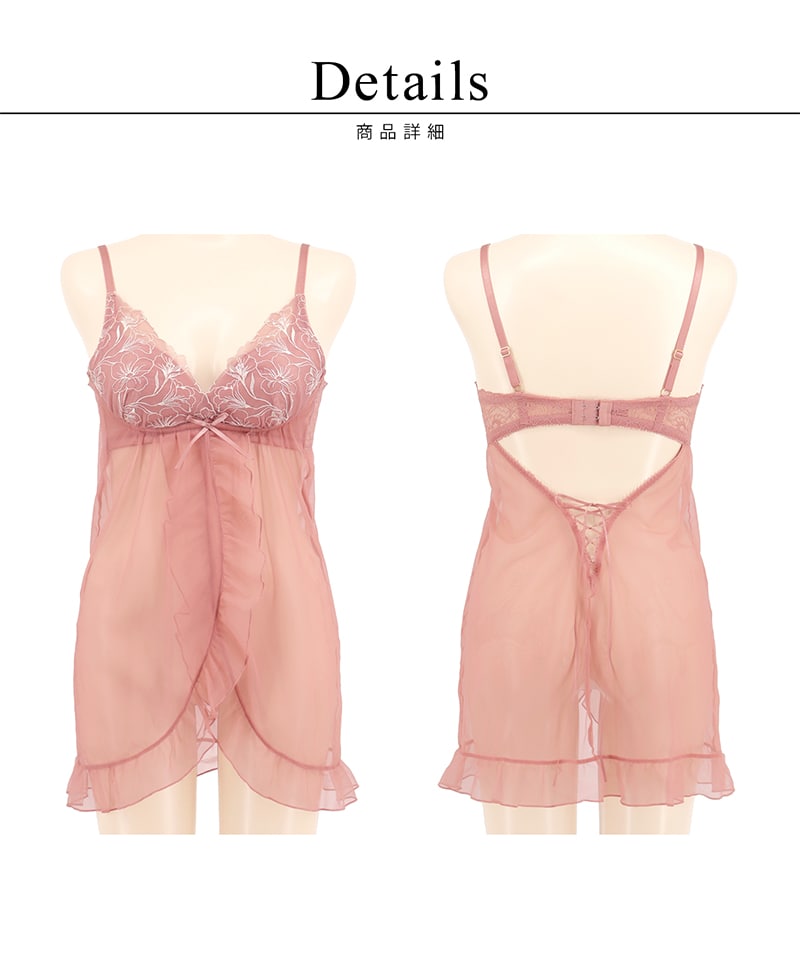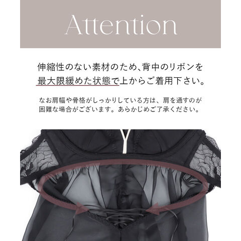 tu-hacci Baby doll Collection ベビードール単品 裾にあしらった波打つフリルが甘さを最大限に引き出す。 全体的なシアーな透け感で、ボディをより美しくアピール。 バックのウィンドウとレースアップがちょっぴりスパイシー。 バックスタイルもこだわりぬいたベビードールは360度どこから見られても◎ ■肩紐とアンダー調節可能 ベビードールでは珍しいホック付き。 肩紐とホックの微調節でバスト位置を高く保ち、より美しいシルエットに。 ■気分によって使い分けることも可能 レース部分は補正ブラに見えない脇肉撃退ブラ~BraJelly(ブラジェリー)シリーズ~の「シャンテレースブラ」と同じフラワーレースを採用。 同レースのショーツをお持ちの場合、その日の気分や服装に合わせてコーディネート可能です。 ※伸縮性のない素材のため、背中のリボンを最大限緩めた状態で上からご着用下さい。 なお肩幅や骨格がしっかりしている方は、肩を通すのが困難な場合がございます。 予めご了承ください。 |