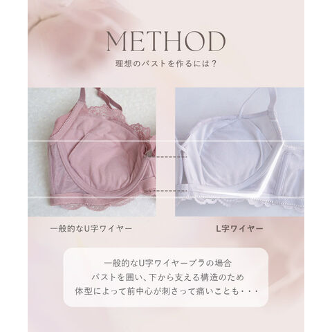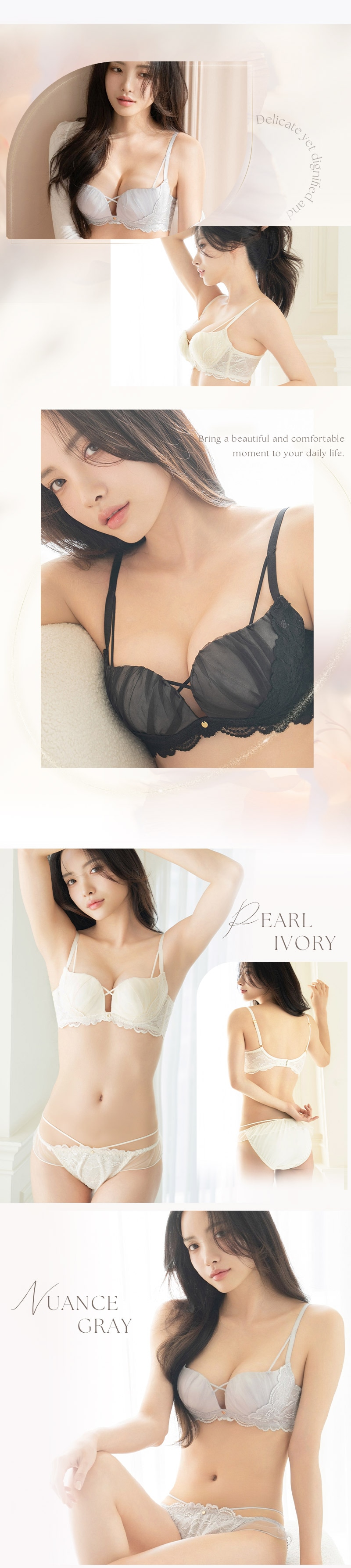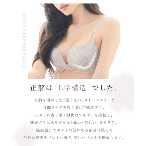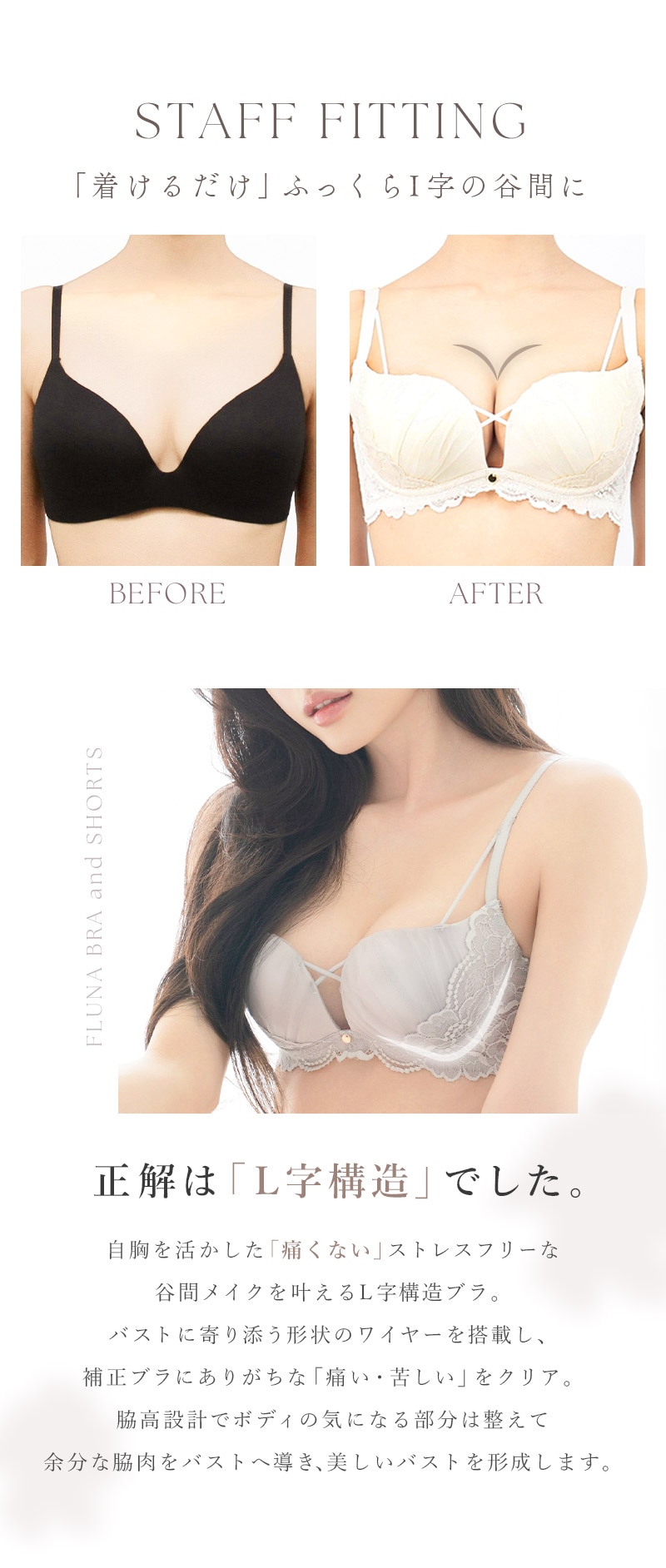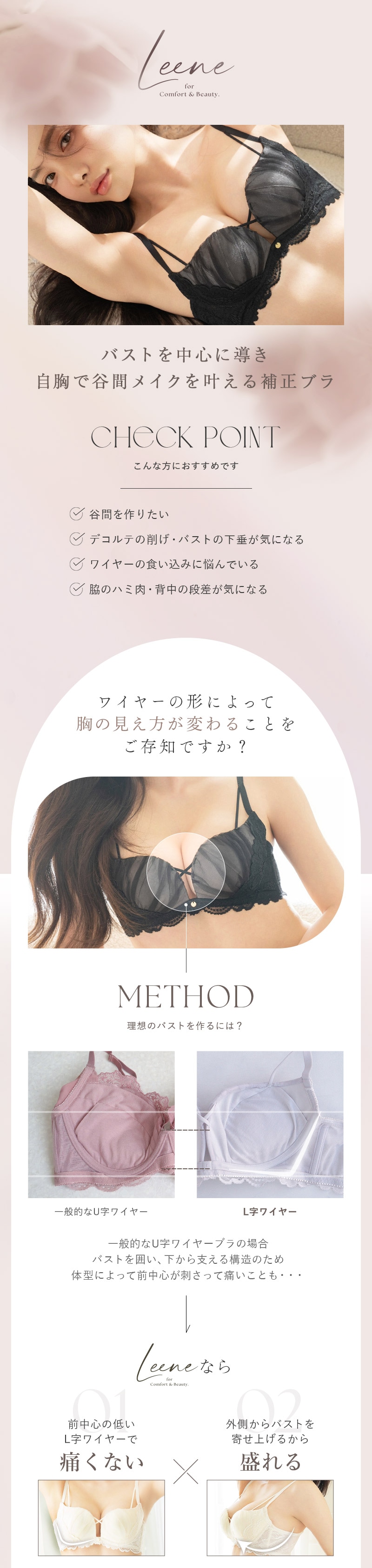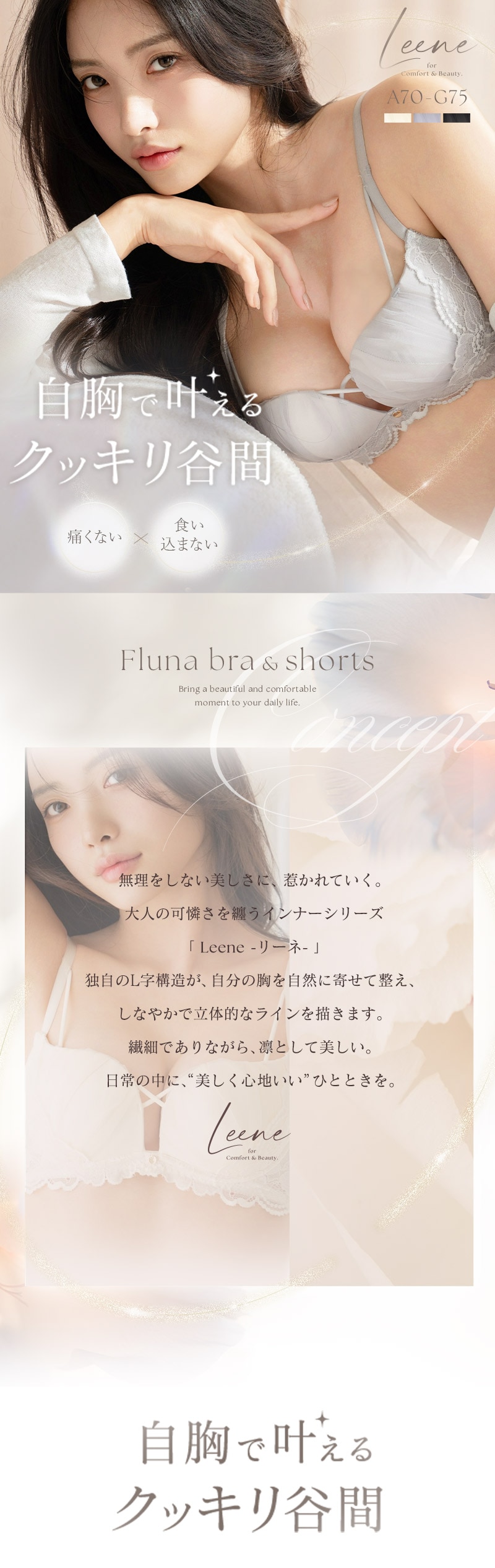 tu-hacci Bra&Shorts Collection ブラ&ショーツ / 計2点セット 自胸を活かしてストレスフリーな谷間メイクを叶えるL字構造ブラ “Leene(リーネ)シリーズ” シアーなチュールにギャザーを重ねて、シンプルながら上品な甘さを演出。 肌に添うサイドレースが引き立てるのは、繊細で華奢な佇まい。 《Leene》フルーナブラ&ショーツ 【こんな方におすすめ】 ・谷間を作りたい ・デコルテの削げ、バストの下垂が気になる ・ワイヤーの食い込みに悩んでいる ・脇のハミ肉、背中の段差が気になる ■「らくちんホールド」L字構造 L字のソフトワイヤーを採用。一般的な半円型ワイヤーと比べて前中心が低く、食い込まないから痛くない。 左右からバストを寄せつつ安定感があり、長時間の着用でもストレスフリー。 ■「魅力的なI字型の谷間」バストを中心に引き寄せるクロスゴム さらに、バストを引き上げるサポートゴムを採用することで 削げたデコルテもふっくらリフトアップ。 ■「ムダ肉を逃さずキャッチ」脇高設計&U字バック 脇高ボーンと幅広のサイドベルトが、気になる脇肉や背中の段差をすっきりフラット化。 ■ショーツは履き心地なめらかなフルバックタイプ ウエストを彩るフリルが可憐なシルエットを演出。 ストリング使いと中央のゴールドプレートが、ほんの少しのスパイスに。 |