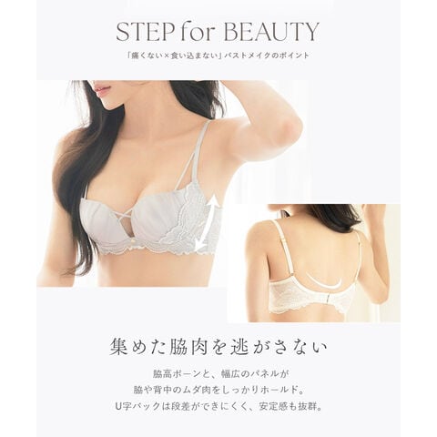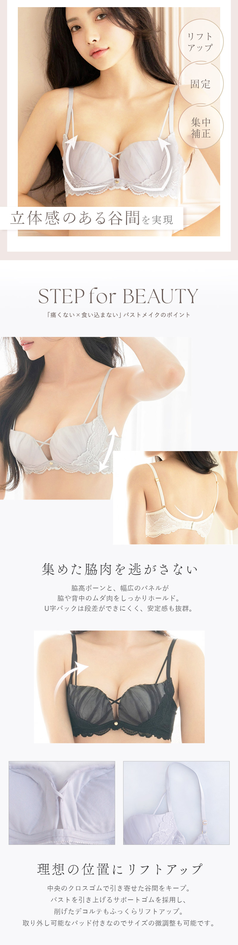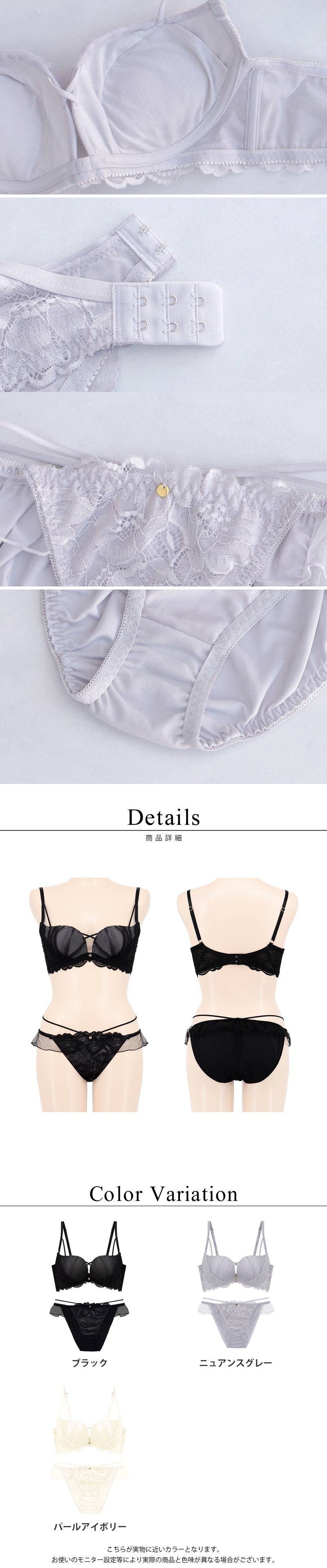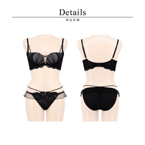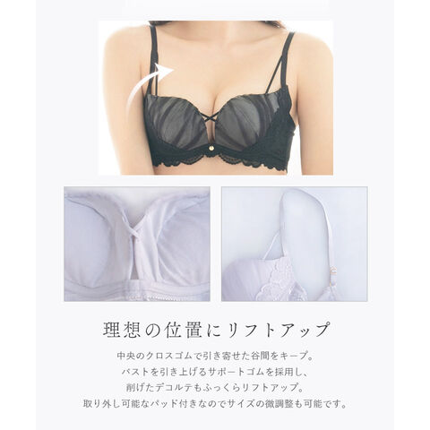 | ストラップ取り外し:不可 ストラップ長さ調節:可 パッド:あり パッド取り外し:可 ワイヤー:あり ホック:2段3列 透け感:バックなし、サイドあり |