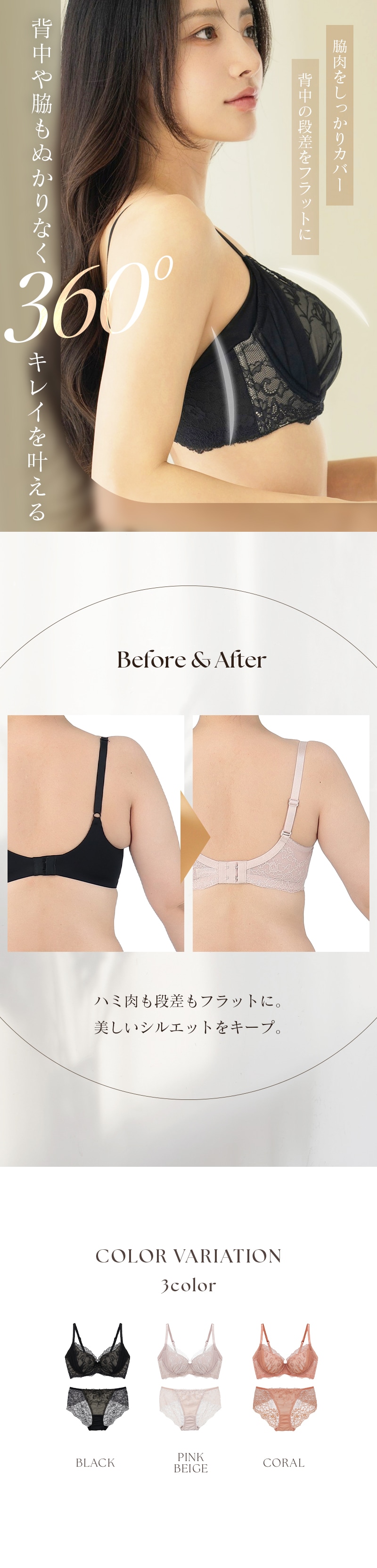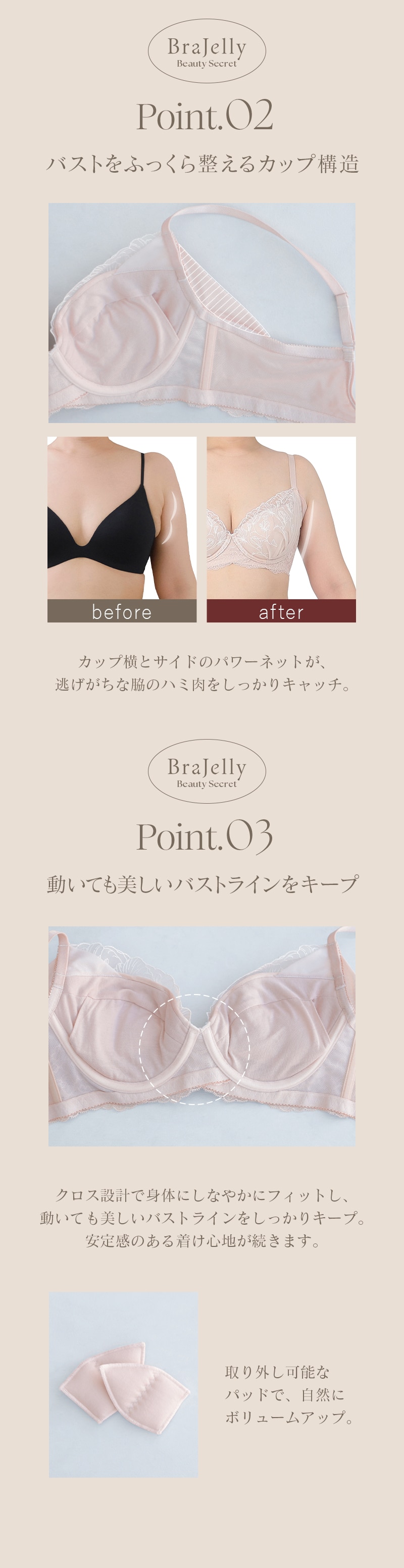 ストラップ取り外し:不可 ストラップ長さ調節:可 パッド:あり パッド取り外し:可 ワイヤー:あり ホック:2段3列 |