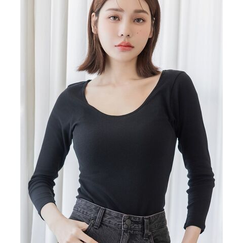 ・襟ぐり広めのラウンドネックで、首元の開いたトップスとも好相性