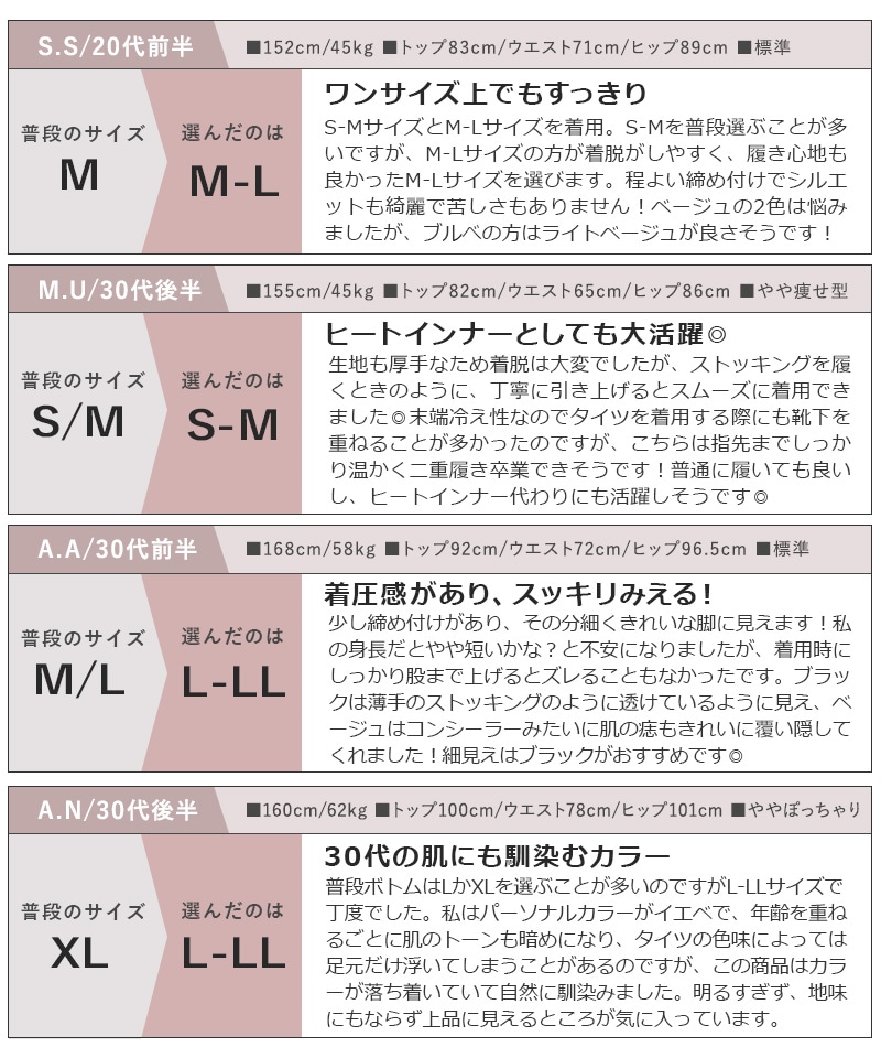 S~M:ヒップ 80~93cm M~L:ヒップ 85~98cm L~LL:ヒップ 90~103cm ※サイズは目安となります。 実際の着用感には個人差がございますので、 予めご了承いただけますようお願い申し上げます。 |