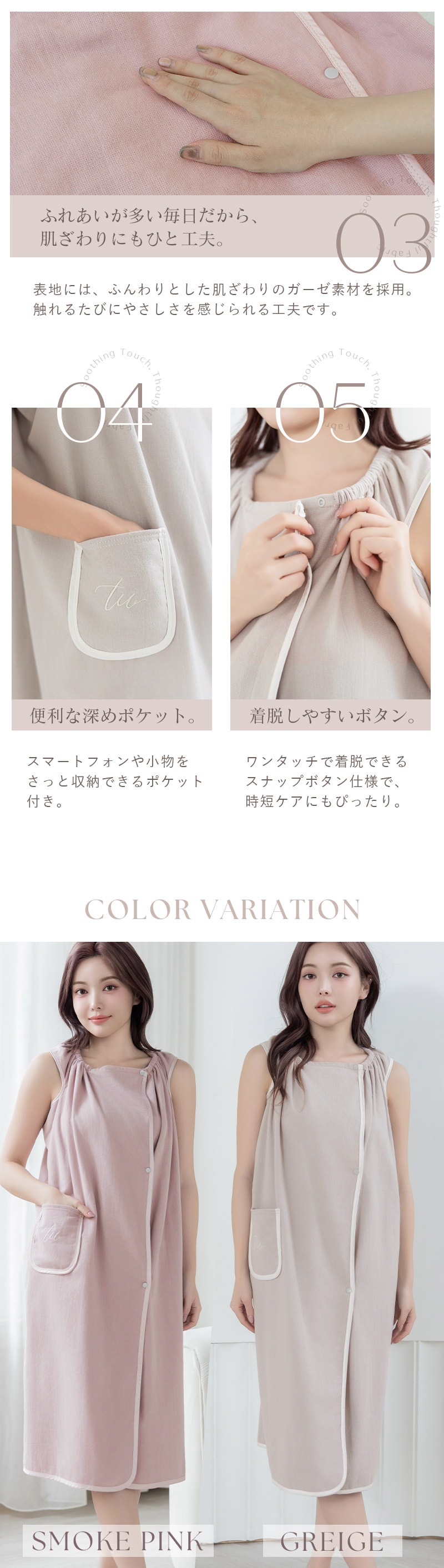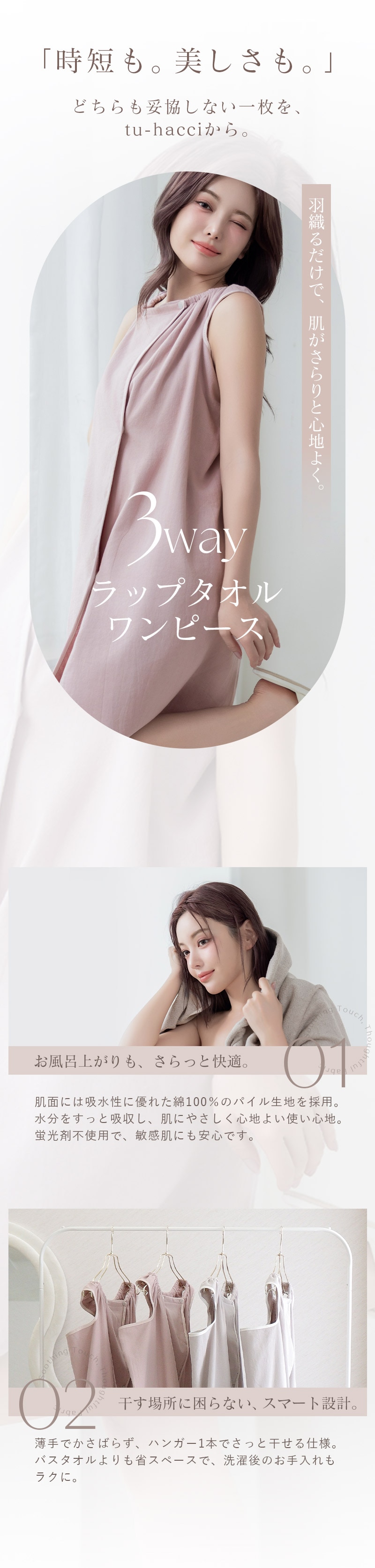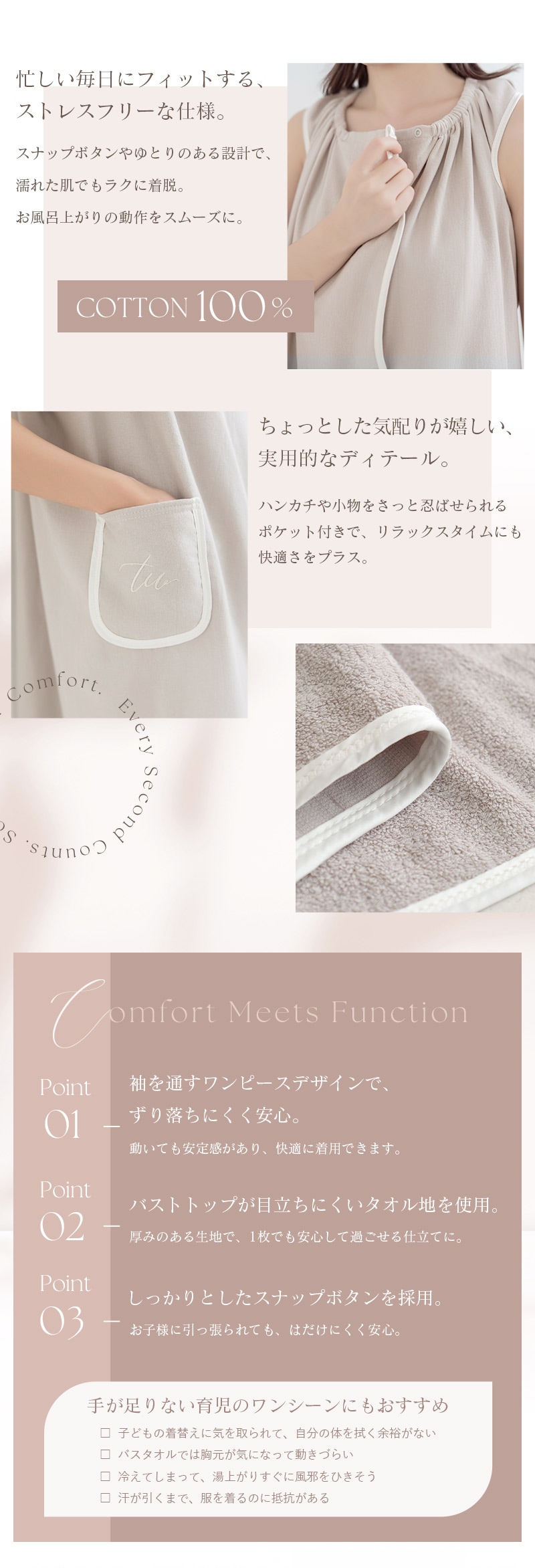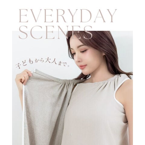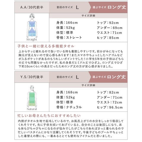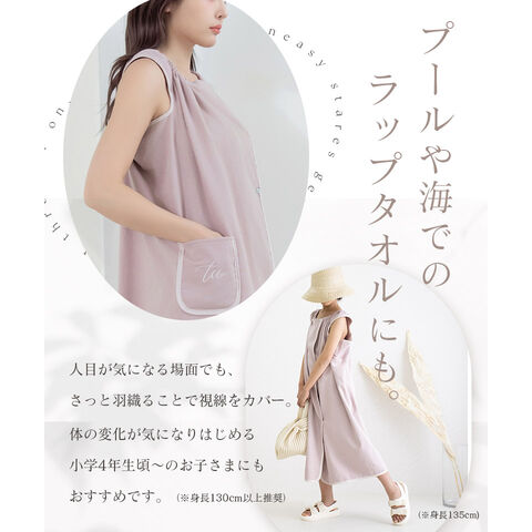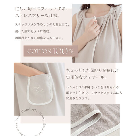 tu-hacci Outbath Collection ラップタオル単品 秒速リラックス。拭かずに着られるタオルワンピース お風呂上がりのバタバタ、こんな経験ありませんか? ・子どもの着替えやケアで、自分のことは後回しになりがち ・バスタオルがずれ落ちて、動きにくい ・なかなか汗が引かない そんな忙しいママの声に寄り添い、お風呂上がりの時間を、 もっと心地よく、もっと自分らしく過ごせるタオルワンピースを開発。 綿100%の優しいパイル生地が、濡れた体をサッと包み込み、 湯冷めを防ぎながら、快適なリラックスタイムへ誘います。 【商品の特徴】 ・汗を素早く吸収しベタつきを防ぐ、吸水性に優れた綿100%のパイル生地を採用 ・表面は肌当たりのよいガーゼ素材を使用し、やさしい肌触り ・袖を通すワンピースデザインで、家事や育児の際も動きやすく安心 ・スマホやちょっとした小物をサッと入れられる深めのポケット付き ・薄手でかさばらず、ハンガー1本でさっと干せる 【こんな時におすすめ】 ・ワンオペ育児のお風呂上がりに、サッと着替えたい ・プールや海でのラップタオルとして、お子様にもおすすめ ・汗が引くまで、服を着るのに抵抗がある このタオルワンピースが、あなたの「余裕のある私でいたい」という願いを叶えます。 |