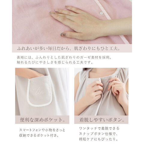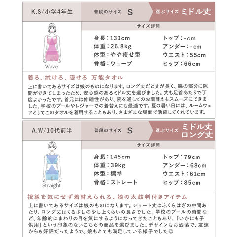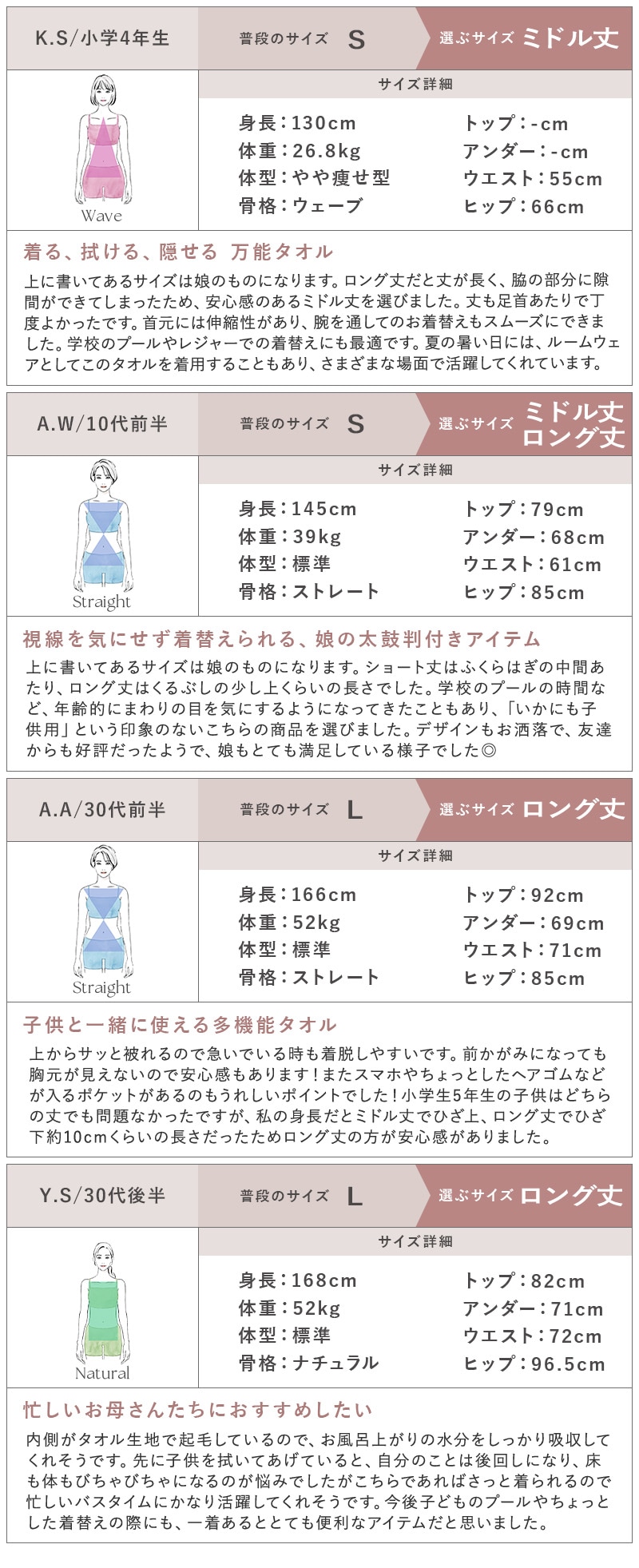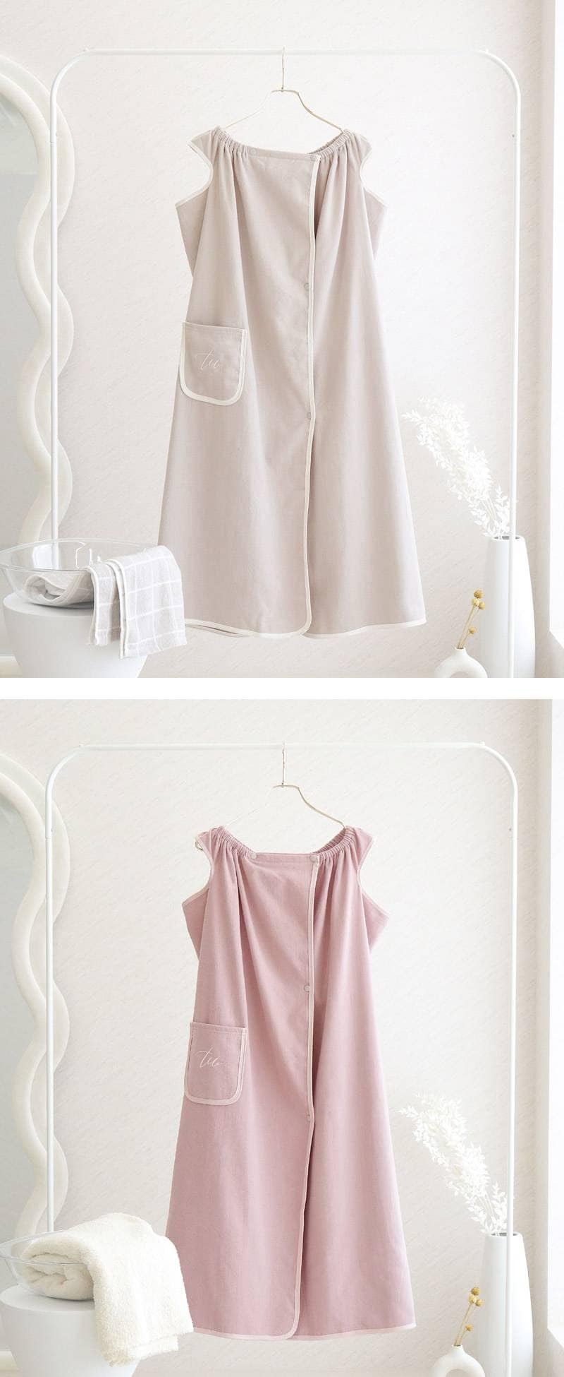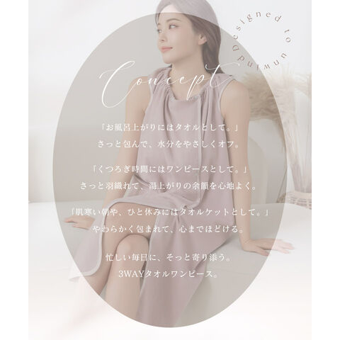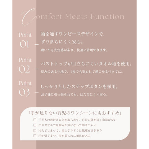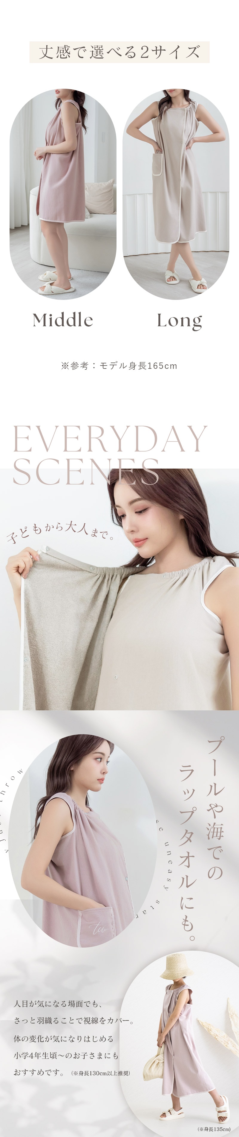 tu-hacci Outbath Collection ラップタオル単品 秒速リラックス。拭かずに着られるタオルワンピース お風呂上がりのバタバタ、こんな経験ありませんか? ・子どもの着替えやケアで、自分のことは後回しになりがち ・バスタオルがずれ落ちて、動きにくい ・なかなか汗が引かない そんな忙しいママの声に寄り添い、お風呂上がりの時間を、 もっと心地よく、もっと自分らしく過ごせるタオルワンピースを開発。 綿100%の優しいパイル生地が、濡れた体をサッと包み込み、 湯冷めを防ぎながら、快適なリラックスタイムへ誘います。 【商品の特徴】 ・汗を素早く吸収しベタつきを防ぐ、吸水性に優れた綿100%のパイル生地を採用 ・表面は肌当たりのよいガーゼ素材を使用し、やさしい肌触り ・袖を通すワンピースデザインで、家事や育児の際も動きやすく安心 ・スマホやちょっとした小物をサッと入れられる深めのポケット付き ・薄手でかさばらず、ハンガー1本でさっと干せる 【こんな時におすすめ】 ・ワンオペ育児のお風呂上がりに、サッと着替えたい ・プールや海でのラップタオルとして、お子様にもおすすめ ・汗が引くまで、服を着るのに抵抗がある このタオルワンピースが、あなたの「余裕のある私でいたい」という願いを叶えます。 |