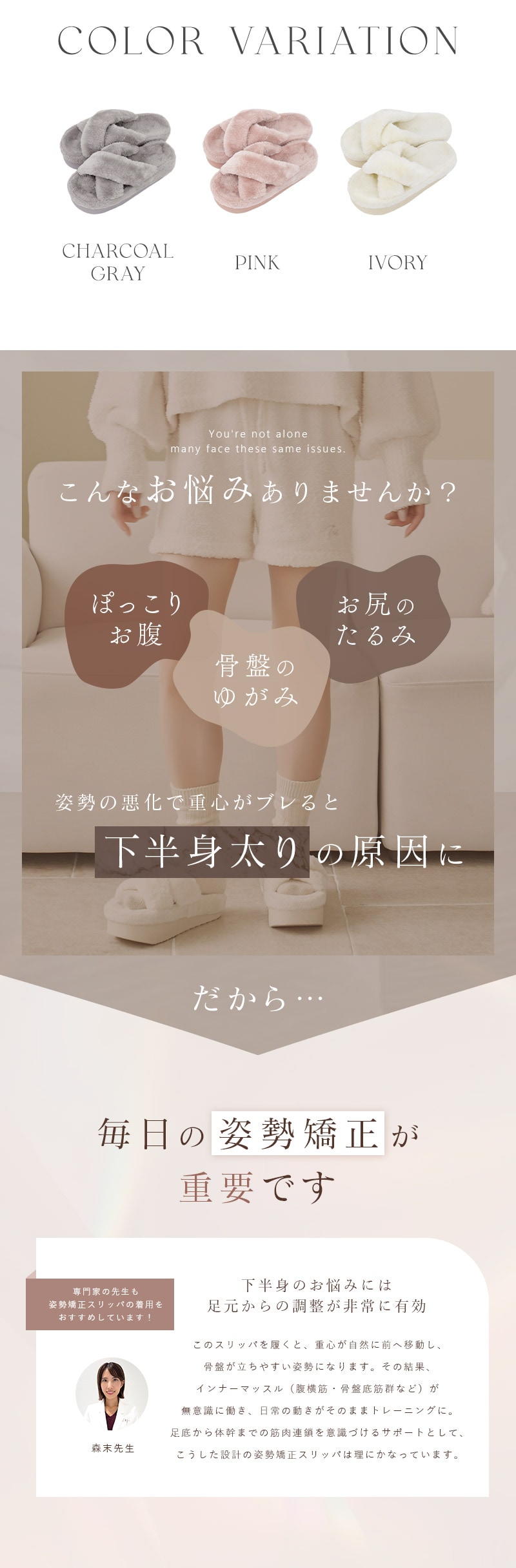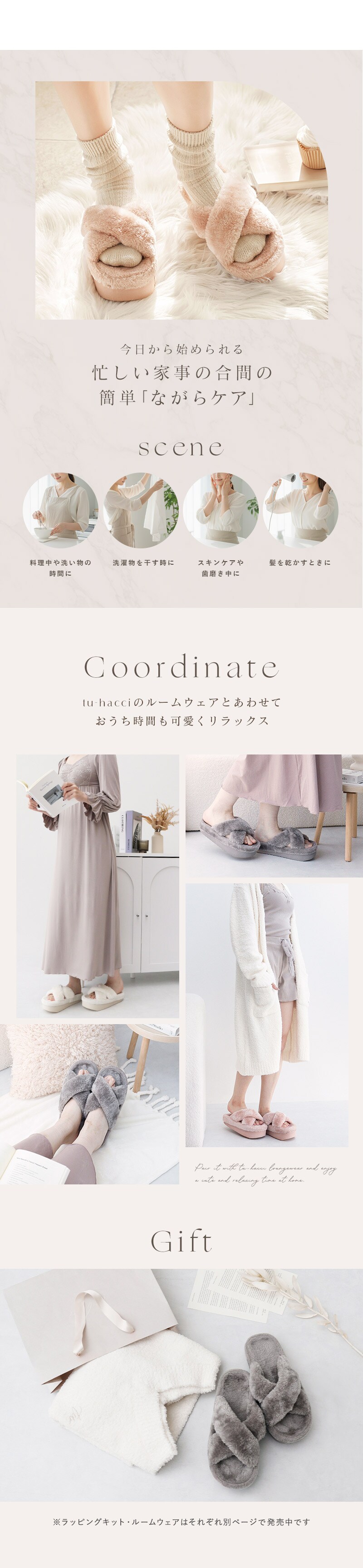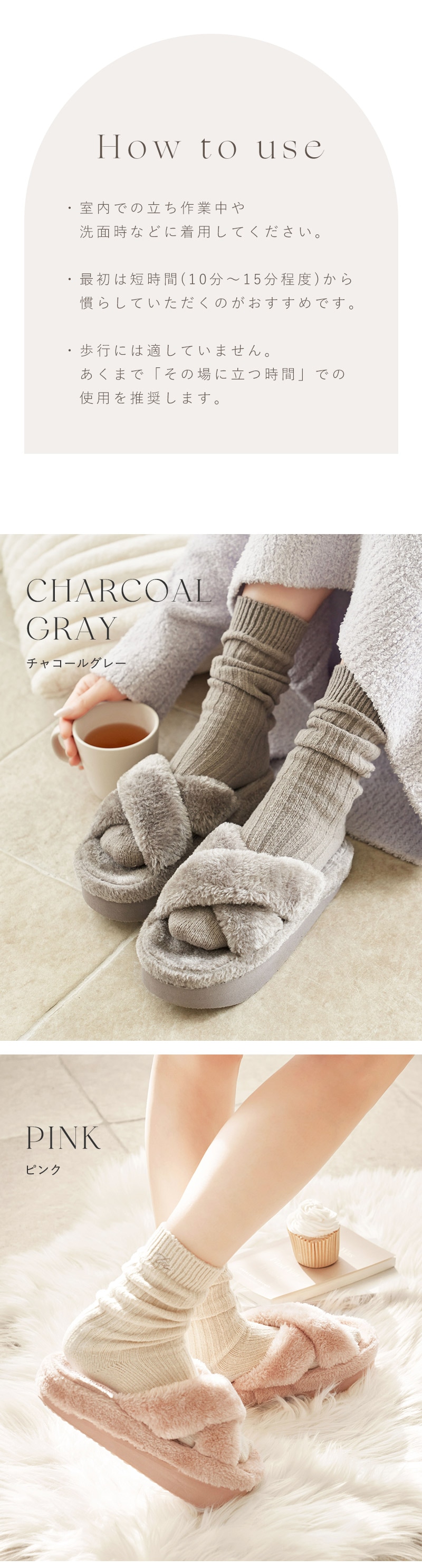 tu-hacci Legwear Collection 履くだけで体幹を整える ルームスリッパ 傾斜インソール設計で自然に姿勢をサポート。 お腹・脚・背筋にアプローチしながら足元から美しさを整えます。 健康に気を使いたいけれど、運動の時間を取れない現代女性におすすめの一足。 【こんな方におすすめ】 ・下半身太りに悩んでいる ・エクササイズの時間が取れない ・姿勢を美しく整えたい ■忙しい家事の合間の簡単「ながらケア」 かかと側が低い設計で、体がバランスを保とうと自然に前重心に。 骨盤が立ちやすい姿勢となり、結果としてインナーマッスルが無意識に働くため、家事の時間がそのままトレーニングになります。 大人可愛いファッショナブルなデザインは、ギフトにもおすすめ。 |