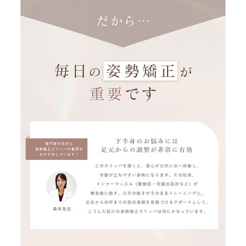 tu-hacci Legwear Collection 履くだけで体幹を整える ルームスリッパ 傾斜インソール設計で自然に姿勢をサポート。 お腹・脚・背筋にアプローチしながら足元から美しさを整えます。 健康に気を使いたいけれど、運動の時間を取れない現代女性におすすめの一足。 【こんな方におすすめ】 ・下半身太りに悩んでいる ・エクササイズの時間が取れない ・姿勢を美しく整えたい ■忙しい家事の合間の簡単「ながらケア」 かかと側が低い設計で、体がバランスを保とうと自然に前重心に。 骨盤が立ちやすい姿勢となり、結果としてインナーマッスルが無意識に働くため、家事の時間がそのままトレーニングになります。 大人可愛いファッショナブルなデザインは、ギフトにもおすすめ。 |