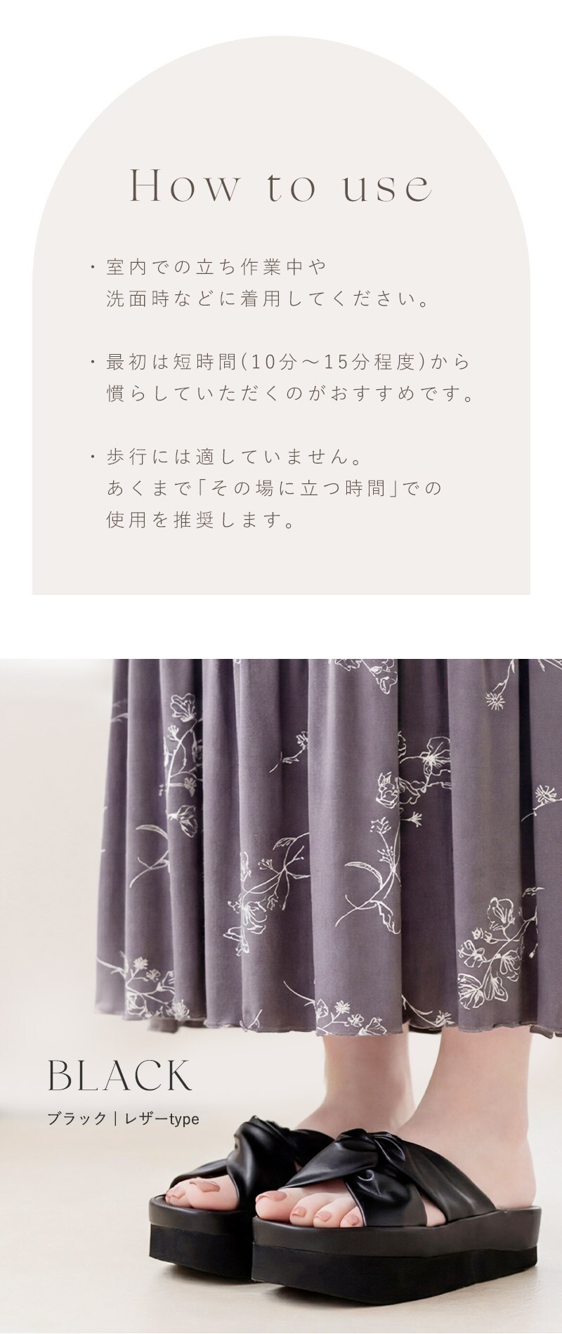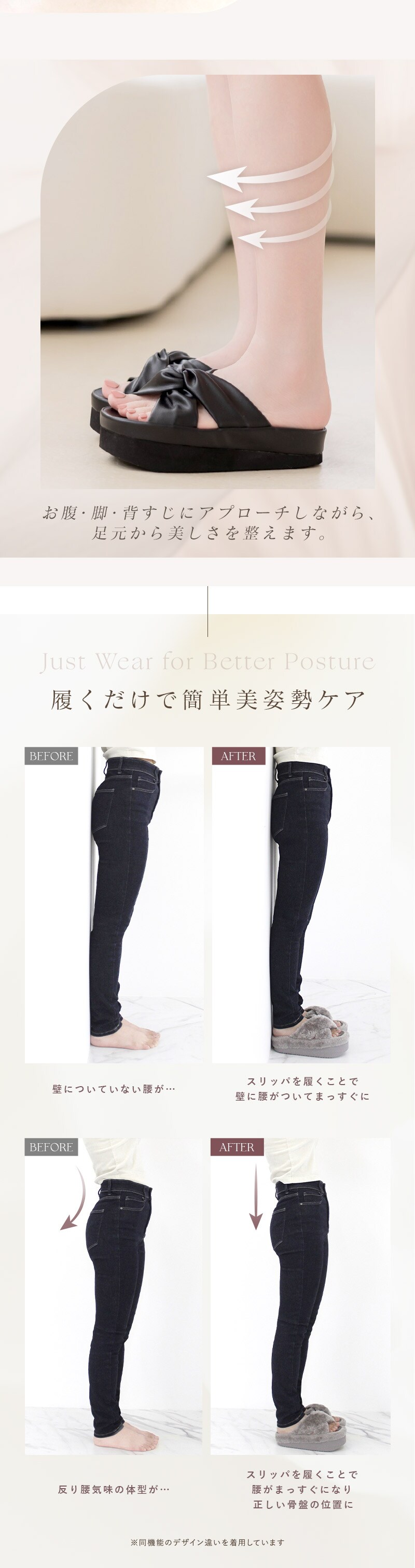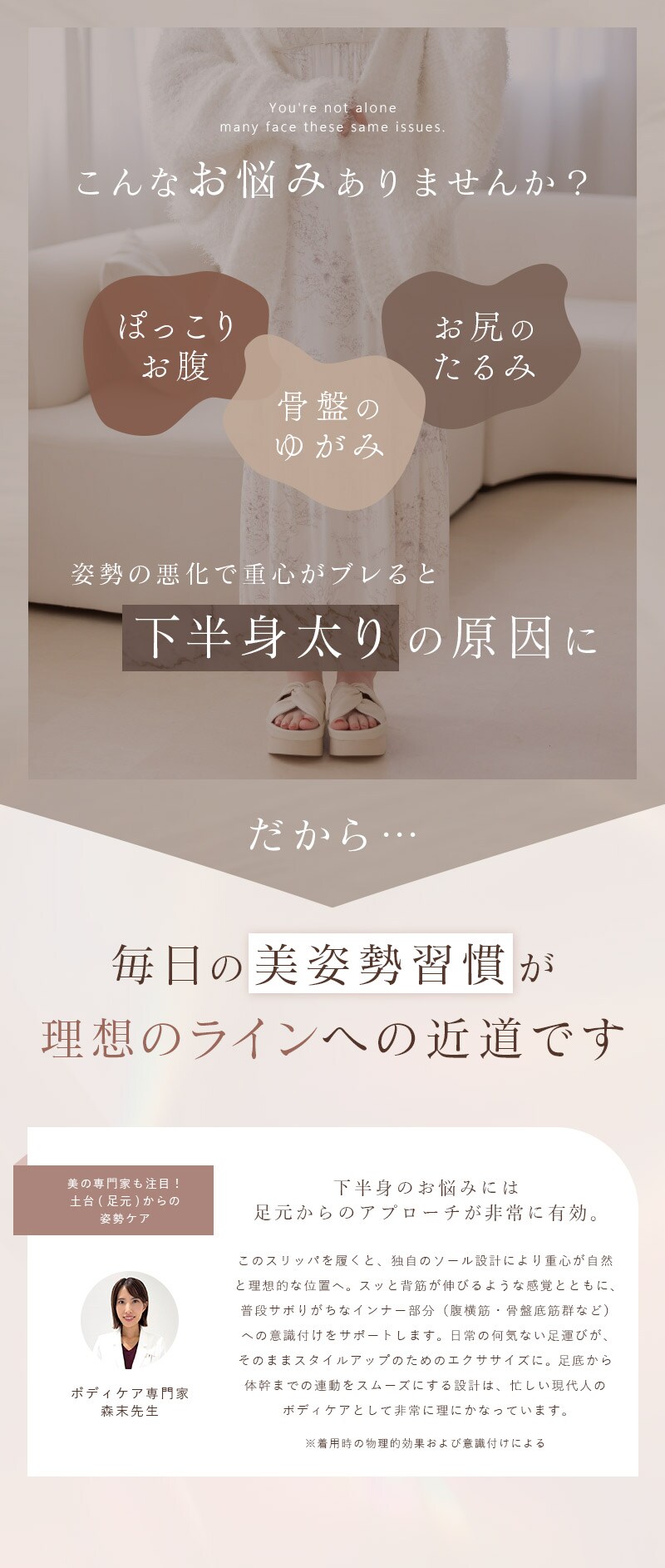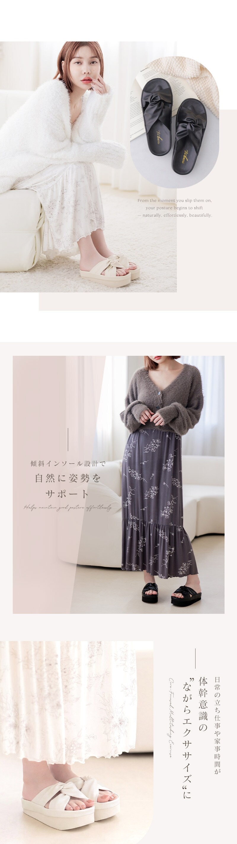 tu-hacci Legwear Collection 履くだけで体幹を整える ルームスリッパ 傾斜インソール設計で自然に姿勢をサポート。 お腹・脚・背筋にアプローチしながら足元から美しさを整えます。 健康に気を使いたいけれど、運動の時間を取れない現代女性におすすめの一足。 【こんな方におすすめ】 ・下半身太りに悩んでいる ・エクササイズの時間が取れない ・姿勢を美しく整えたい ■忙しい家事の合間の簡単「ながらケア」 かかと側が低い設計で、体がバランスを保とうと自然に前重心に。 骨盤が立ちやすい姿勢となり、結果としてインナーマッスルが無意識に働くため、家事の時間がそのままトレーニングになります。 大人可愛いファッショナブルなデザインは、ギフトにもおすすめ。 |