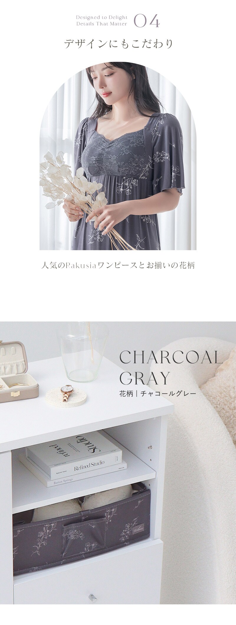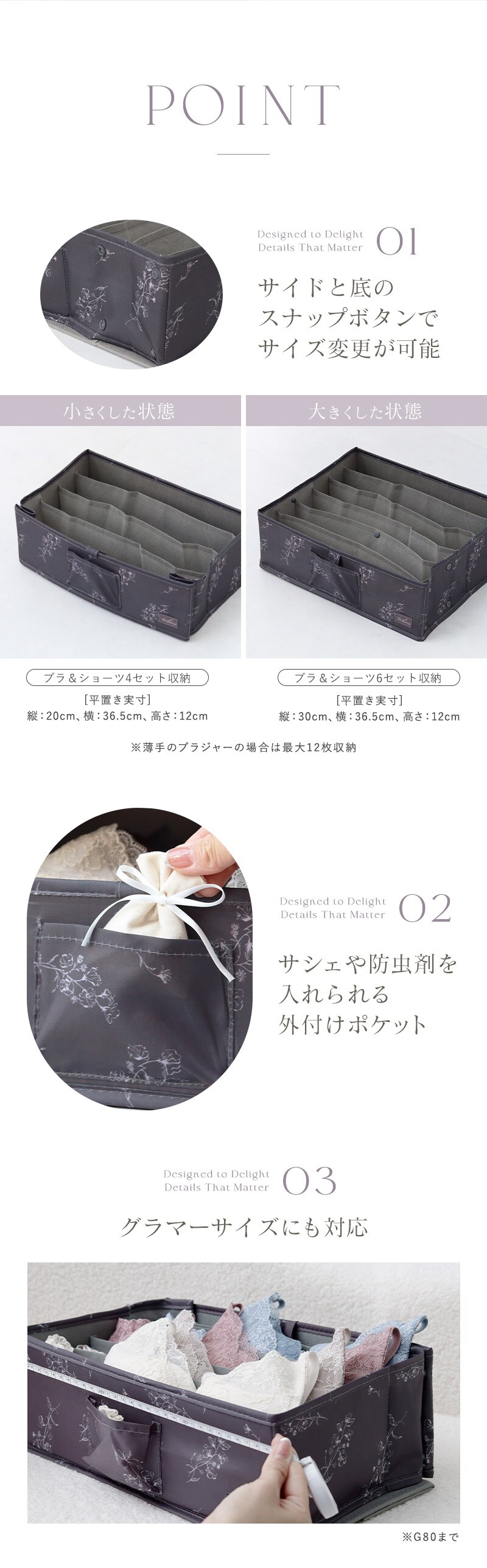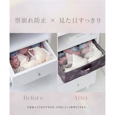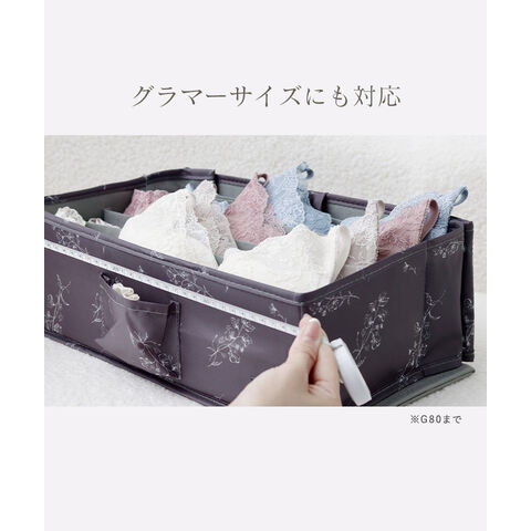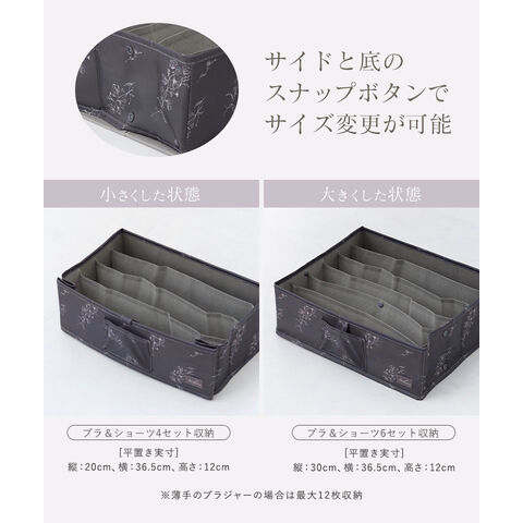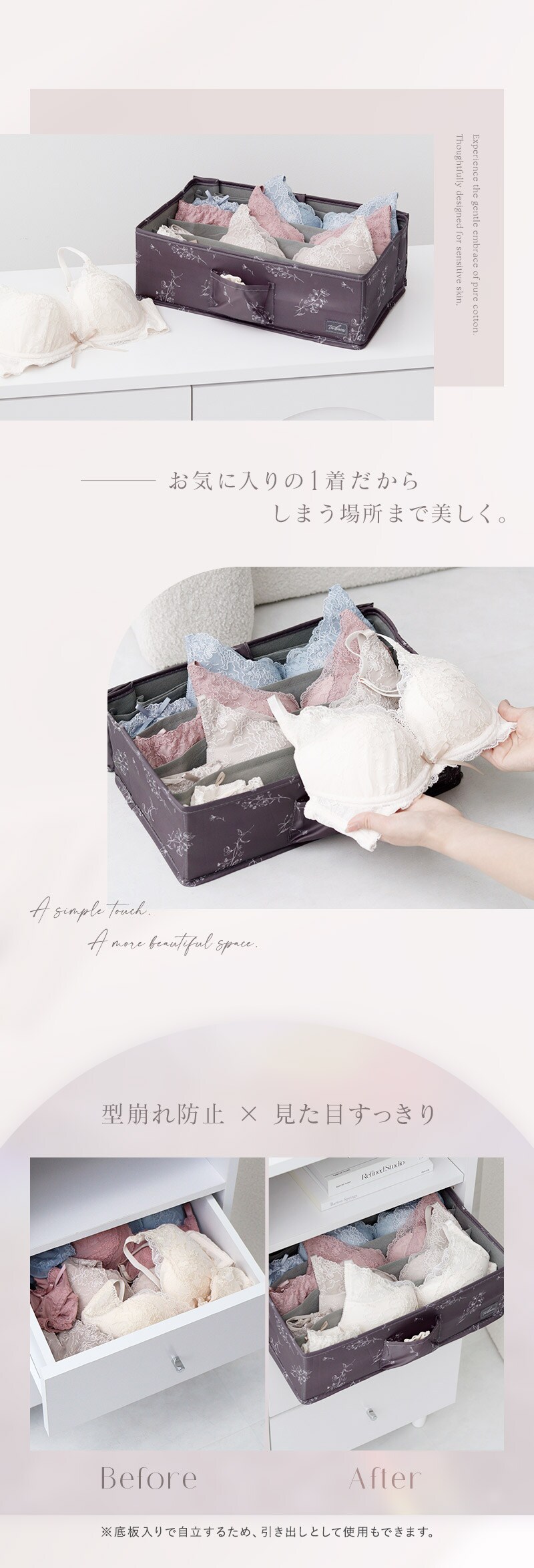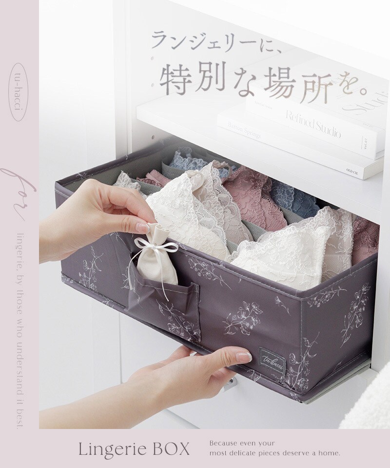 tu-hacci Goods Collection ランジェリーBOX単品 お気に入りの1着には、特別な場所を。 大切な下着を収納する“だけじゃない”BOX。 【こんな方におすすめ】 ・下着が増えて整理しきれない ・収納力だけでなくデザインにもこだわりたい ・大きいサイズのブラを型崩れさせずに収納したい ■下着専門店が提案する収納BOX ・サイドと底のスナップボタンでBOX自体のサイズ調整が可能 ・サシェを入れられる便利なポケット付き ・台紙入りの底でしっかり保形 ・Gカップ(アンダー80まで)収納OK Rakusia Sleepシリーズのチャコール花柄デザイン採用で、インテリアとしても空間を彩ります。 |