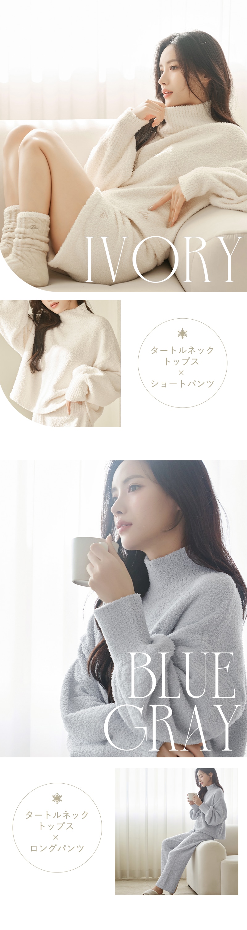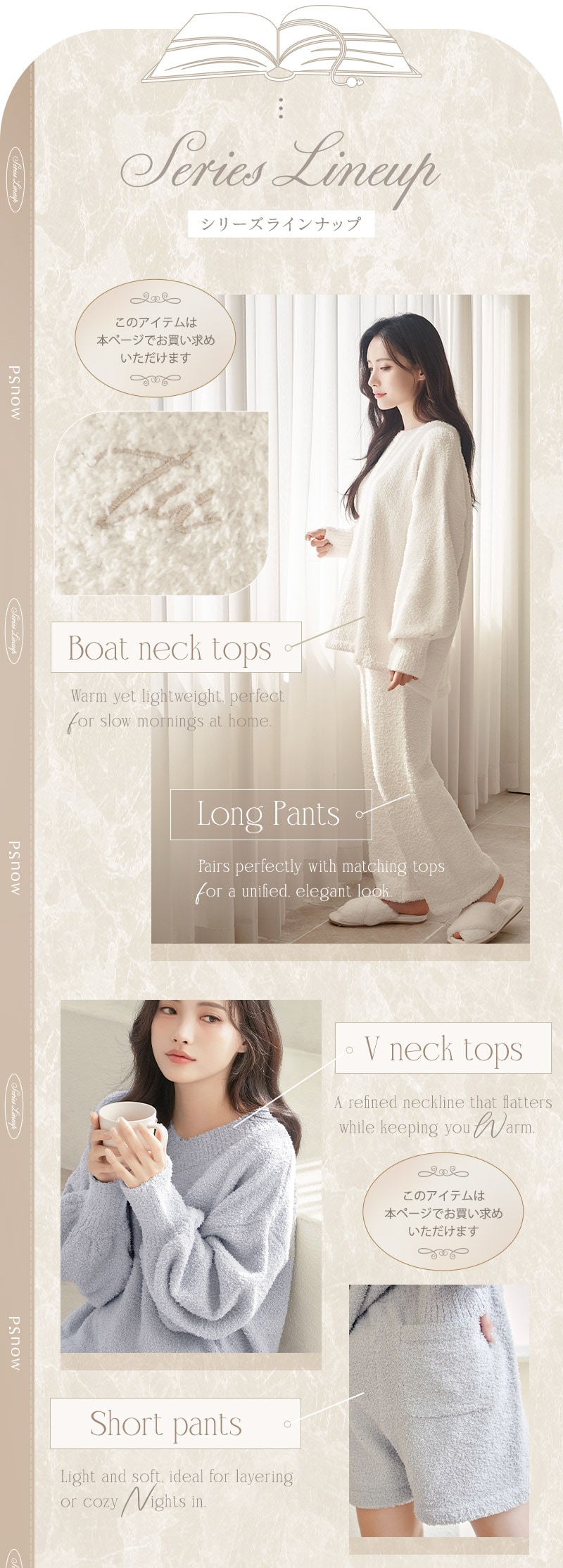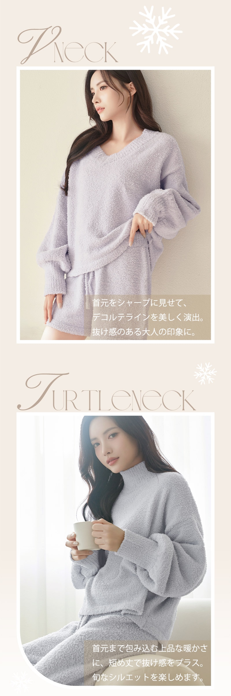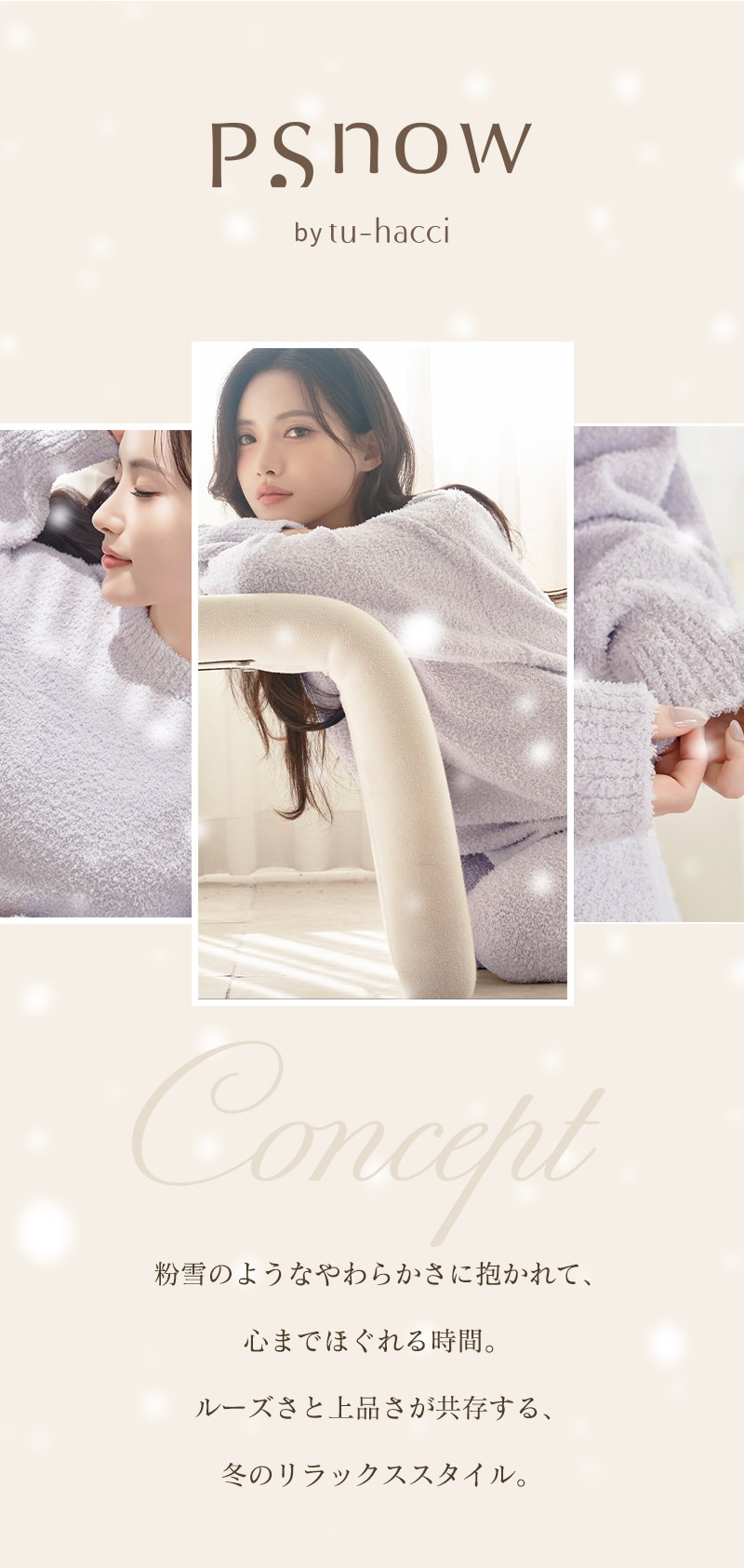 tu-hacci Roomwear Collection トップス3種類×パンツ2種類 粉雪のように、軽やかで優しい肌ざわり。 ≪P.snowシリーズ≫ 抜け感でつくる、大人のニュアンスフェミニン。 柔らかなぬくもりに抱かれて心までほぐれる時間。 ルーズさと上品さが共存する、冬のリラックススタイル。 【こんな方におすすめ】 ・くつろぎながらも、洗練された雰囲気を楽しみたい方 ・なめらかな肌ざわりにこだわりたい方 ・軽やかな着心地がお好きな方 ・自然に体型カバーできるルームウェアを探している方 ■保温性+肌ざわりにこだわったリラックスウェア ・繊維の間に空気を含み、温かさを逃がさない ・毛羽落ち、毛玉になりにくい素材を使用 ・粉雪のように柔らかな質感で快適な着心地 ・シワになりにくく、型崩れしにくい 【トップスは選べる3種類】 ■上品なラインで“魅せる”ボートネック 柔らかな曲線で女性らしさを引き立てつつ、ヒップまでしっかりカバー。 ■デコルテラインを美しく演出するVネック 首元をシャープに見せて、抜け感のある大人の印象に。 ■旬なシルエットを楽しめるタートルネック 首元まで包み込む上品な温かさ。短め丈でスタイルUP。 【ボトムスは選べる2種類】 ショートパンツ/ロングパンツ ・2重のウエストベルトがお腹をしっかり温める ・履きやすいウエストゴム仕様 ・ウエスト紐でお好みの履き心地に調整可能 ・右後ろには便利なポケット付きで、機能性も◎ ロゴ刺繍がさりげないアクセントに。 |