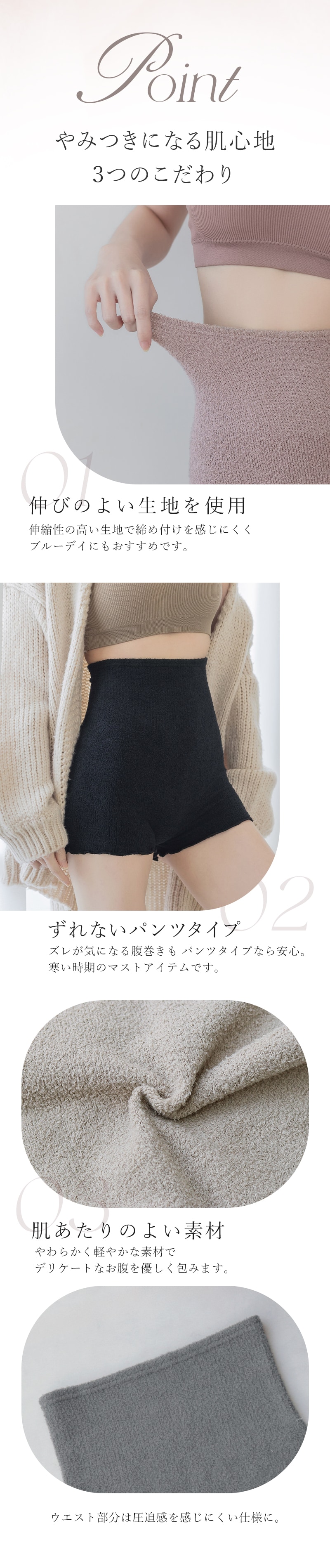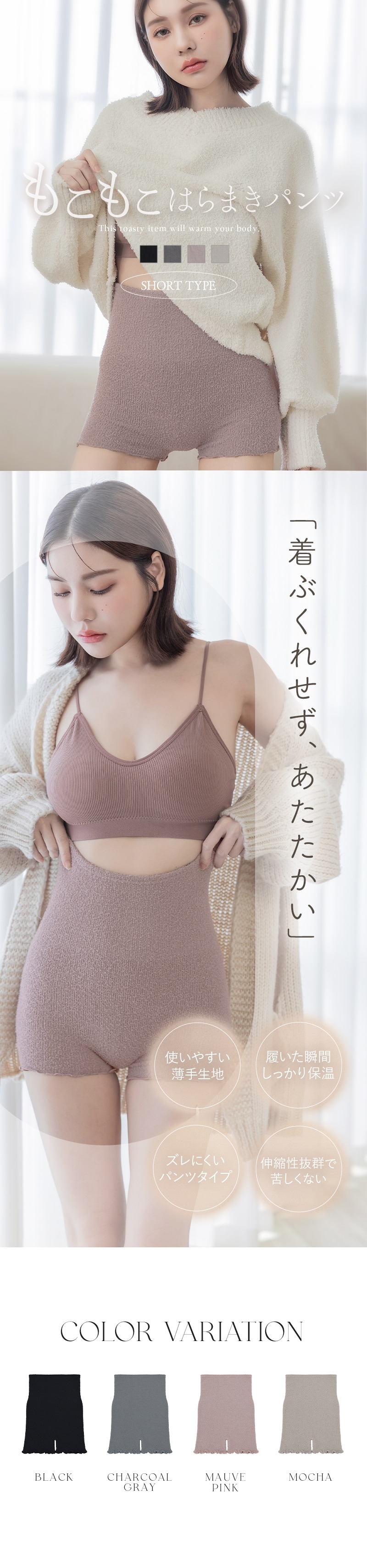 tu-hacci Warm Collection 腹巻きパンツ 履いた瞬間“温かさ”を実感 腹巻きパンツショートタイプ 【こんな方におすすめ】 ・冷えが気になる方 ・着ぶくれしない腹巻きを探している方 ・肌あたりの良い素材を求めている方 伸縮性の高い生地で締め付けを感じにくく、しっかり温活。 やわらかく軽やかな素材がデリケートなお腹を優しく包みます。 冷えが気になる季節だけでなく、ブルーデイにもおすすめ。 |