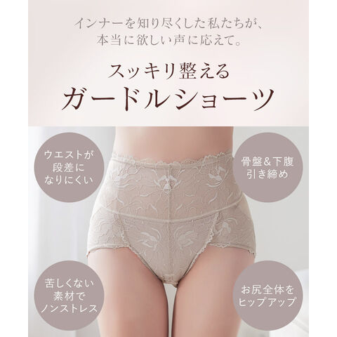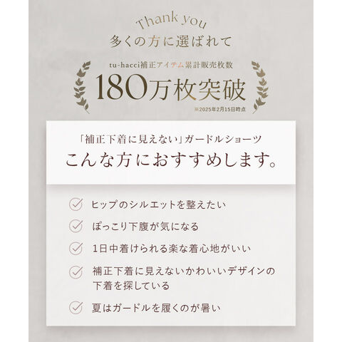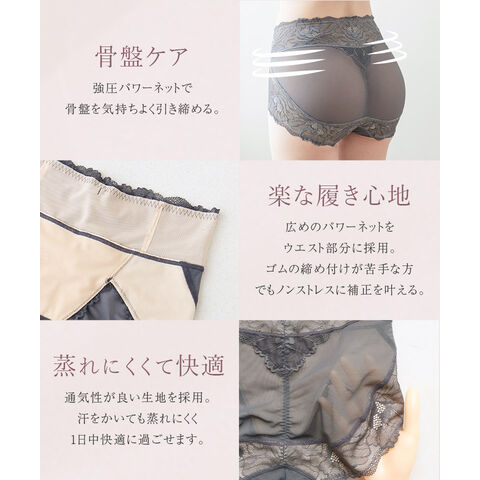 tu-hacci Shorts Collection ショーツ単品 『ヒップアップ』『骨盤ケア』などの機能で、忙しい毎日を快適にサポート。 365日いつでもお洒落な自分でいたい。 ガードルを履く日もお気に入りの下着とコーディネートを楽しみたい。 そんな方に向けた「補正下着に見えない」ヒップアップショーツ。 特別な日はもちろん、日常使いにもおすすめの一着。 ■スタイルアップを叶える機能 ・履くだけでお尻・骨盤・鼠径部・下腹を手軽に補正。 ・ストレッチ素材でお尻全体を包み、美しいヒップラインをキープ。 ・ショーツの上に乗りがちなぜい肉もしっかりカバーし、段差レスに。 ・パワーネットが骨盤を心地よく引き締め、ノンストレスな着用感。 ・通気性が良いレース生地で、汗をかいても蒸れにくく1日中快適。 ・苦しくないから、毎日続けやすい快適設計。 ■気分によって使い分け可能 レース生地は当店の補正ブラで一番人気のvivanteシリーズと同じ「ピオニーレース」を採用。 芍薬をモチーフにしたレースを贅沢に使用した大人の魅力漂う繊細なデザイン。 ピオニーレースのブラをお持ちの場合、 その日の気分や服装に合わせてコーディネート可能。 ■選べる丈感 好みに合わせて股上の短いミドル丈と股上の長いハイウエスト丈からお選びいただけます。 ・ミドル丈 スッキリと股上の短いミドル丈は、短くても骨盤周りをしっかりサポート! ウエストの締め付けが苦手な方におすすめです。 ・ハイウエスト丈 お腹をすっぽり包むハイウエスト丈は、ウエスト周りの贅肉が気になる方におすすめです。 ※ハイウエスト丈は股下が5cm長くなっております。 |