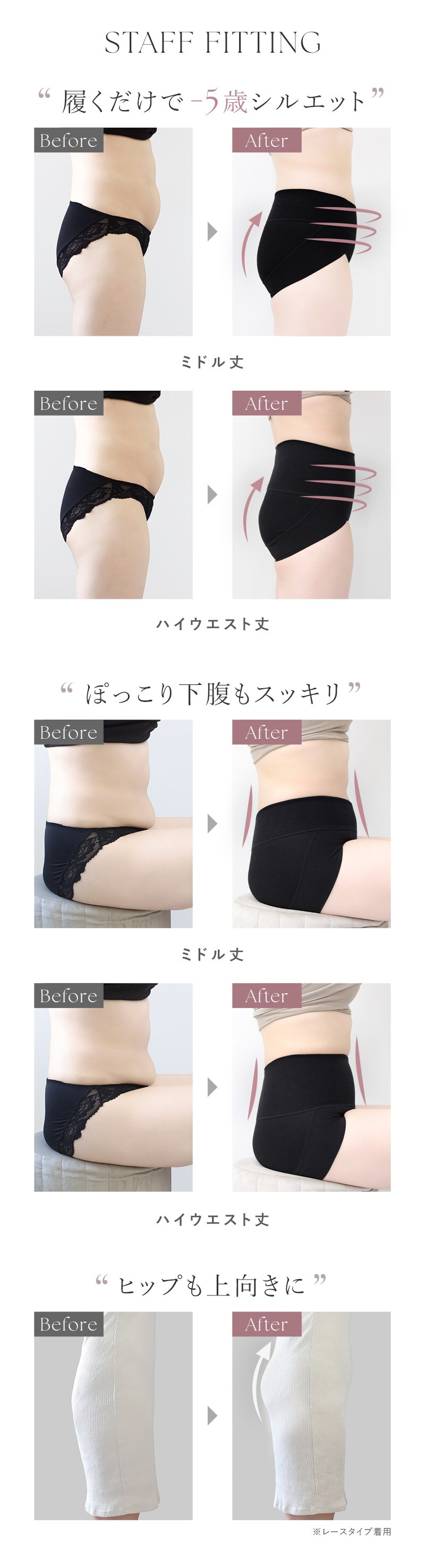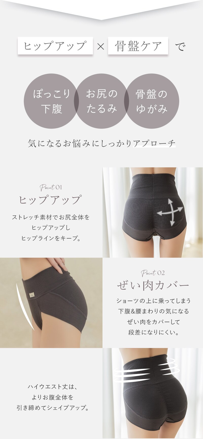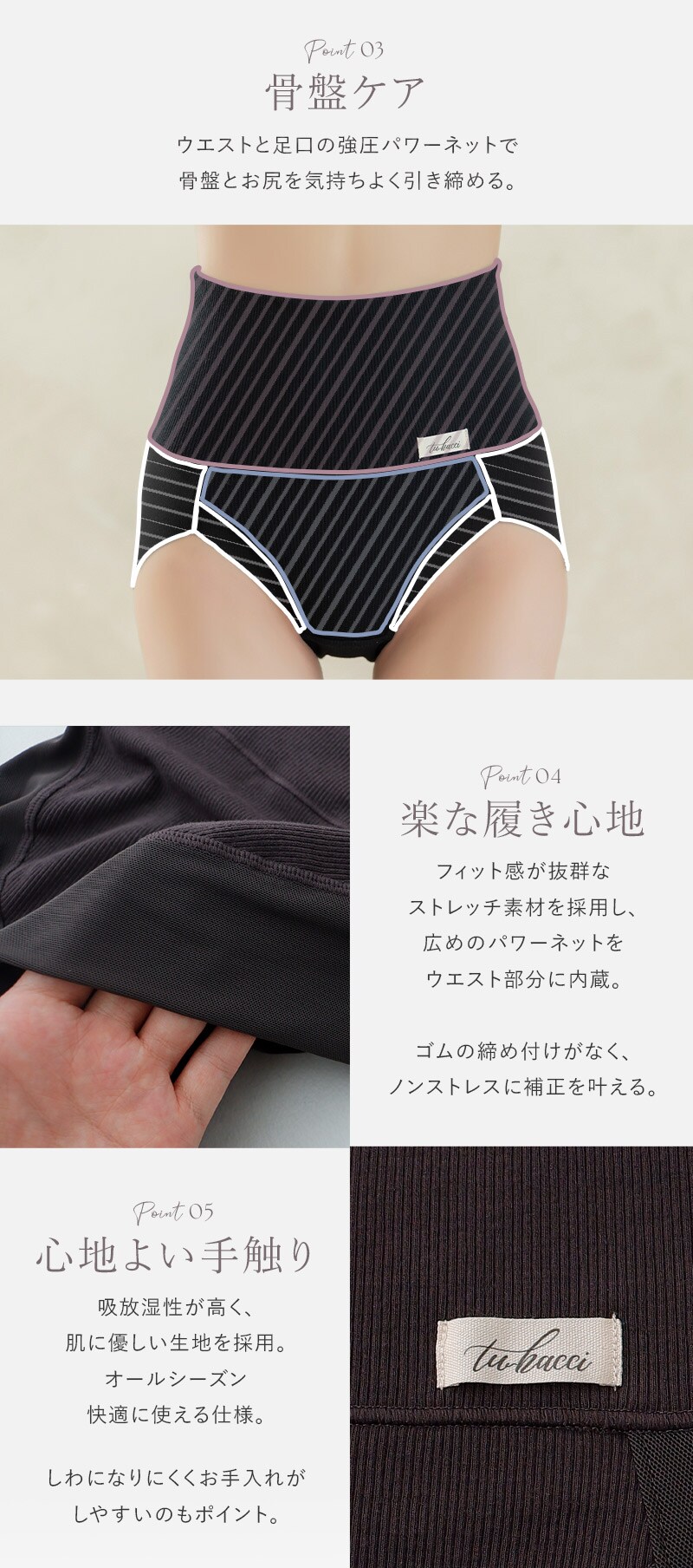 tu-hacci Shorts Collection ショーツ単品 『ヒップアップ』『骨盤ケア』などの機能で、忙しい毎日を快適にサポート。 365日いつでもお洒落な自分でいたい。 ガードルを履く日もお気に入りの下着とコーディネートを楽しみたい。 そんな方に向けた「補正下着に見えない」ヒップアップショーツ。 特別な日はもちろん、日常使いにも。 ■スタイルアップを叶える機能 ・履くだけでお尻・骨盤・下腹を手軽に補正。 ・ストレッチ素材でお尻全体を包み、美しいヒップラインをキープ。 ・ショーツの上に乗りがちなぜい肉もしっかりカバーし、段差レスに。 ・パワーネットが骨盤を心地よく引き締め、ノンストレスな着用感。 ・苦しくないから、毎日続けやすい快適設計。 ■ヘルシーなデザイン リブ素材で装飾の少ないシンプルなデザインは、ブラトップやスポーティなブラとの相性◎ ■選べる2種類の丈感 ・ウエストの締め付け感が苦手な方にはミドル丈 ・ぽっこりお腹もすっきり覆うハイウエスト丈 |