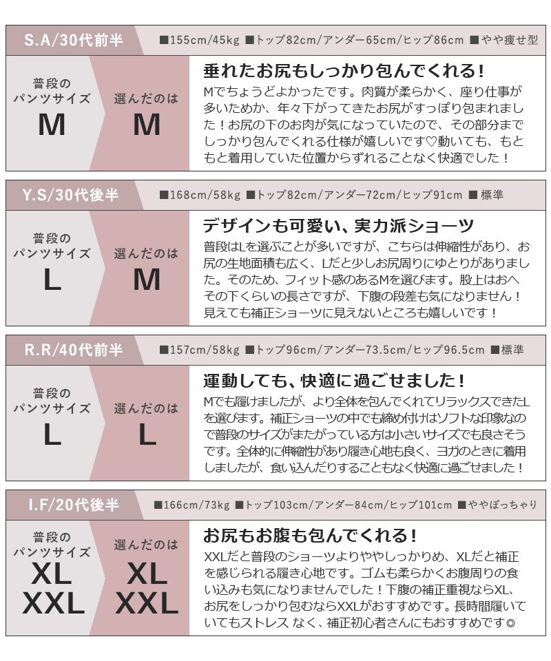 《ショーツ:ヒップ》 M:87~95cm L:92~100cm XL:97~105cm XXL:102~110cm ※対応サイズは目安となり、実際の着用感には個人差がございます。 |