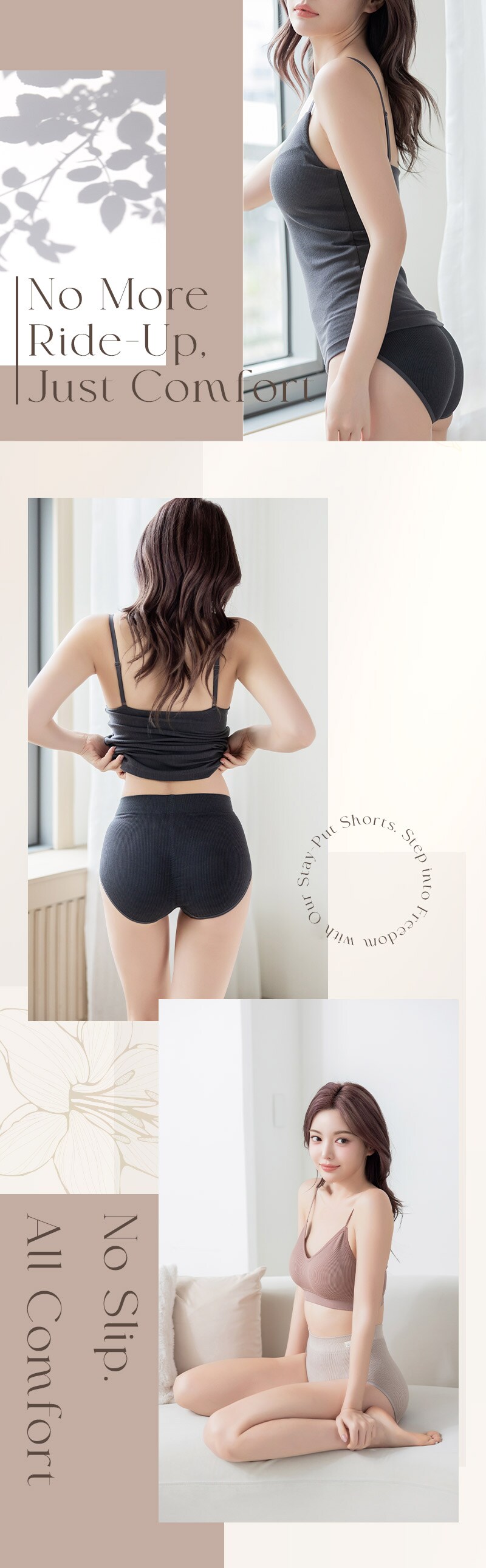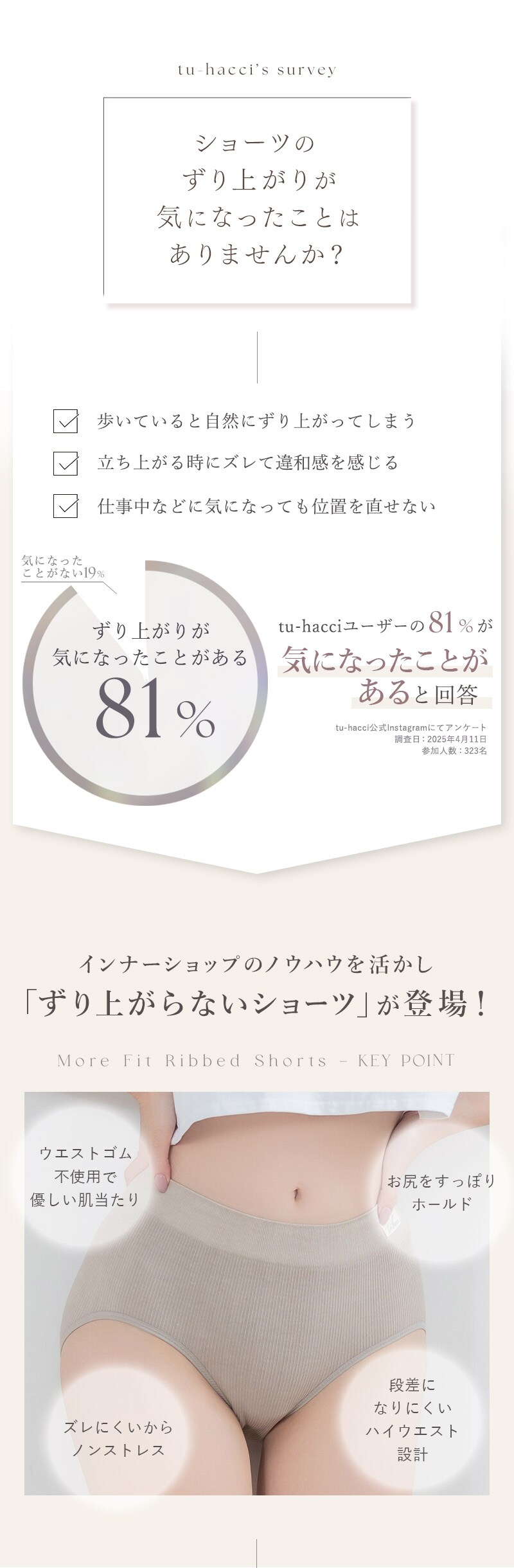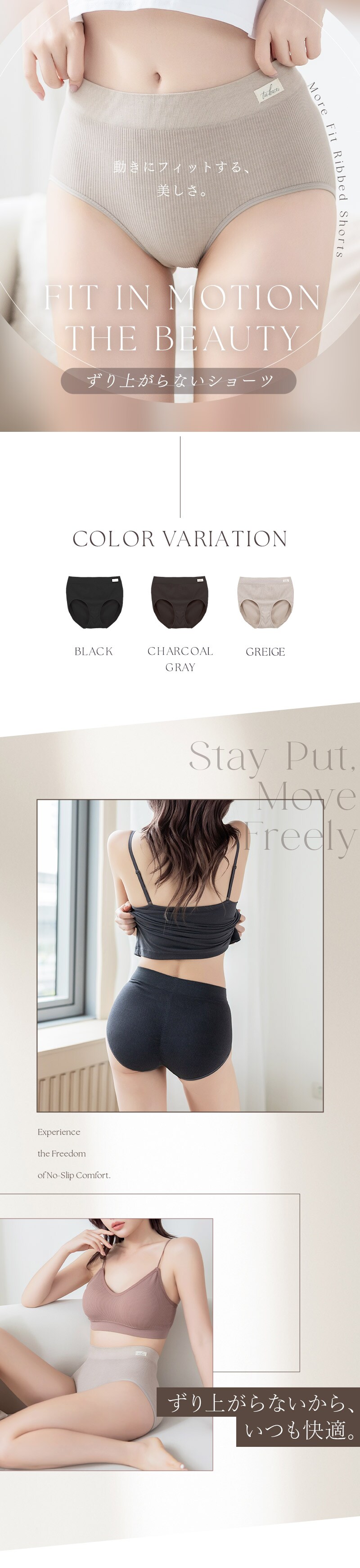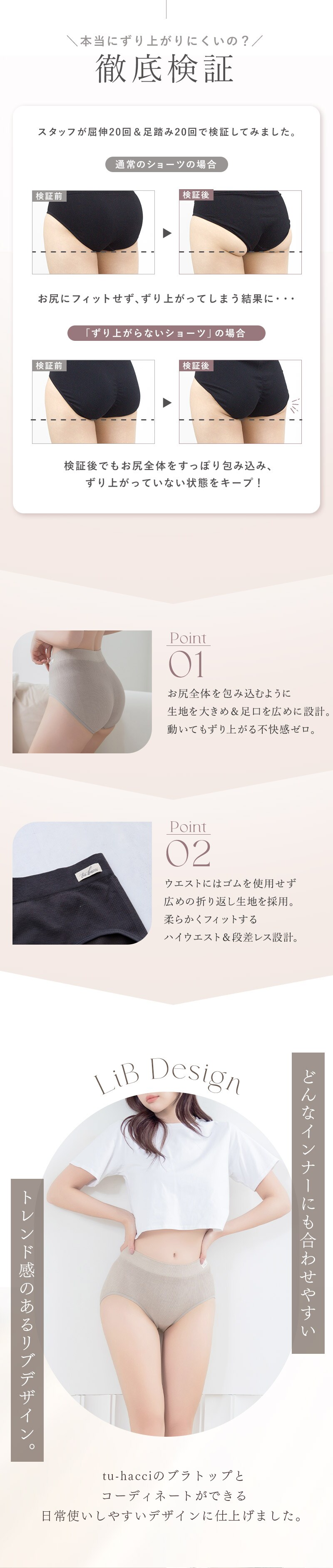 tu-hacci Shorts Collection ショーツ単品 ずり上がるストレスから解放!モアフィットリブショーツ 家事も、仕事も、自分磨きも、現代女性は忙しいからこそ。 どんなインナーにも合わせやすく、ストレスフリーなショーツをご提案。 【こんな方におすすめ】 ・ショーツのずり上がりをストレスに感じる ・ショーツを履いたときのウエストの段差が気になる ・インナーとのコーディネートも大事にしたい ■ズレいにくいからノンストレス ・広めの足口設計が動きにしっかり対応し、ずり上がりにくい ・お尻をすっぽりホールド ・ウエストゴム不使用で柔らかいフィット感 ・ハイウエスト設計でウエストが段差になりにくい トレンド感のあるリブデザインで どんなインナーにも合わせやすく、日常使いにぴったり◎ \こちらと一緒に着用いただけます/ 美胸に整えるブラトップ ・リブキャミソール 胸元カバータイプ ・リブキャミソール 浅V3WAYタイプ ・リブキャミソール 浅Vタイプ ※一部取り扱いのないカラーがございます。 |