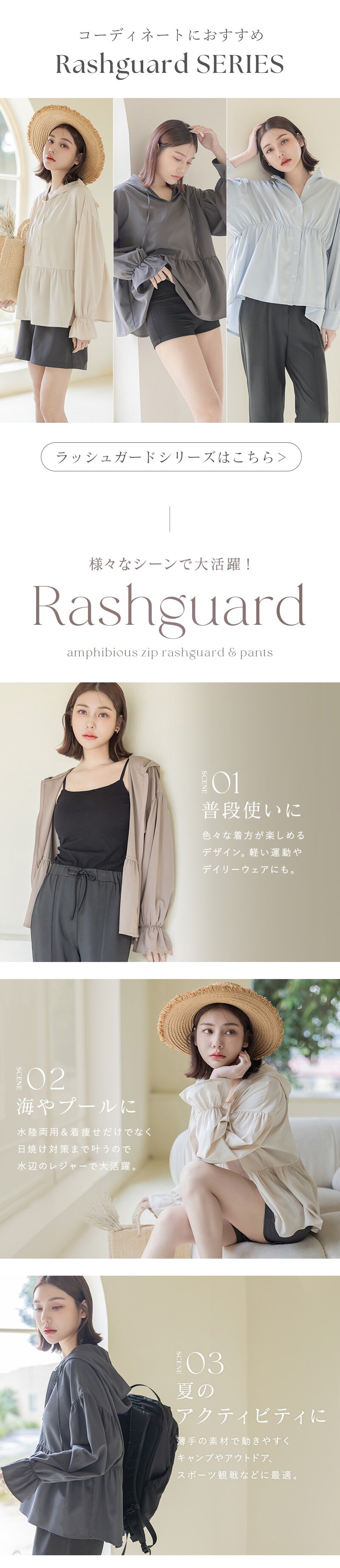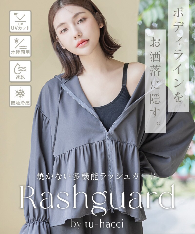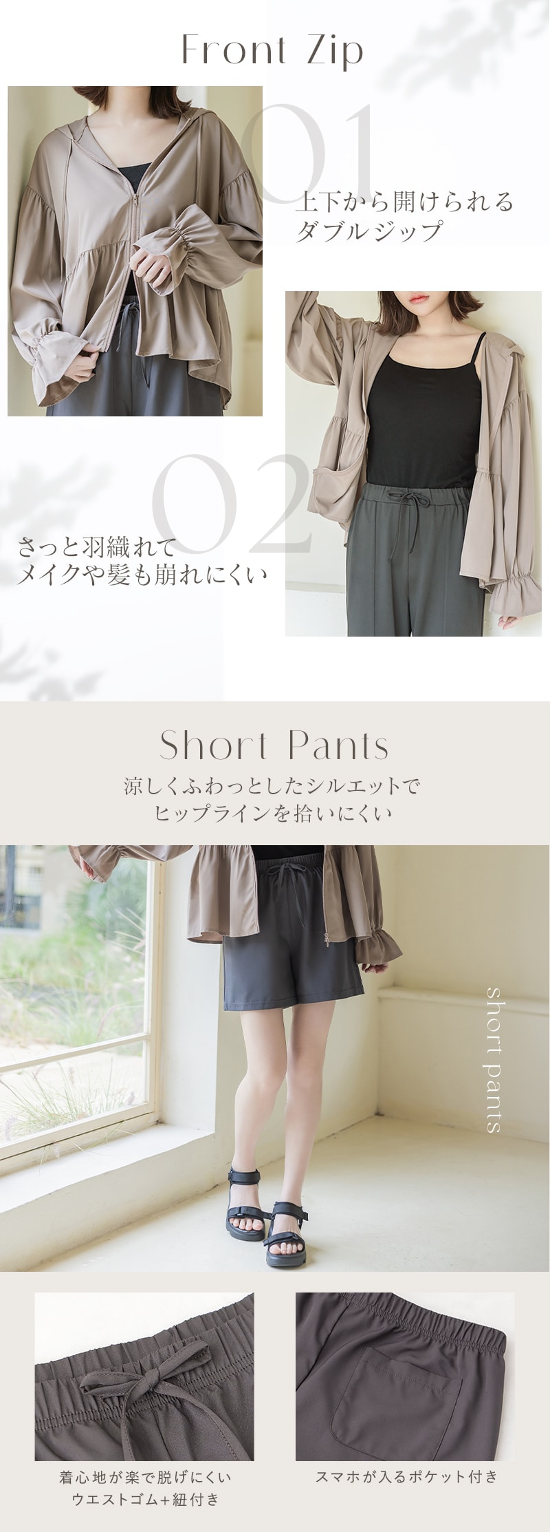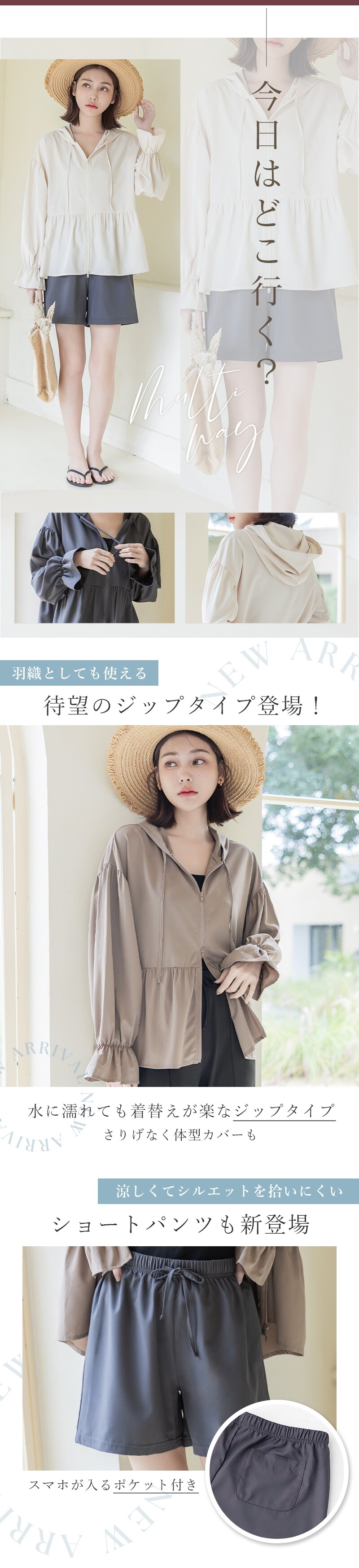 tu-hacci rash guard Collection ラッシュガード&パンツ / 計2点セット 着回ししやすく、様々なシーンで大活躍!華奢見えラッシュガード。 スタイリッシュさと多機能性を兼ね備えた、究極の一着。 フード付きで首の日焼け対策もできるのが嬉しいポイント。 やわらかな素材が快適な着心地を提供し、UVカット機能で肌をしっかりガード。 汗をかいてもサラッと快適な接触冷感で、蒸し暑い季節もより蒸れにくく快適に。 肩落ちシルエットで華奢見えが叶い、袖は手の甲までしっかりカバー。 バックスタイルも計算された絶妙な丈感で、どこから見ても美しいシルエットに。 フロントジップだから、さっと羽織れてメイクや髪も崩れにくく、 上下から開けられるダブルジップで様々な着こなしを楽しめます。 お揃いショートパンツは、涼しくてふんわりとしたシルエットでヒップラインを拾いにくい仕様に。 ウエストはゴム+紐付きで、快適な着心地と脱げにくくて安心のフィット感を実現。 スマートフォンがすっぽり収まるサイズのポケット付きだから、持ち運びにも便利◎ |