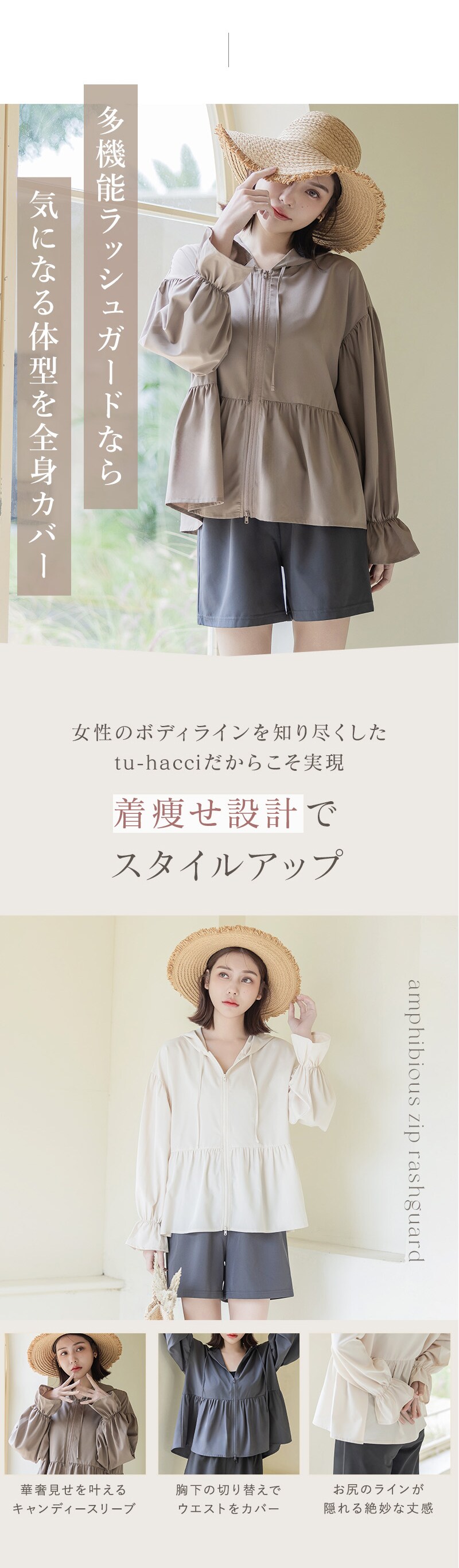 水陸両用ラッシュガードジップパーカー&ショートパンツ 紫外線対策 日焼け防止 UVカット 体型カバー 速乾 長袖 おしゃれ 上下セット【tu-hacci】 M モカ