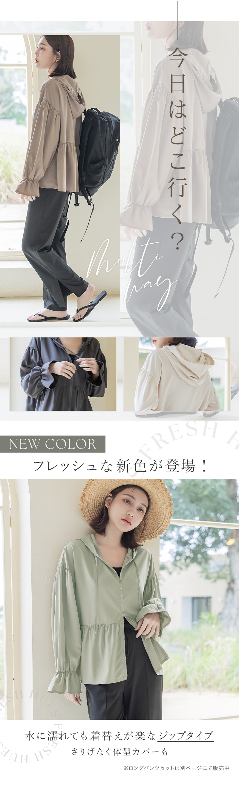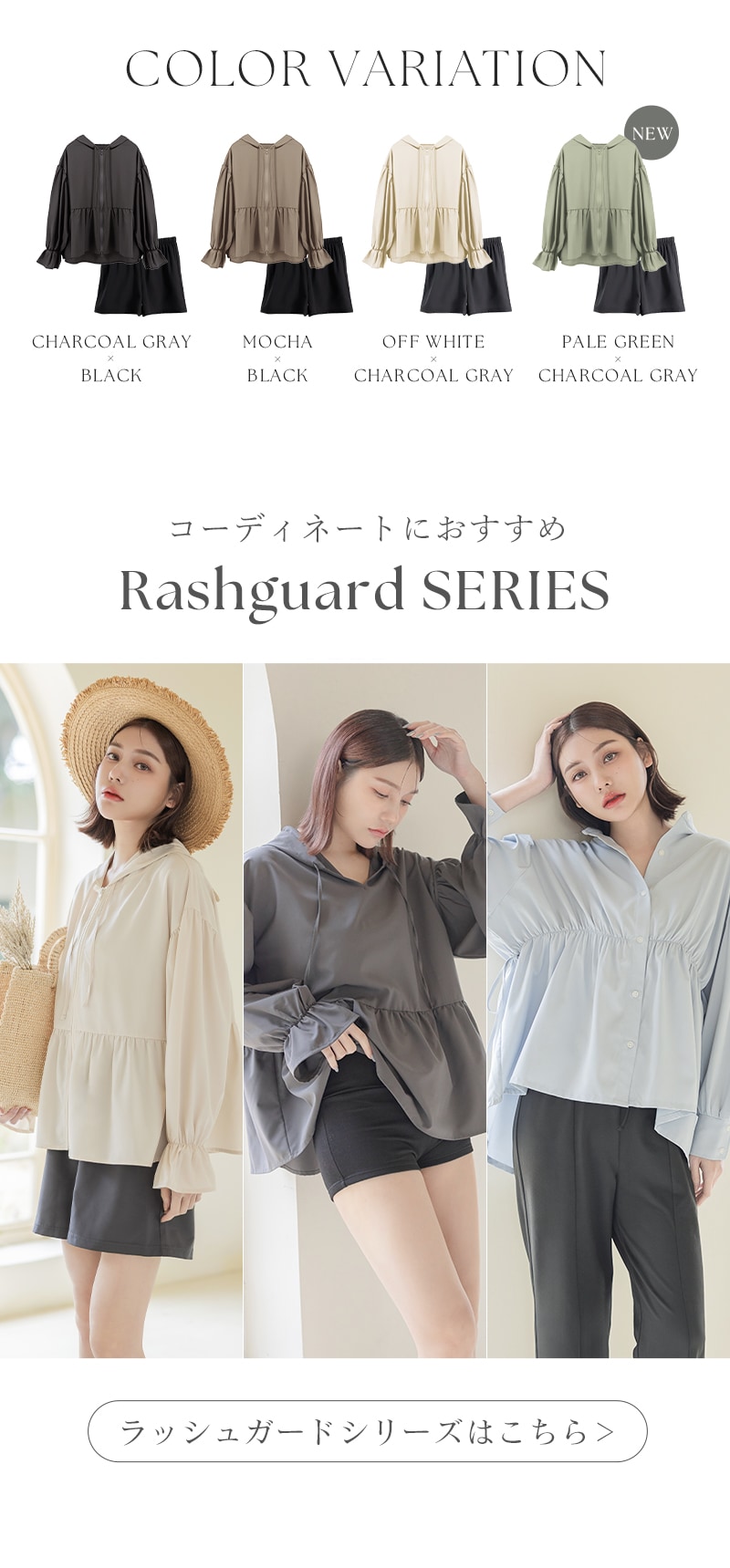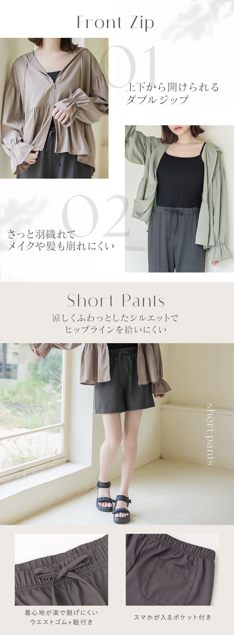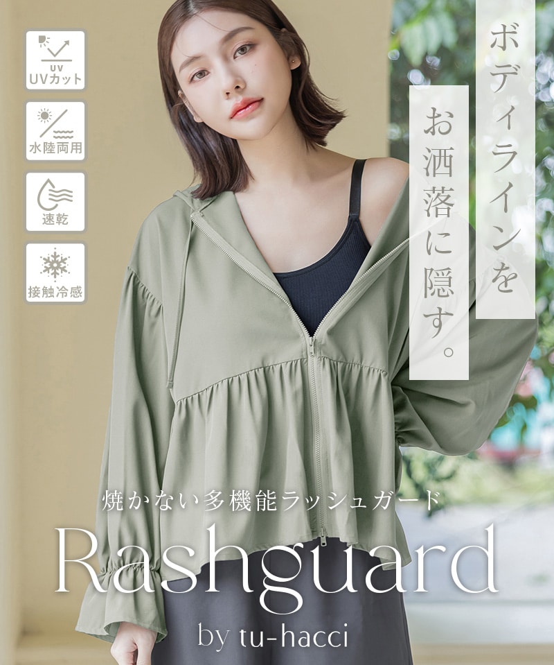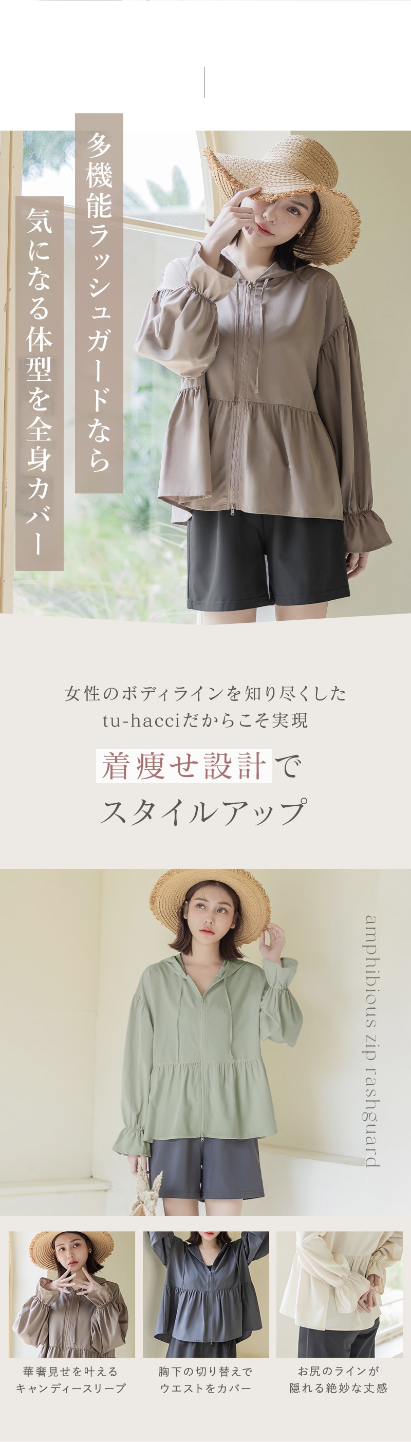 tu-hacci rash guard Collection ラッシュガード&パンツ / 計2点セット 着回ししやすく、様々なシーンで大活躍!華奢見えラッシュガード。 スタイリッシュさと多機能性を兼ね備えた、究極の一着。 フード付きで首の日焼け対策もできるのが嬉しいポイント。 やわらかな素材が快適な着心地を提供し、UVカット機能で肌をしっかりガード。 汗をかいてもサラッと快適な接触冷感で、蒸し暑い季節もより蒸れにくく快適に。 肩落ちシルエットで華奢見えが叶い、袖は手の甲までしっかりカバー。 バックスタイルも計算された絶妙な丈感で、どこから見ても美しいシルエットに。 フロントジップだから、さっと羽織れてメイクや髪も崩れにくく、 上下から開けられるダブルジップで様々な着こなしを楽しめます。 お揃いショートパンツは、涼しくてふんわりとしたシルエットでヒップラインを拾いにくい仕様に。 ウエストはゴム+紐付きで、快適な着心地と脱げにくくて安心のフィット感を実現。 スマートフォンがすっぽり収まるサイズのポケット付きだから、持ち運びにも便利◎ |