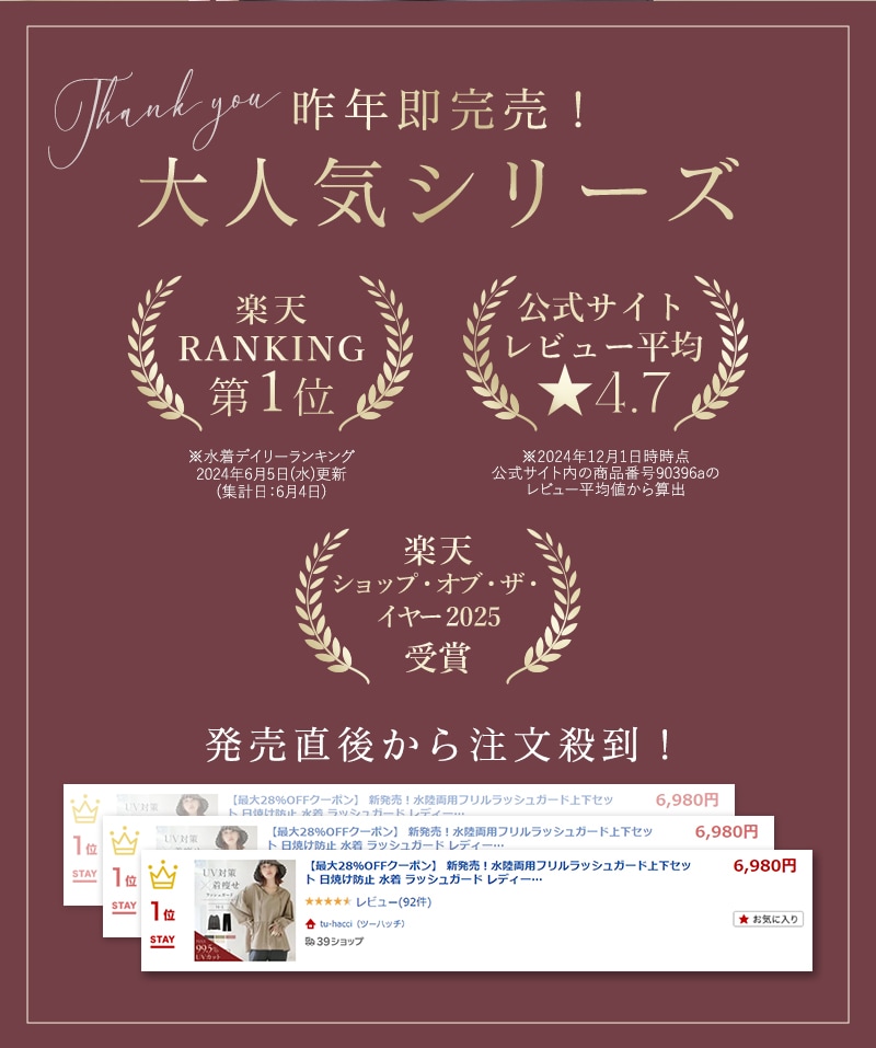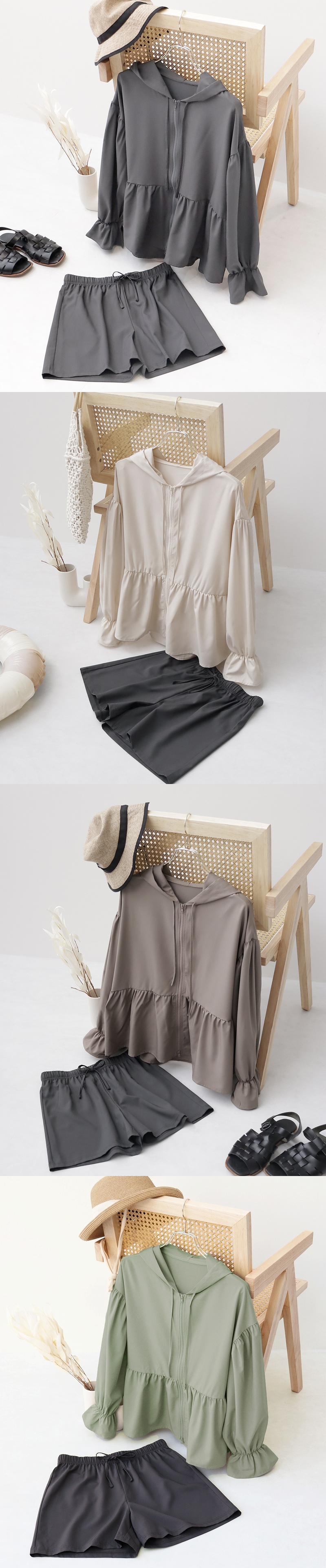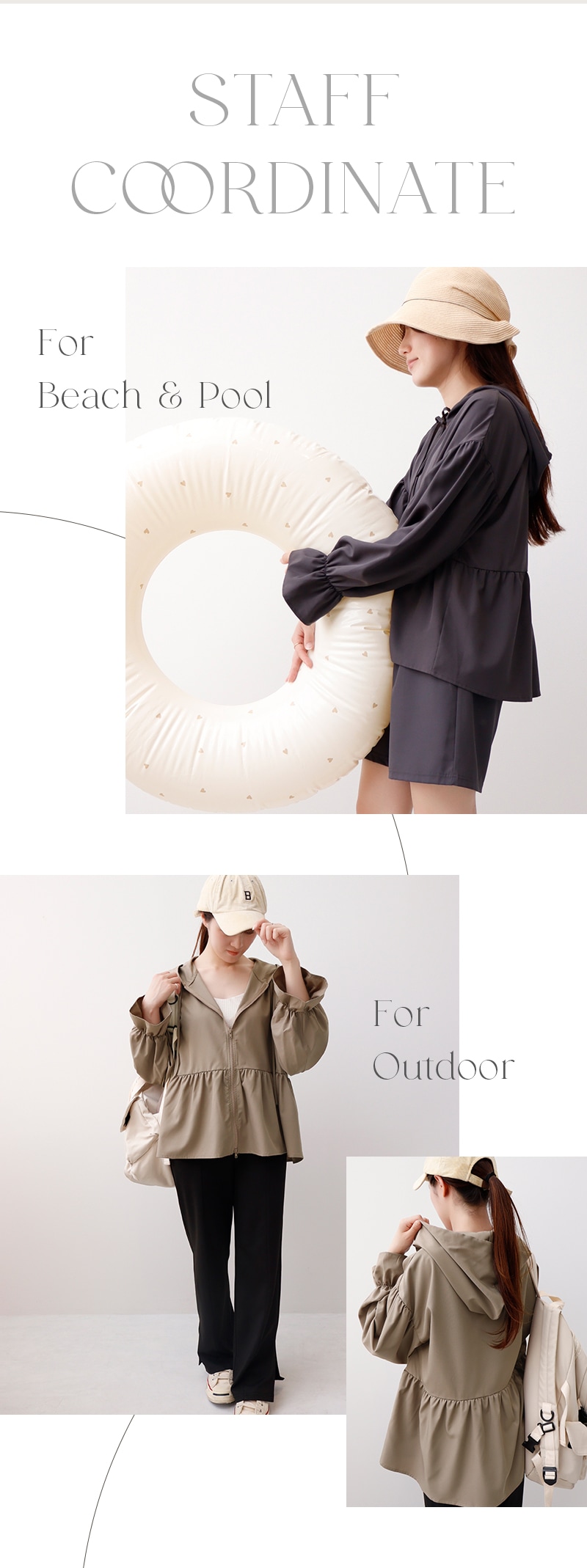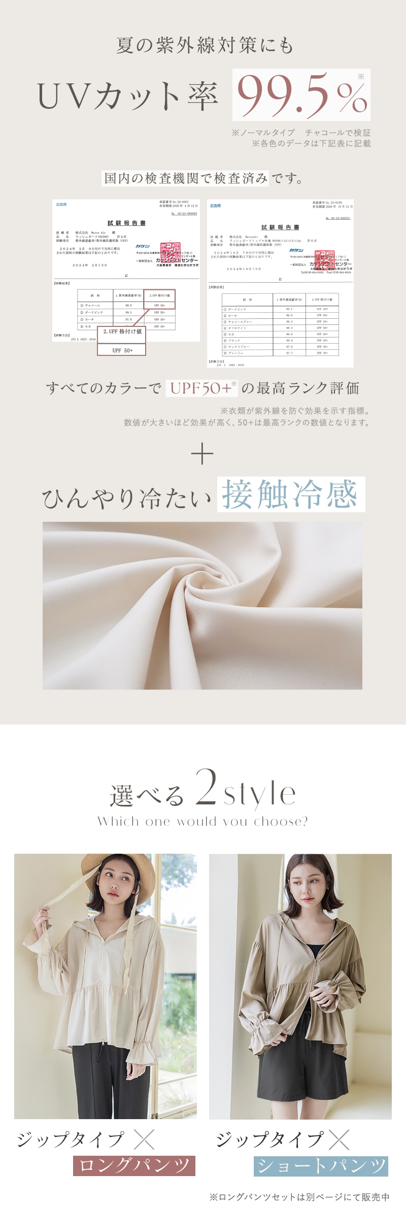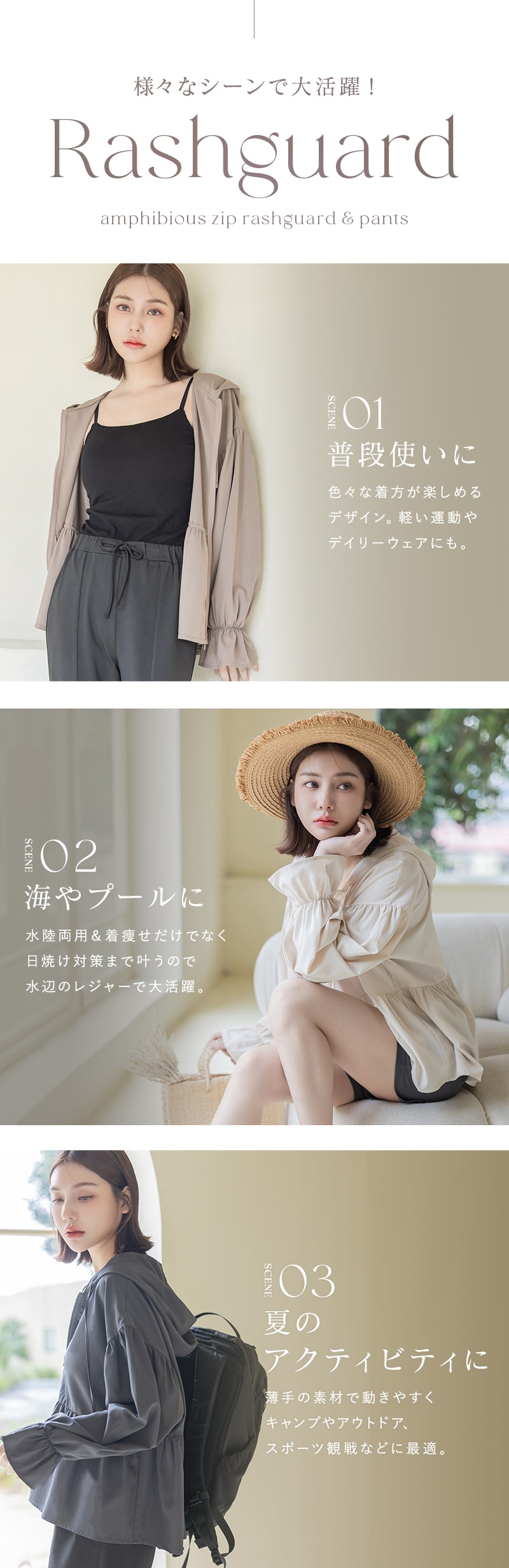 tu-hacci rash guard Collection ラッシュガード&パンツ / 計2点セット 着回ししやすく、様々なシーンで大活躍!華奢見えラッシュガード。 スタイリッシュさと多機能性を兼ね備えた、究極の一着。 フード付きで首の日焼け対策もできるのが嬉しいポイント。 やわらかな素材が快適な着心地を提供し、UVカット機能で肌をしっかりガード。 汗をかいてもサラッと快適な接触冷感で、蒸し暑い季節もより蒸れにくく快適に。 肩落ちシルエットで華奢見えが叶い、袖は手の甲までしっかりカバー。 バックスタイルも計算された絶妙な丈感で、どこから見ても美しいシルエットに。 フロントジップだから、さっと羽織れてメイクや髪も崩れにくく、 上下から開けられるダブルジップで様々な着こなしを楽しめます。 お揃いショートパンツは、涼しくてふんわりとしたシルエットでヒップラインを拾いにくい仕様に。 ウエストはゴム+紐付きで、快適な着心地と脱げにくくて安心のフィット感を実現。 スマートフォンがすっぽり収まるサイズのポケット付きだから、持ち運びにも便利◎ |