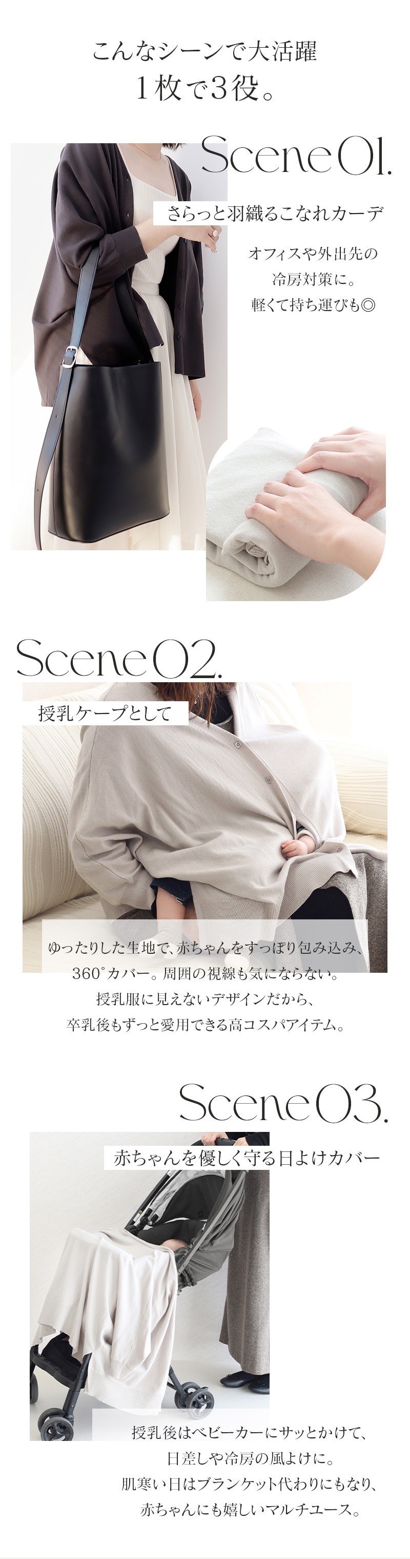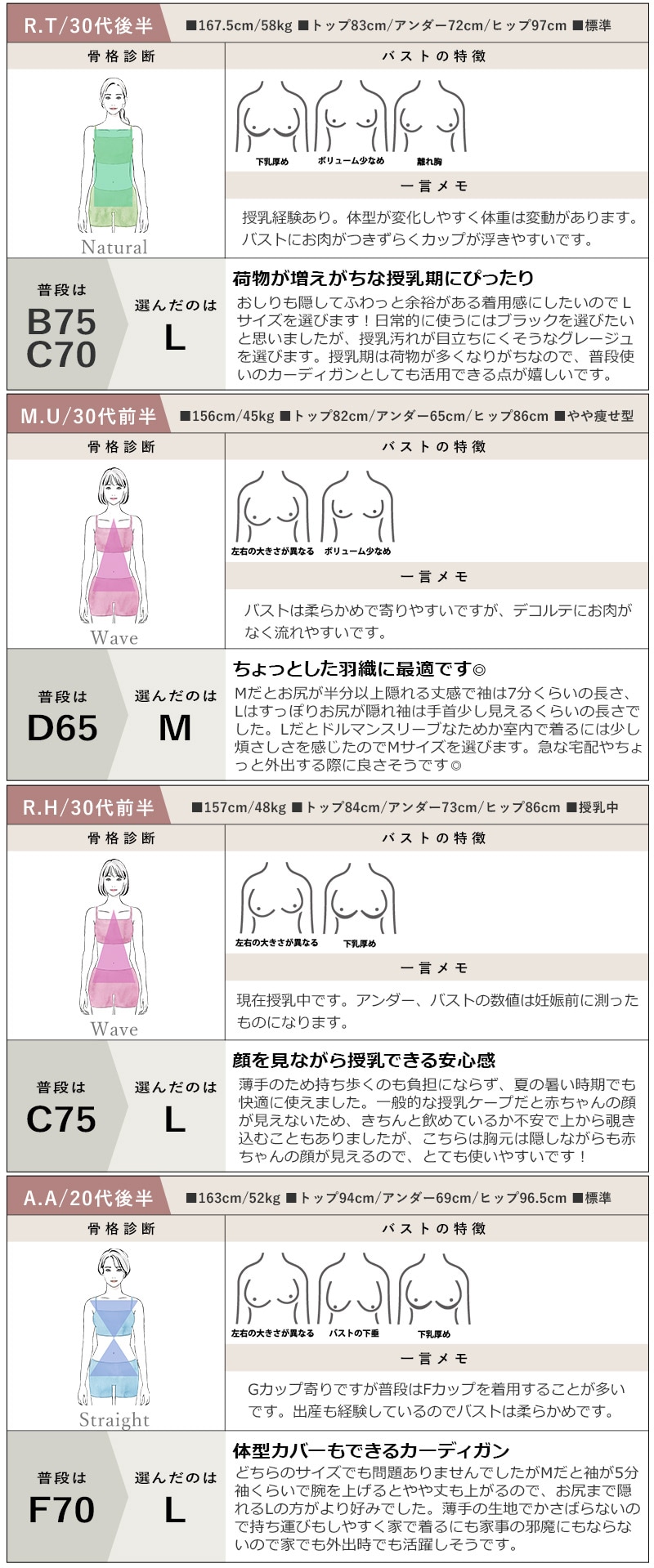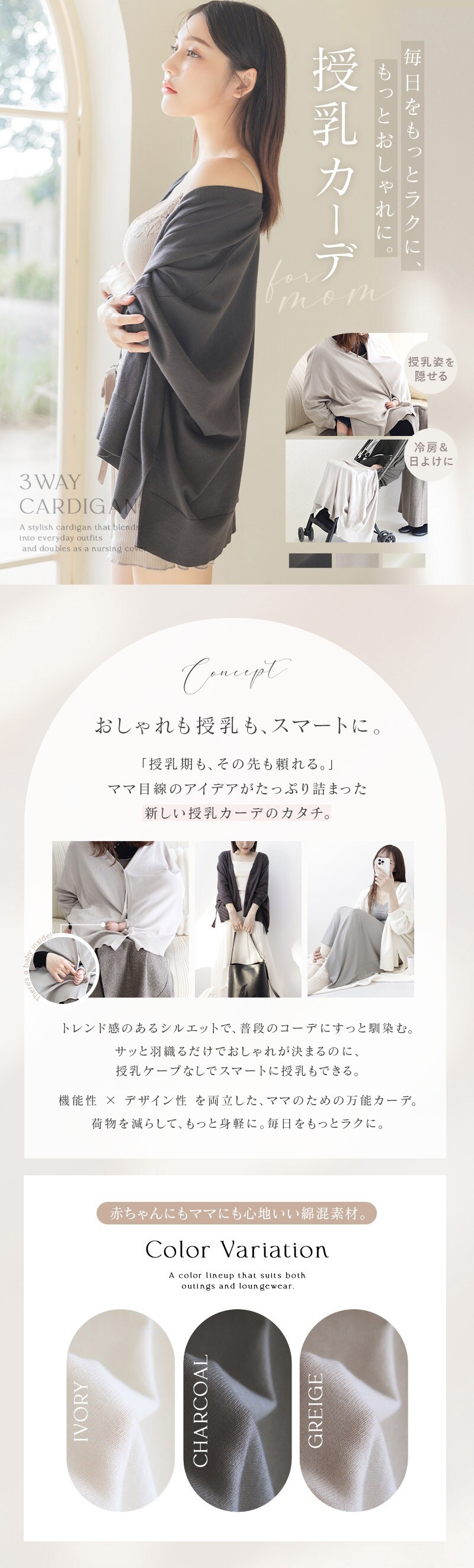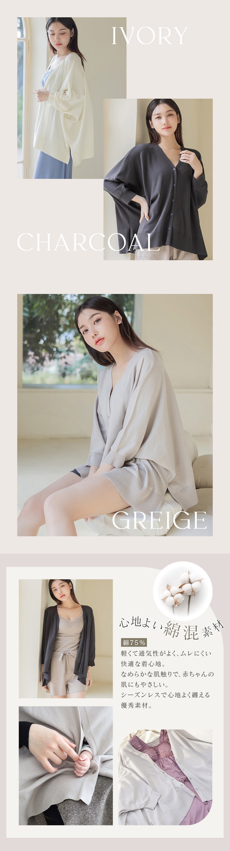 アイボリーのみ、授乳カーディガンとしてお使いの際、赤ちゃんを包み込む動きによって生地がやや透ける場合がございます。