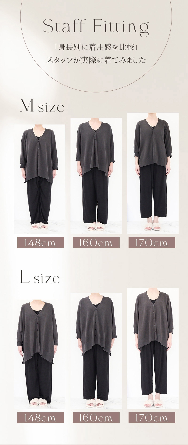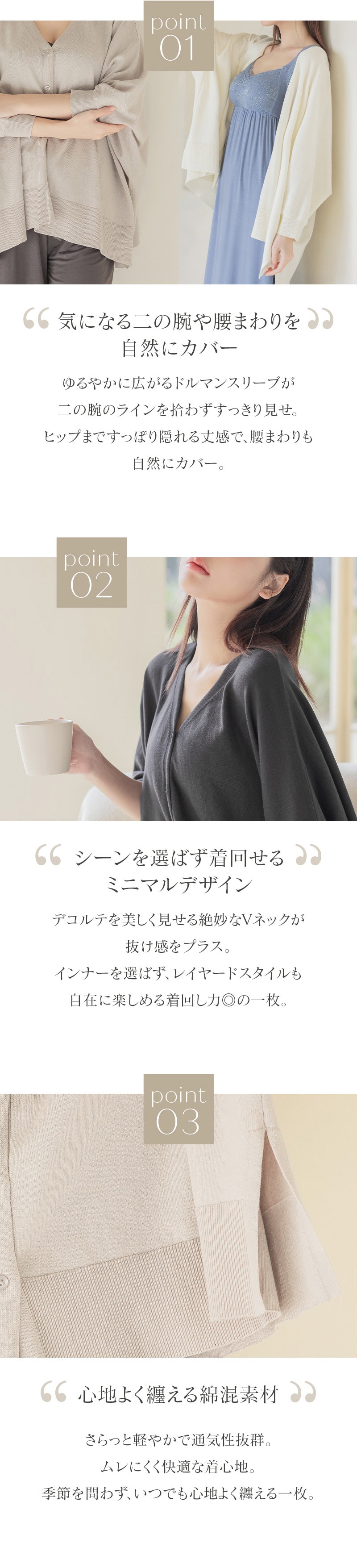 ドルマンスリーブが二の腕を包み込み、お尻が隠れる絶妙な丈感が、体型をナチュラルにカバー。