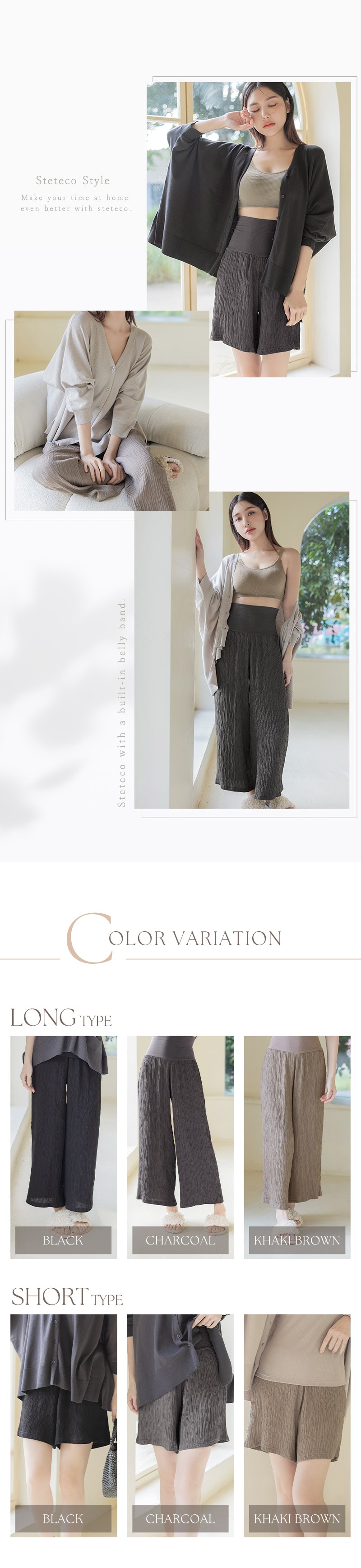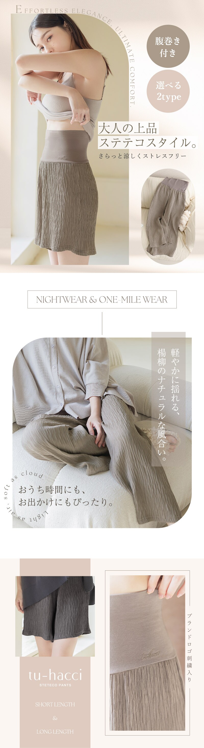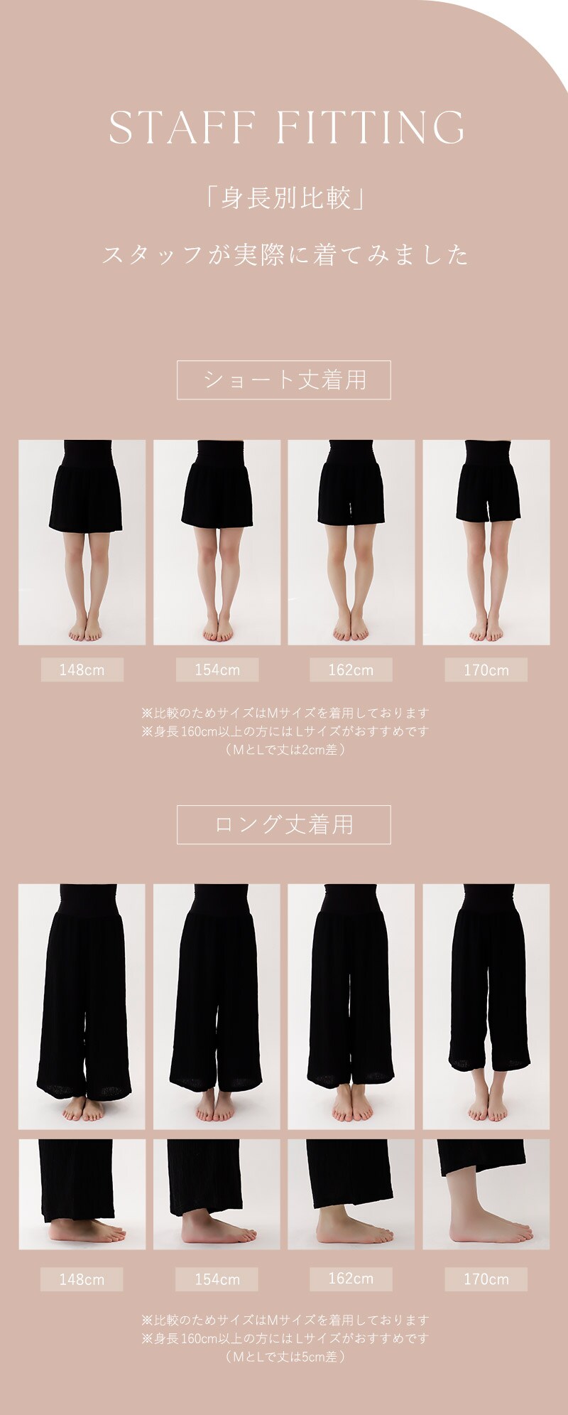 見た目も涼しいショート丈と体型カバーが叶うロング丈は、どちらもリラックスウェアとしてはもちろん、ショートパンツ、ワイドパンツ感覚でちょっとしたお出かけにも◎