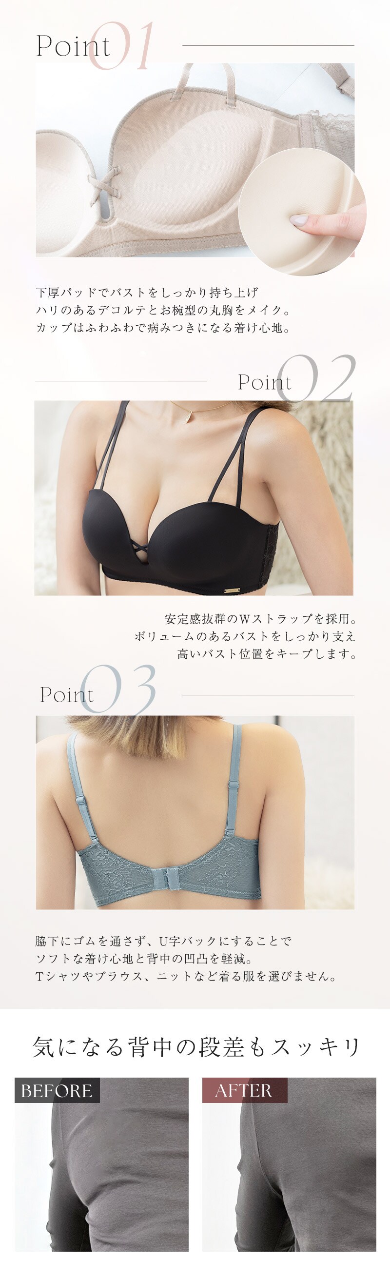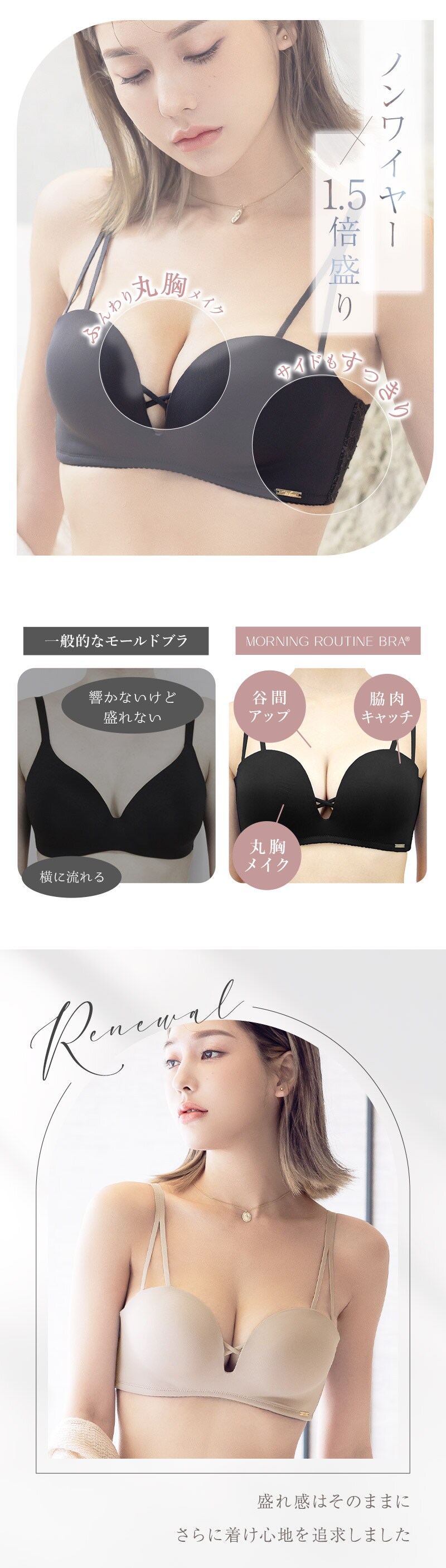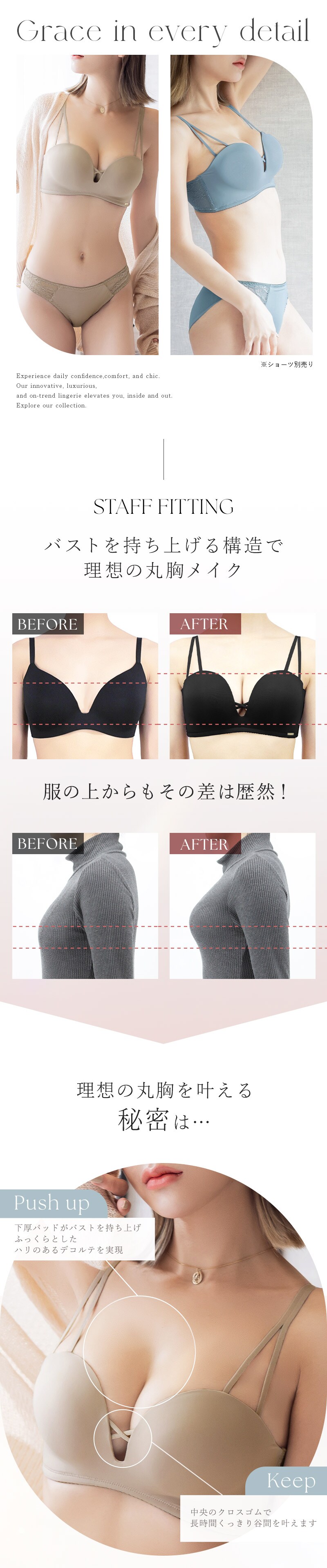 1.5倍盛りを叶える クロスアップブラ 素敵な一日の始まりは下着選びから。 どんな朝も思わず手に取りたくなるランジェリー。 細部までこだわり抜いた贅沢デザインに、バストメイク機能を限りなく詰め込んで。 毎日に彩りを与え、気持ちを高めたい女性へ贈るシリーズです。 ノンワイヤーでつくりだす魅惑的な谷間。 シンプルでモダンなデザインはノーブルな佇まい。 中央のクロスコードは、美しいボディシルエットを加速させます。 ■こんな方におすすめ ・ワイヤーの窮屈感や痛いのが苦手 ・バストにボリュームが欲しい ・産後のそげ胸に悩んでいる ・洋服にラインの響かない下着を探している ■盛れるノンワイヤー 下厚パッドがバスト持ち上げ、ふっくらとしたデコルテと丸胸を実現。 安定感のあるWストラップがバストを支え、高さをキープ。 中央のクロスゴムで長時間くっきり谷間をメイク。 ■洋服に響かない プレーンなモールドカップでシルエットが響きにくく、 Tシャツやブラウス、ニットなど着る服を選びません。 さらに脇下にゴムを通さず、U字バックで背中の段差も軽減。 ※常に商品改良を行っており、ご購入いただくタイミングにより仕様や着用感・色味が若干異なる場合がございます。 | |