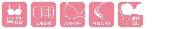 ストラップ取り外し:不可 ストラップ長さ調節:可 パッド:有(内蔵型) パッド取り外し:不可 ワイヤー:無 ホック:2段3列 透け感:なし |