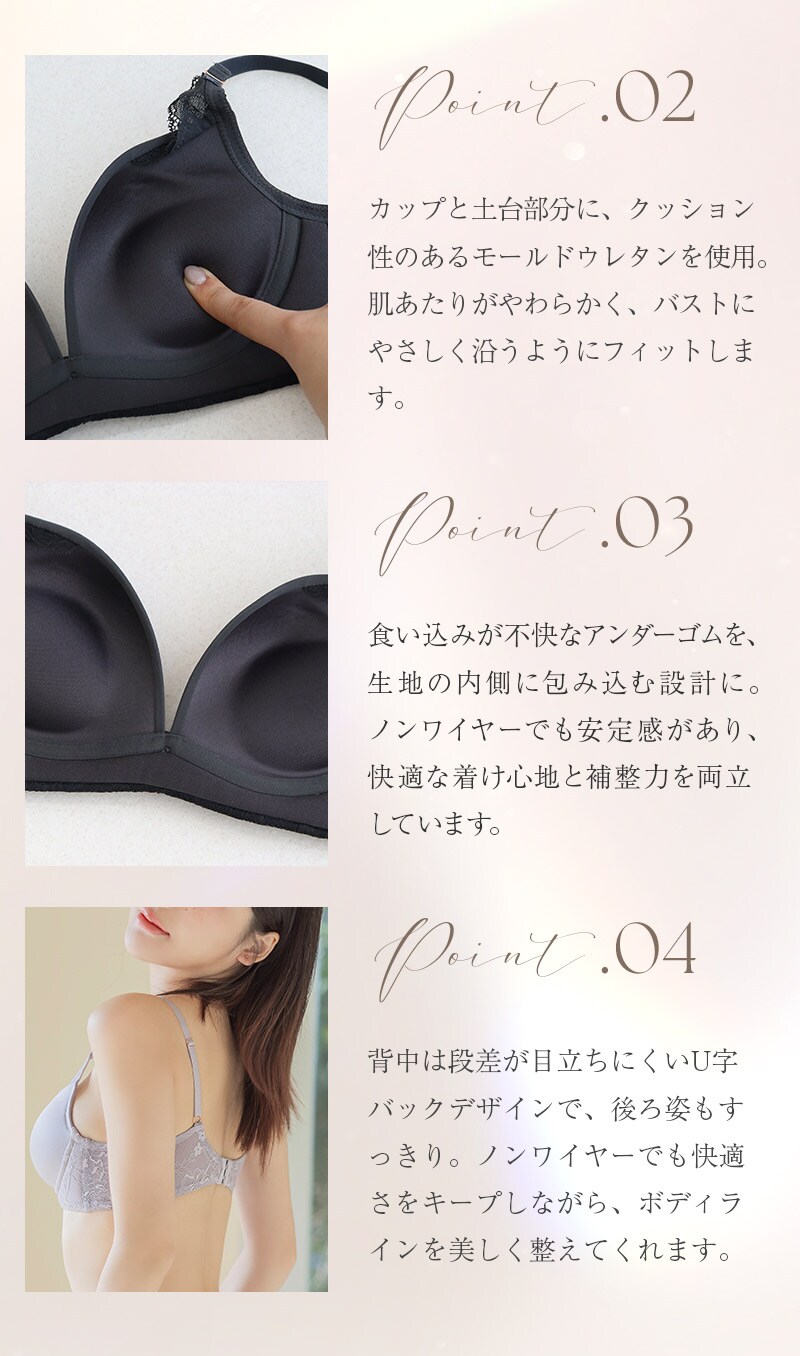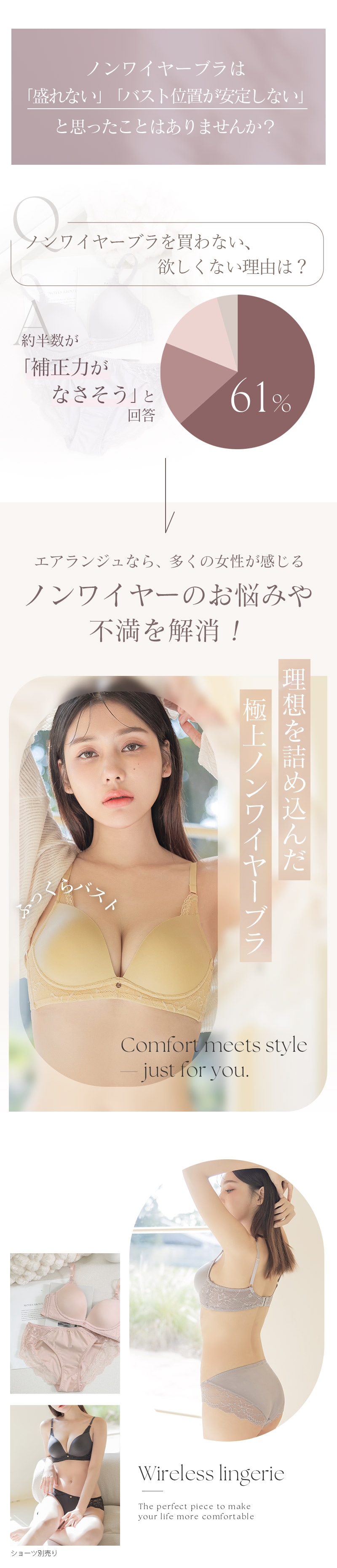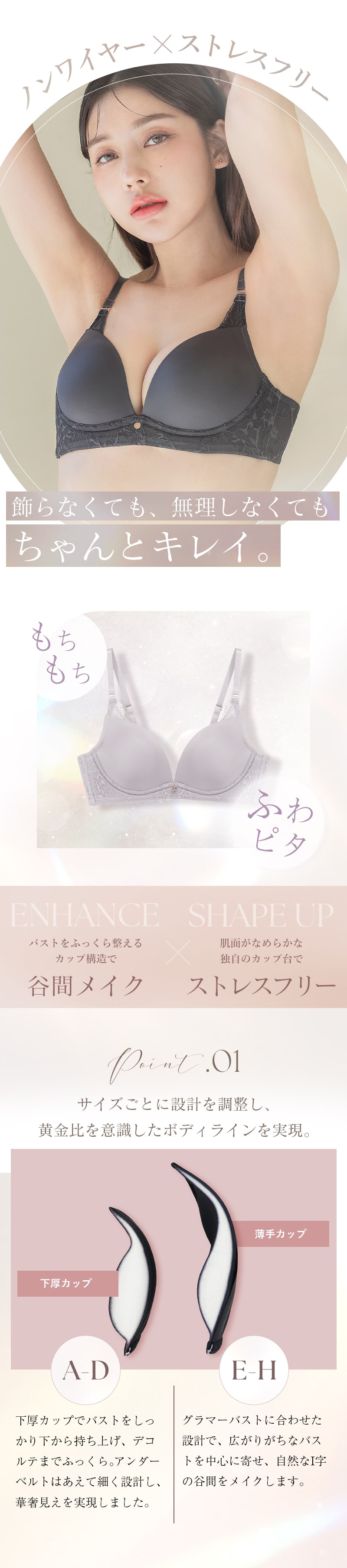 tu-hacci Bra Collection ブラ単品 軽い着け心地で、谷間メイクが叶う。 極上ワイヤレスブラ~Air Lange(エアランジュ)シリーズ~ ノンワイヤーで楽な着け心地なのに、きちんとスタイルアップ。 サイズごとにカップ設計を調整し、黄金比を意識したボディラインを実現します。 シンプルなデザインで服に響かずお洒落の邪魔をしない。 飾らなくても、無理しなくてもちゃんとキレイ。 新時代のワイヤレスブラシリーズです。 【商品の特徴】 ・バストの広がりを抑え、中央に寄せる設計でふっくら谷間メイク ・サイズに合わせたカップ設計で、バストの黄金比を実現 ・肌面がなめらかな独自のカップ台でストレスフリー ・段差が目立ちにくいU字バックデザイン 【こんな方におすすめ】 ・バストを盛って、全身をすっきり見せたい方 ・ノンワイヤーでも、スタイルアップを叶えたい方 ・自然な高さのあるバストメイクをしたい方 |