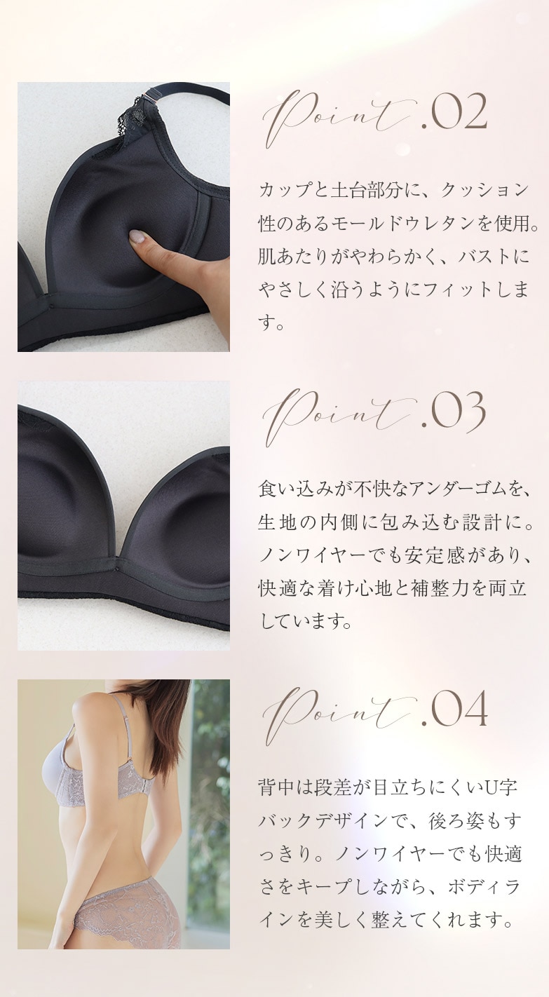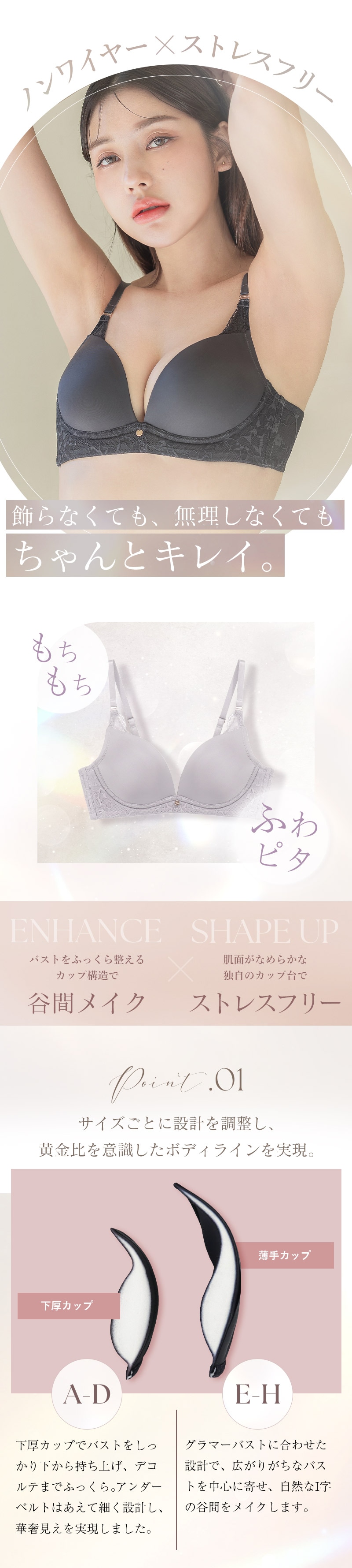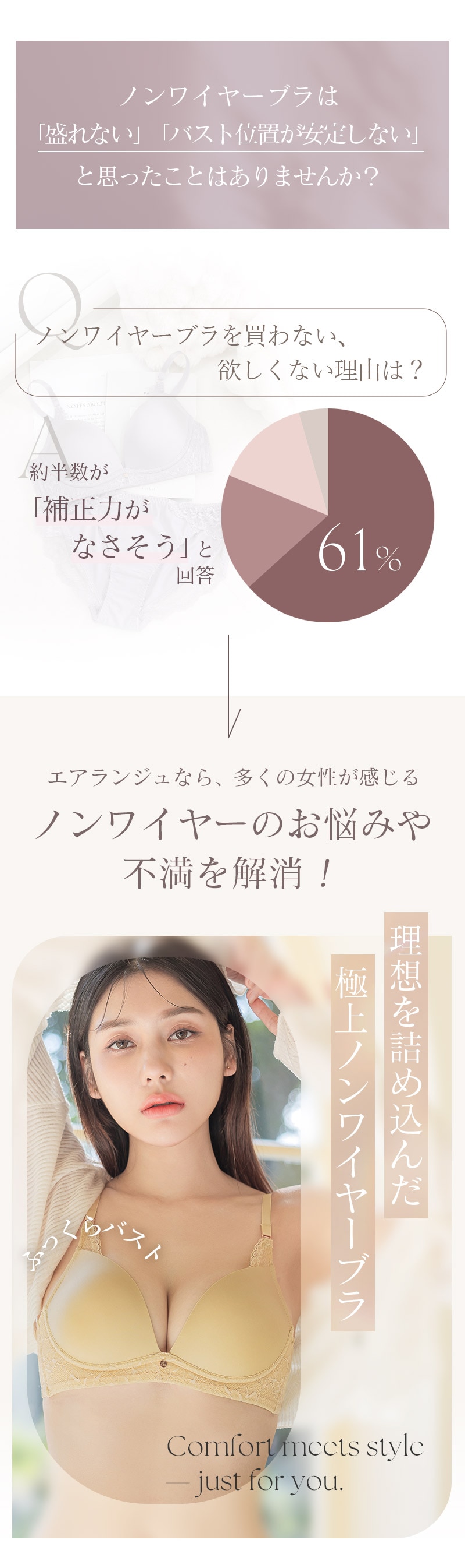 tu-hacci Bra&Shorts Collection ブラ&ショーツ / 計2点セット 軽い着け心地で、谷間メイクが叶う。 極上ワイヤレスブラ~Air Lange(エアランジュ)シリーズ~ ノンワイヤーで楽な着け心地なのに、きちんとスタイルアップ。 サイズごとにカップ設計を調整し、黄金比を意識したボディラインを実現します。 シンプルなデザインで服に響かずお洒落の邪魔をしない。 飾らなくても、無理しなくてもちゃんとキレイ。 新時代のワイヤレスブラシリーズです。 選べる2タイプのショーツは ベーシックなフルバックと、ラインが出にくく快適なレースバックタイプ。 【商品の特徴】 ・バストの広がりを抑え、中央に寄せる設計でふっくら谷間メイク ・サイズに合わせたカップ設計で、バストの黄金比を実現 ・肌面がなめらかな独自のカップ台でストレスフリー ・段差が目立ちにくいU字バックデザイン 【こんな方におすすめ】 ・バストを盛って、全身をすっきり見せたい方 ・ノンワイヤーでも、スタイルアップを叶えたい方 ・自然な高さのあるバストメイクをしたい方 |