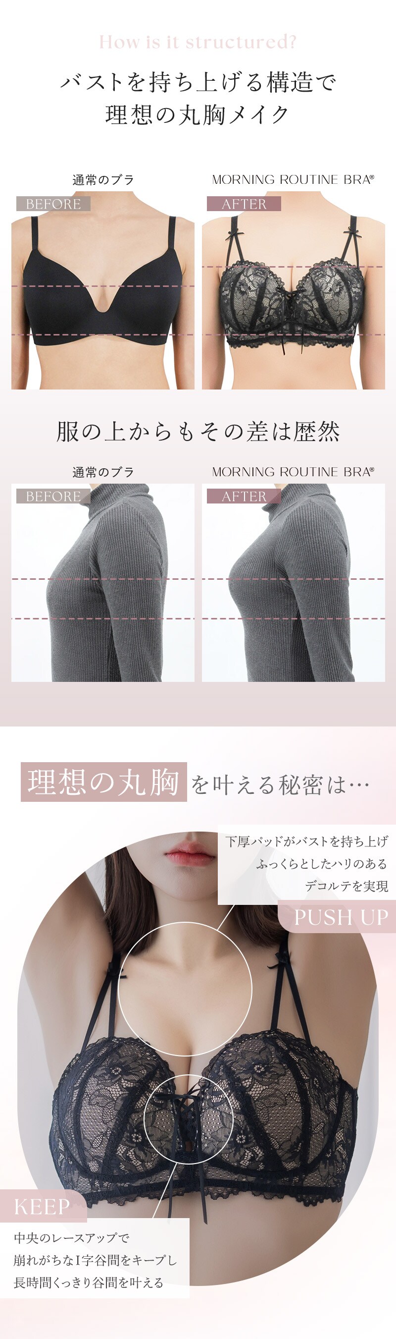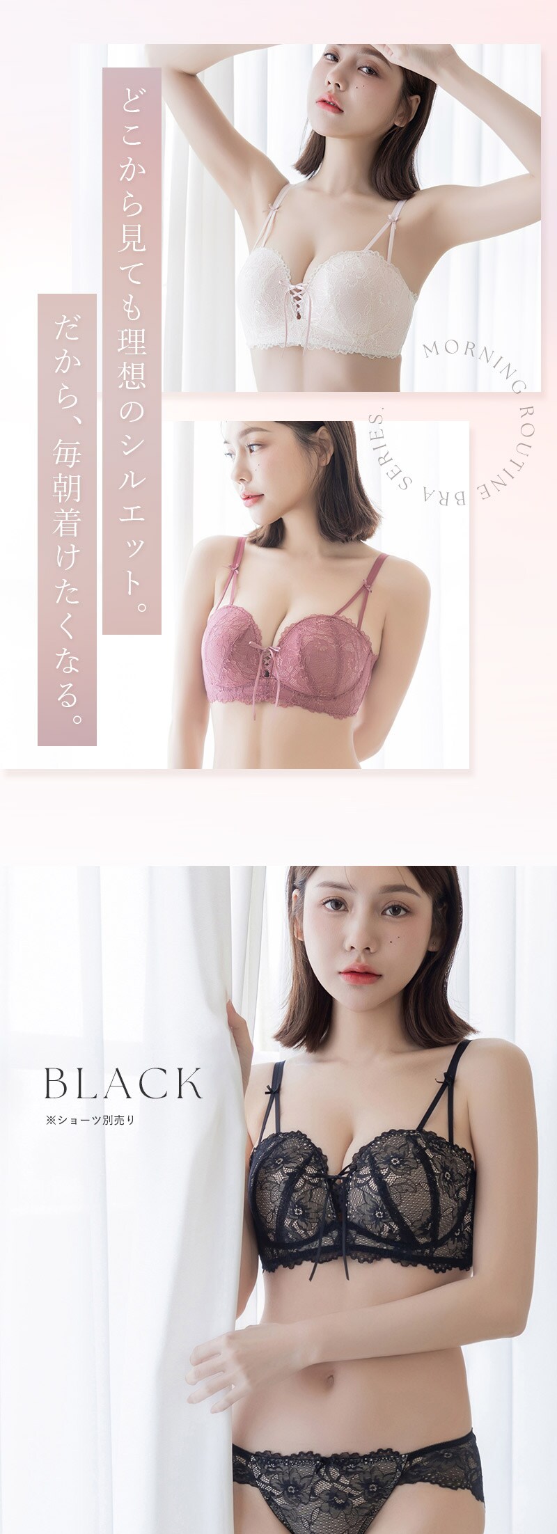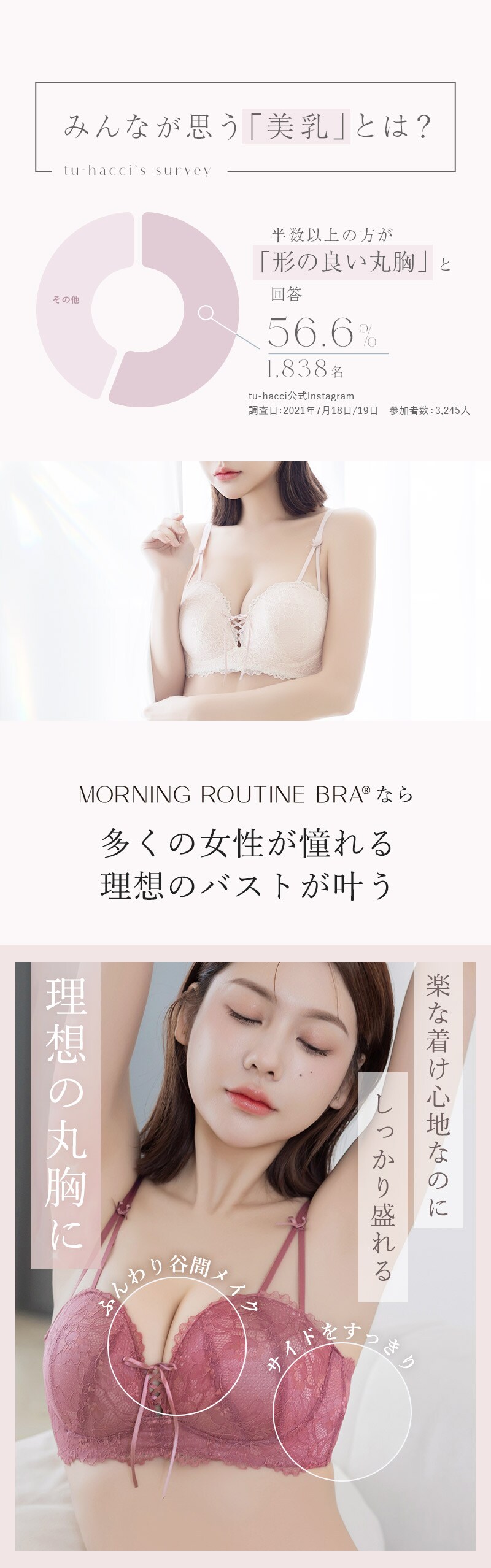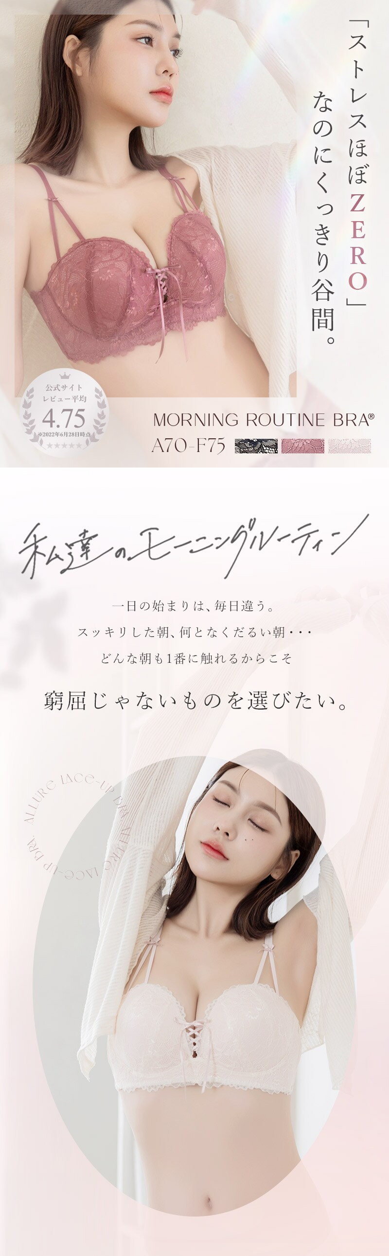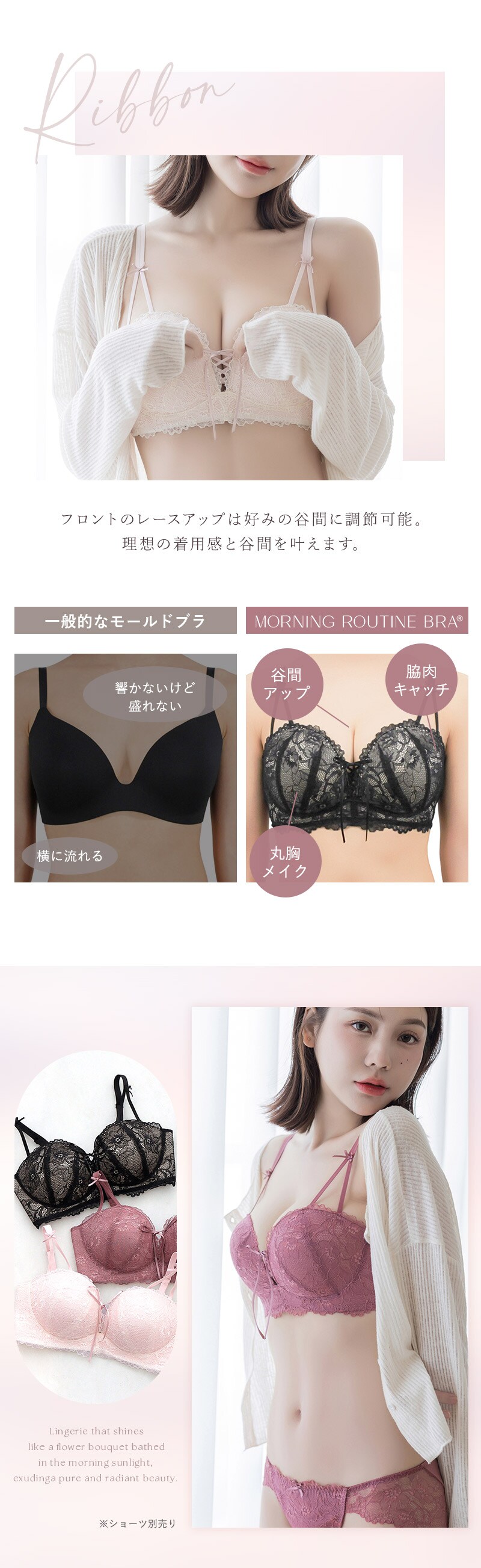 tu-hacci Bra Collection ブラ単品 tu-hacciノンワイヤーブラ人気No.1 ~Morning Routine(モーニングルーティン)シリーズ~ 胸元のリボンが華やかさを演出する アリュールレースアップブラ tu-hacci不動の人気〈モーニングルーティンシリーズ〉に谷間調整のできるモールドブラが仲間入り。 ストレスフリーな着け心地と洗練されたデザインで、1日の始まりを彩ります。 ふとした仕草までも、美しく映るように。 素肌にそっと寄り添い、品のある魅力を宿します。 【こんな方におすすめ】 ・ワイヤーの締めつけ感が苦手 ・バストにふんわり丸みが欲しい ・産後のそげ胸やボリュームダウンが気になる ■ノンワイヤーでふんわり丸胸メイクを叶える ・下厚パッドがバストを持ち上げ、デコルテふっくら ・安定感抜群のWストラップでバスト位置をキープ ・ノンワイヤーだから「ストレスほぼZERO」なのに、くっきり谷間 ・脇高設計×U字バックで、背中や脇もすっきり ・バックベルト肌側に搭載したパワーネットで、しっかりホールド ※ ※Eカップ以上のサイズのみ ■「盛り感」自由自在 ・中央のリボンでお好みの谷間に調整できる ・レースアップが崩れがちなI字谷間をキープ ・2段4列のホックを採用 |