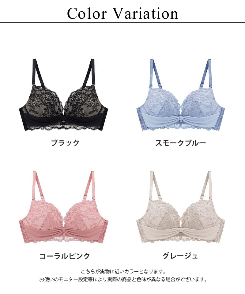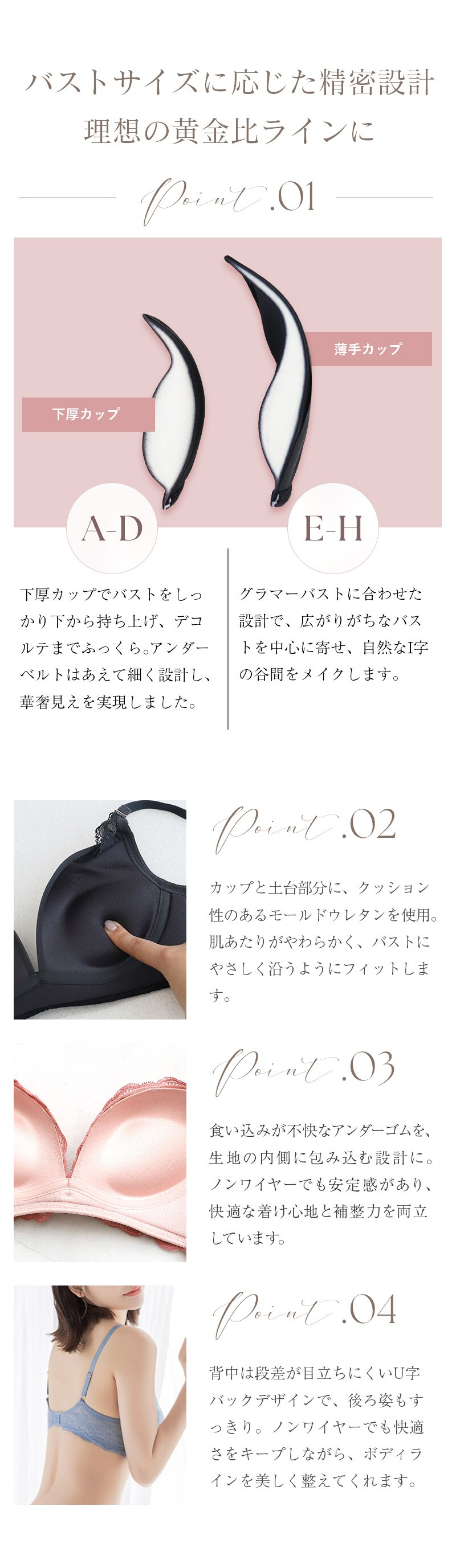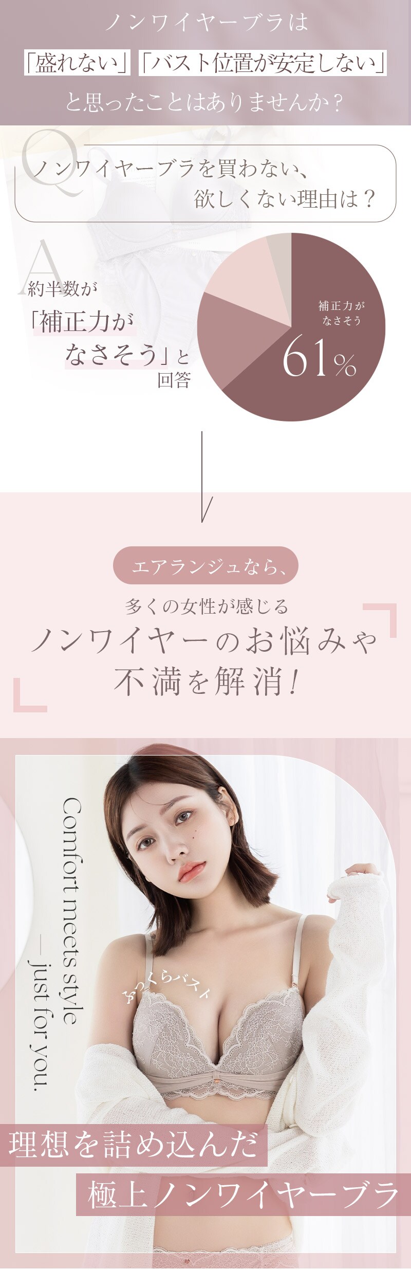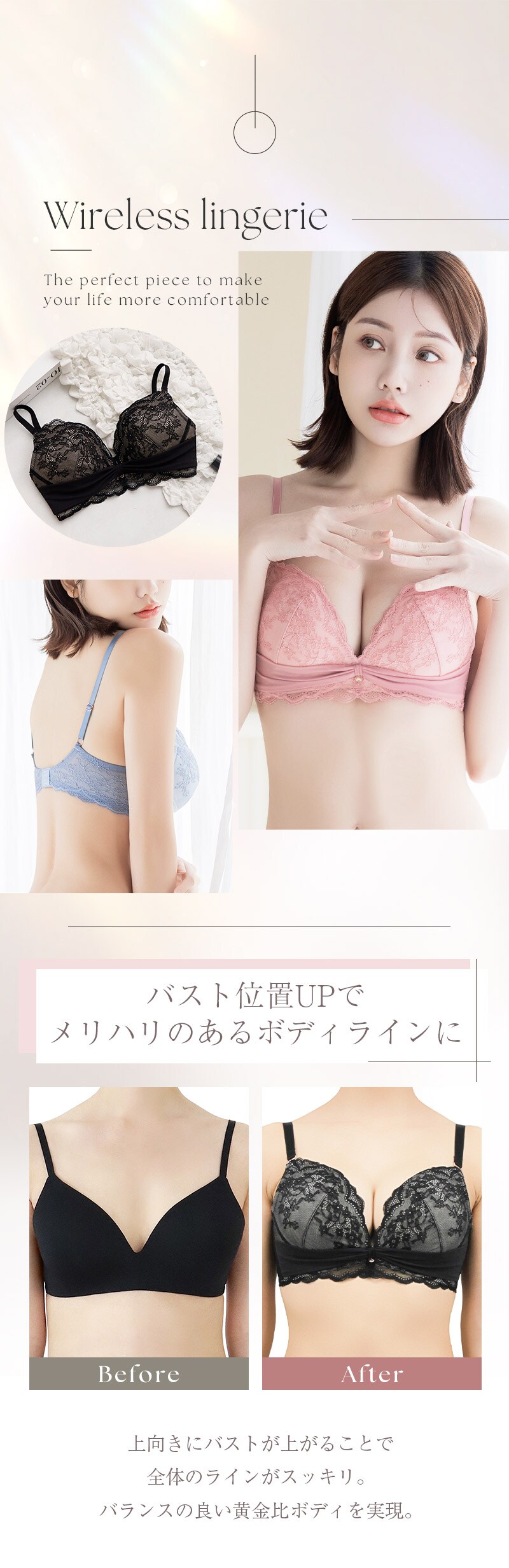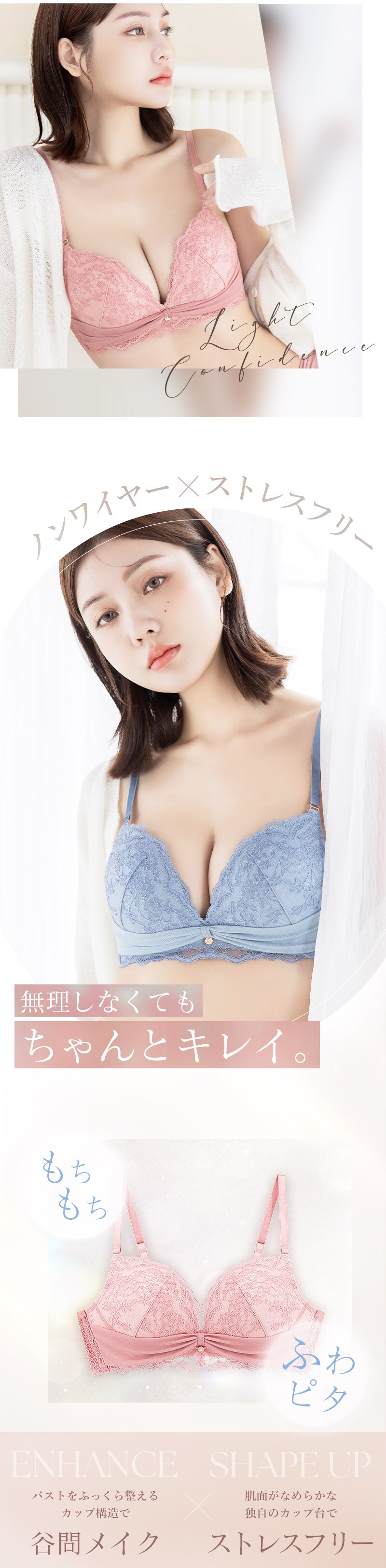 tu-hacci Bra Collection ブラ単品 軽い着け心地で、谷間メイクが叶う。 極上ワイヤレスブラ~Air Lange(エアランジュ)シリーズ~ 日常に愛らしさをともす、ラヴィーナブラ ノンワイヤーで楽な着け心地なのに、きちんとスタイルアップ。 サイズごとにカップ設計を細かく調整し、黄金比を意識した理想のボディラインへ。 ふれるたび、気持ちまでやさしくほどけていく。 繊細なレースがそっと肌になじみ、まるで深呼吸するように、心までふんわりと軽くなる。 それは、ひとひらの花を纏うような感覚。 自分を大切にしたい朝も、少しだけ自信がほしい夜も――。 いつもの私に、そっと、ときめきを灯してくれる一着です。 【こんな方におすすめ】 ・バストにふんわり丸みを持たせて、全体をすっきり見せたい方 ・ノンワイヤーの楽さと、美しいスタイルアップを両立させたい方 ・バストの高さと自然な丸み、どちらも叶えたい方 ■ふっくら盛ってすっきり整える ・バストの横広がりを抑え、中央に寄せる設計で自然な谷間メイク ・サイズに合わせたカップ採用で、バストの黄金比を実現 ・肌面がなめらかな独自のカップ台で自然な上向きバストに ・U字バックデザインで背中もすっきり |