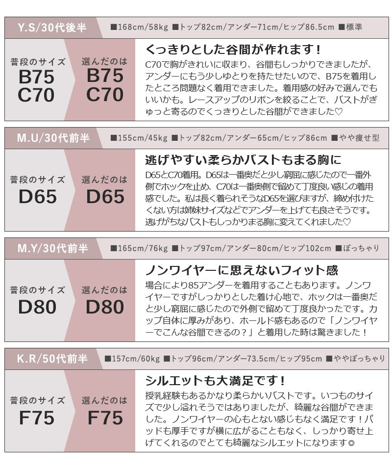 ストラップ取り外し:不可 ストラップ長さ調節:可 パッド:あり(内蔵型) パッド取り外し:不可 ワイヤー:なし ホック:2段3列 |