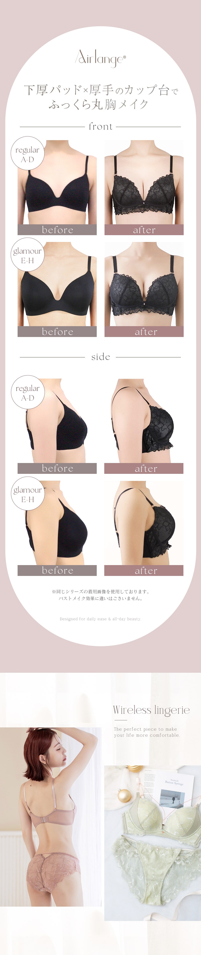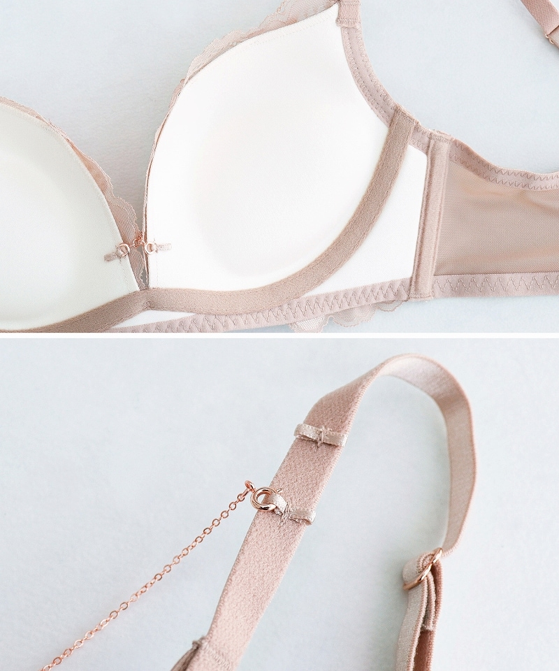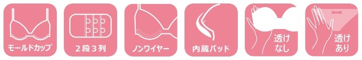 ストラップ取り外し:不可 ストラップ長さ調節:可 パッド:有(内蔵型) パッド取り外し:不可 ワイヤー:無 ホック:2段3列 透け感:ショーツ:バックあり |