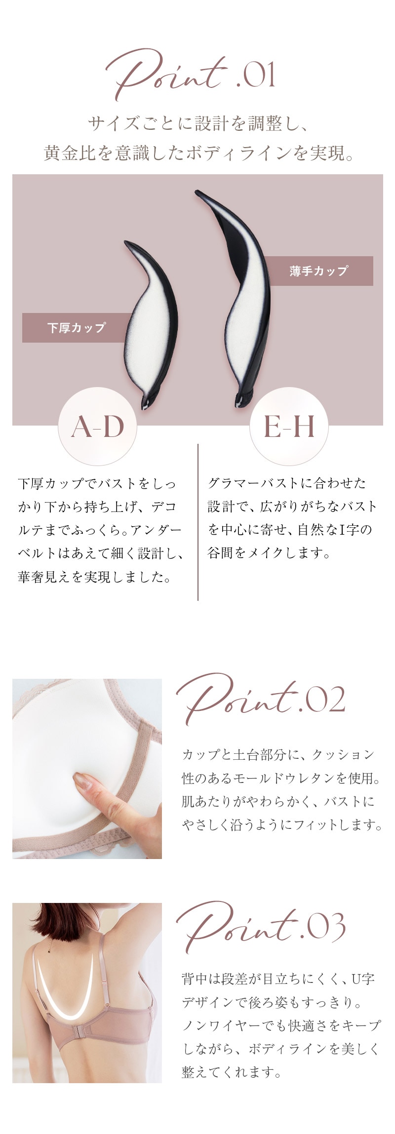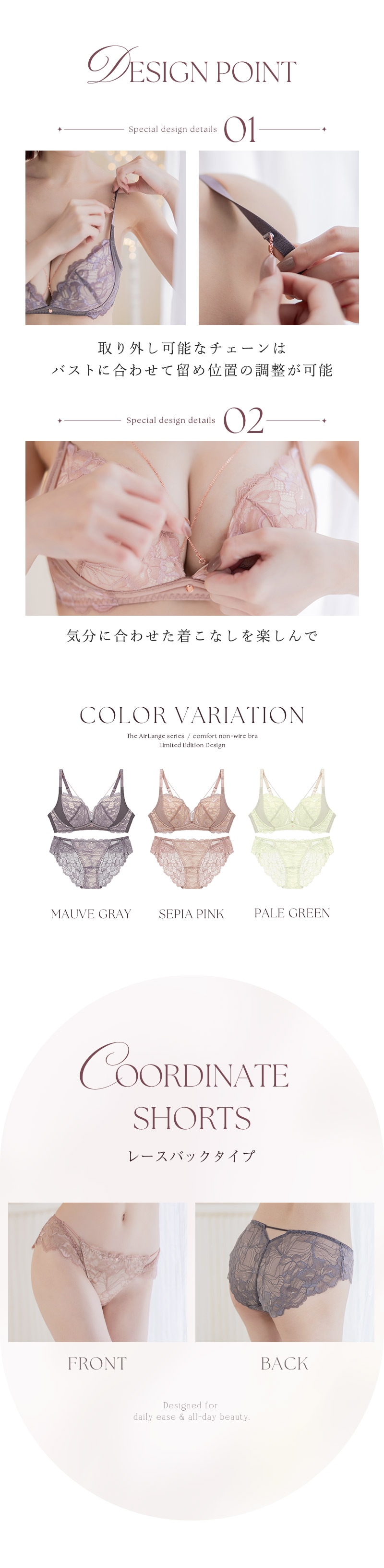 tu-hacci Bra&Shorts Collection ブラ&ショーツ / 計2点セット 軽い着け心地で、谷間メイクが叶う 極上ワイヤレスブラ~Air Lange(エアランジュ)シリーズ~ ホリデー気分をより一層高めてくれる限定デザイン 《エアランジュ》ルリアンブラ&ショーツ ノンワイヤーで楽な着け心地なのに、きちんとスタイルアップ。 サイズごとにカップ設計を調整し、黄金比を意識したボディラインを実現します。 飾らなくても、無理しなくてもちゃんとキレイ。 新時代のワイヤレスブラシリーズです。 【こんな方におすすめ】 ・ノンワイヤーでも、スタイルアップを叶えたい方 ・自然な高さのあるバストメイクをしたい方 ・ストレスフリーな下着を探している方 ■軽い着け心地でノンストレスにスタイルUP ・バストの広がりを抑え、中央に寄せる設計でふっくら谷間メイク ・サイズに合わせたカップ設計で、バストの黄金比を実現 ・肌面がなめらかな独自のカップ台でストレスフリー ・段差が目立ちにくいU字バックデザイン ■こだわりのデザイン 大花が映える華やかなデザイン 取り外し可能なチェーンは、バストに合わせて留め位置の調整が可能 気分に合わせた着こなしを楽しんで ■ショーツは華やかなレースバックタイプ 上品な透け感でヒップを彩る一着 |