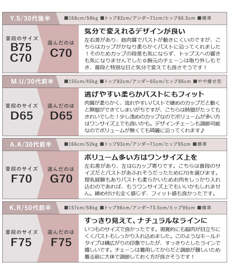 A70/ショーツM A75/ショーツM A75/ショーツL B65/ショーツM B70/ショーツM B75/ショーツM B75/ショーツL B80/ショーツL C65/ショーツM C70/ショーツM C75/ショーツM C75/ショーツL C80/ショーツL D65/ショーツM D70/ショーツM D75/ショーツM D75/ショーツL D80/ショーツL ※一部のカップでショーツサイズがお選びいただけます。 上記以外の組み合わせはお選びいただけませんのでご了承ください。 |