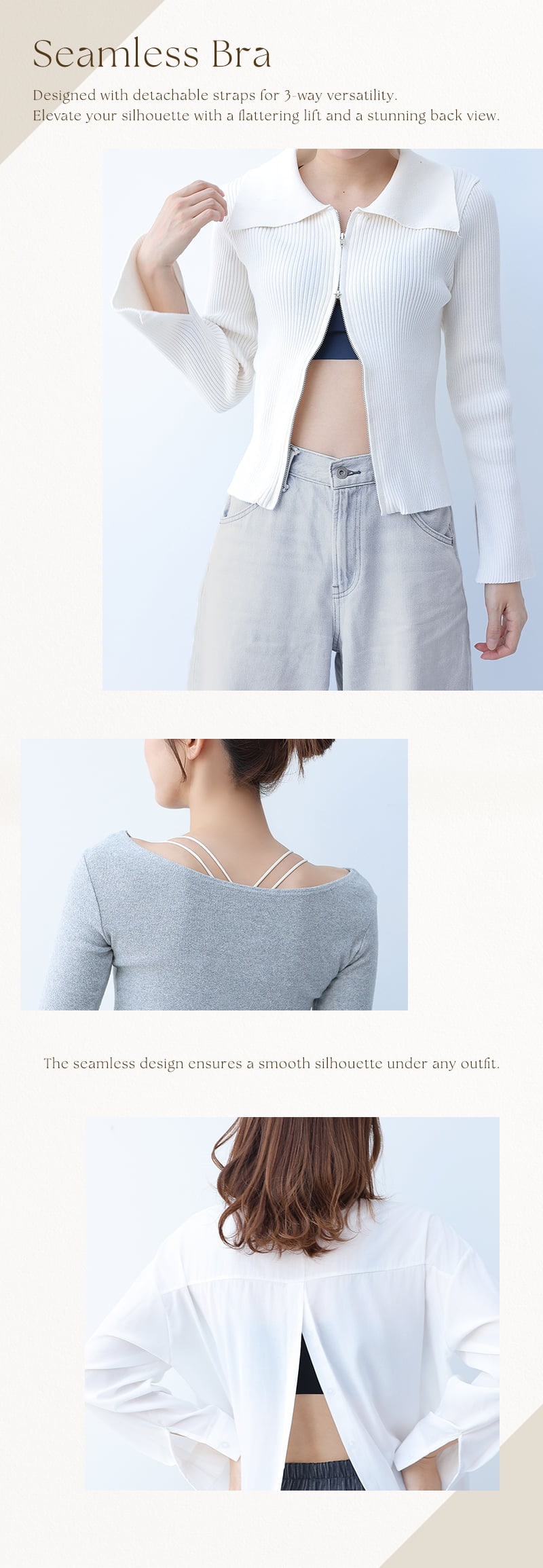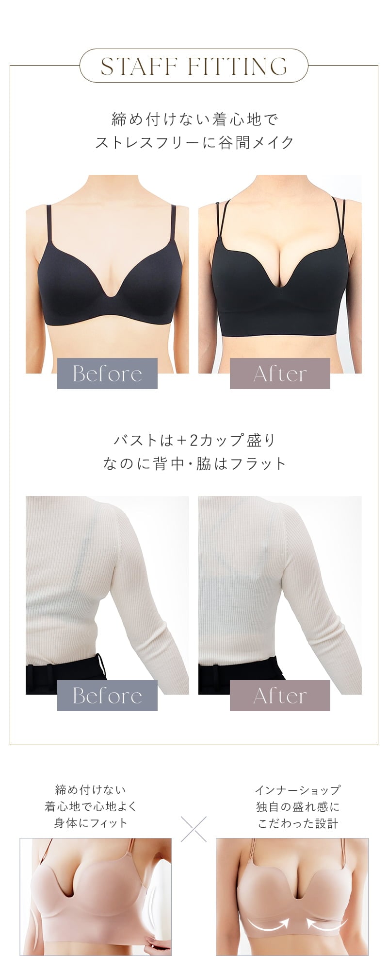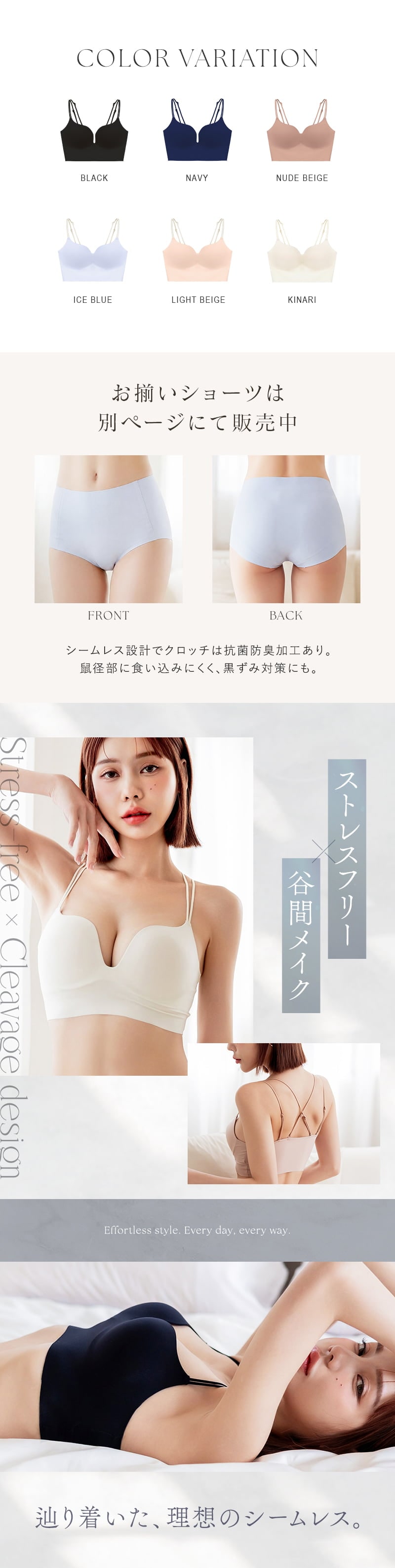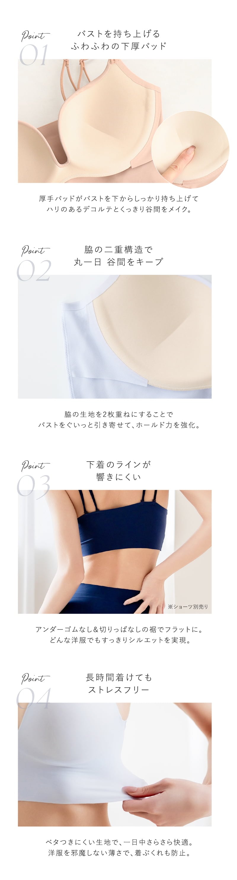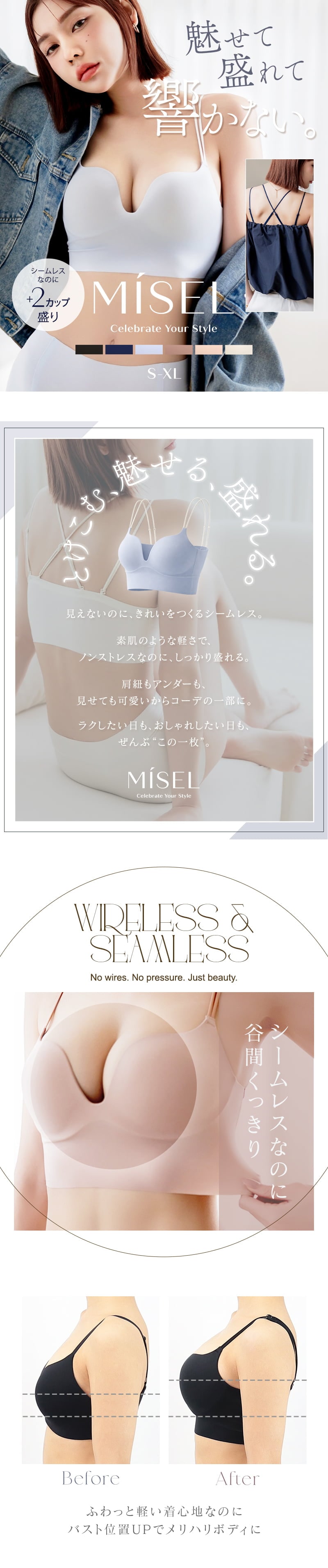 tu-hacci Bra Collection ブラ単品 とけこむ、魅せる、盛れる。 ── “着けてる”を忘れる、魅せるシームレス。 ひびかないブラ MiSEL-ミセル- シームレス ノンワイヤーブラ 【こんな方におすすめ】 ・ワイヤーの締め付けや圧迫感が苦手な方 ・下着のラインや、脇肉の段差が気になる方 ・楽な着心地が好きだけど、理想の谷間も叶えたい方 ■インナーショップ独自の「美胸メイク」を追求 厚手パッドがバストを下から優しく押し上げ、ハリのあるデコルテとくっきりとした谷間を演出。 さらに脇部分の二重構造で、一日中美しいラインをキープ。 ■どんな洋服にも、すっきりとしたシルエットを アンダーゴムをなくし、裾を切りっぱなしにすることで極限までフラットに。 タイトなウェアを纏っても下着のラインが響かず、洗練された着こなしを実現。 ■見せてもオシャレ。自由を楽しむ3wayストラップ ストラップは背面での取り外しが可能。 ファッションや気分に合わせてアレンジして、後ろ姿まで抜かりないオシャレを楽しんで。 |